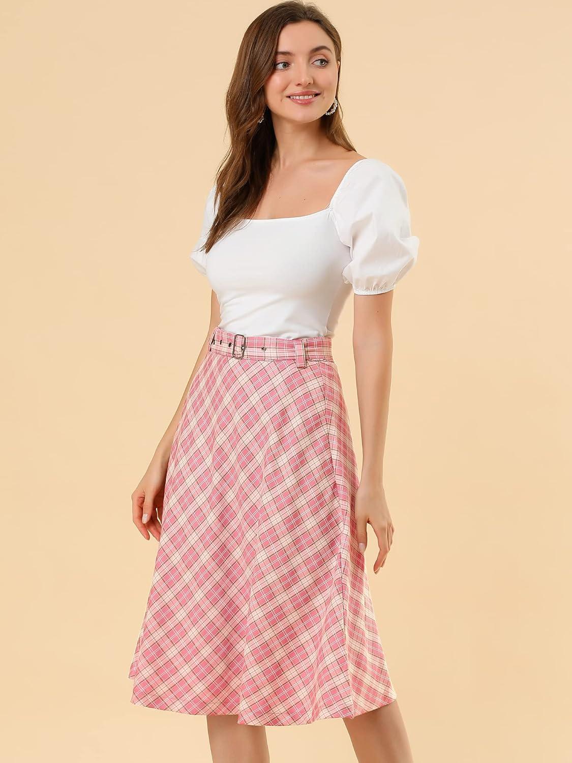 Allegra K Women's Tartan Plaid High Waist Belted Vintage A-Line Midi Skirt(Pink)