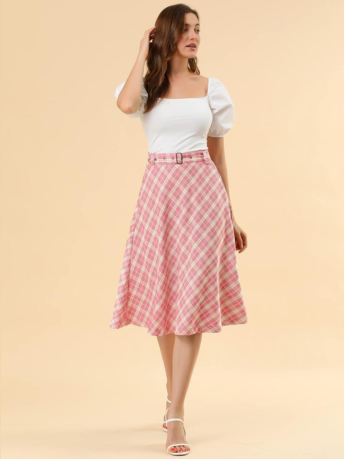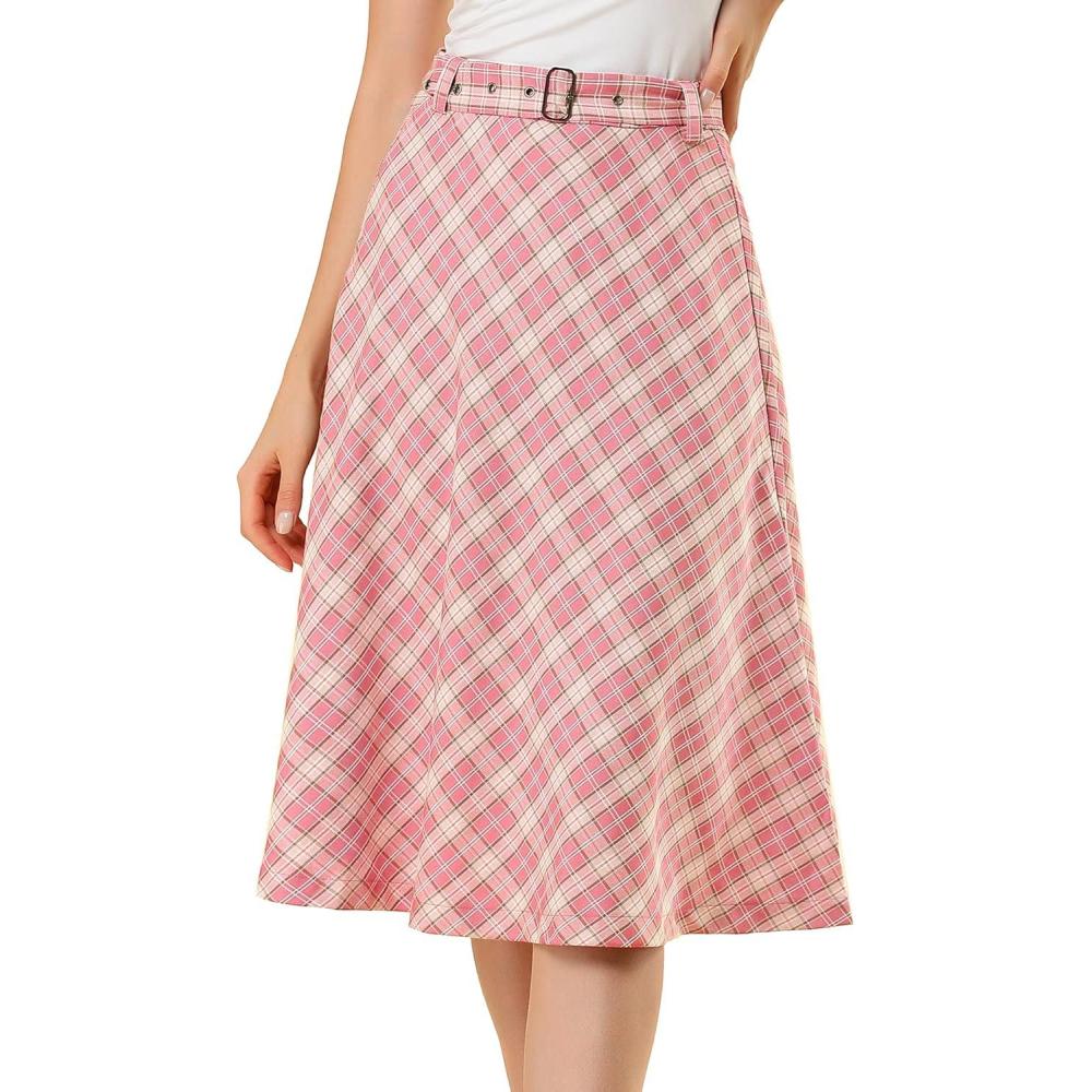 imageAllegra K Womens Tartan Plaid High Waist Belted Vintage ALine Midi SkirtPink