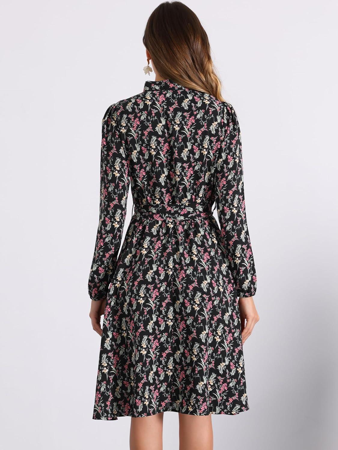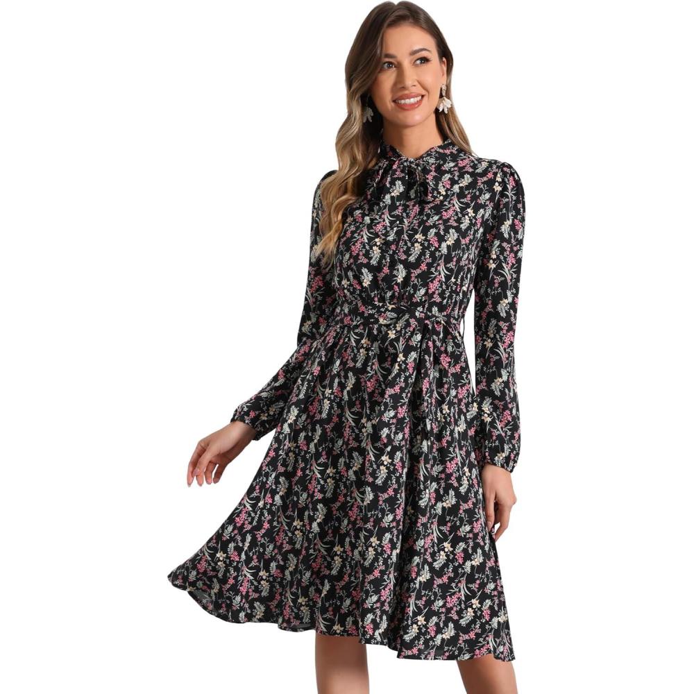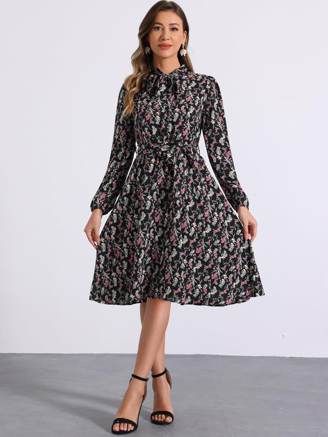 Allegra K Women’s Tie Neck Dresses Chiffon Long Sleeve Belted Vintage Floral Dress(Blacks)