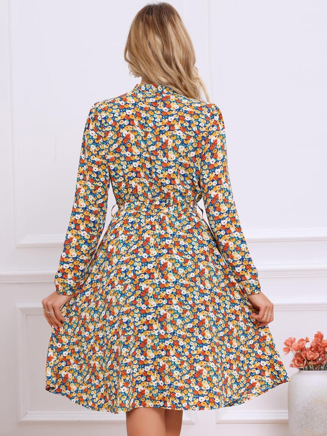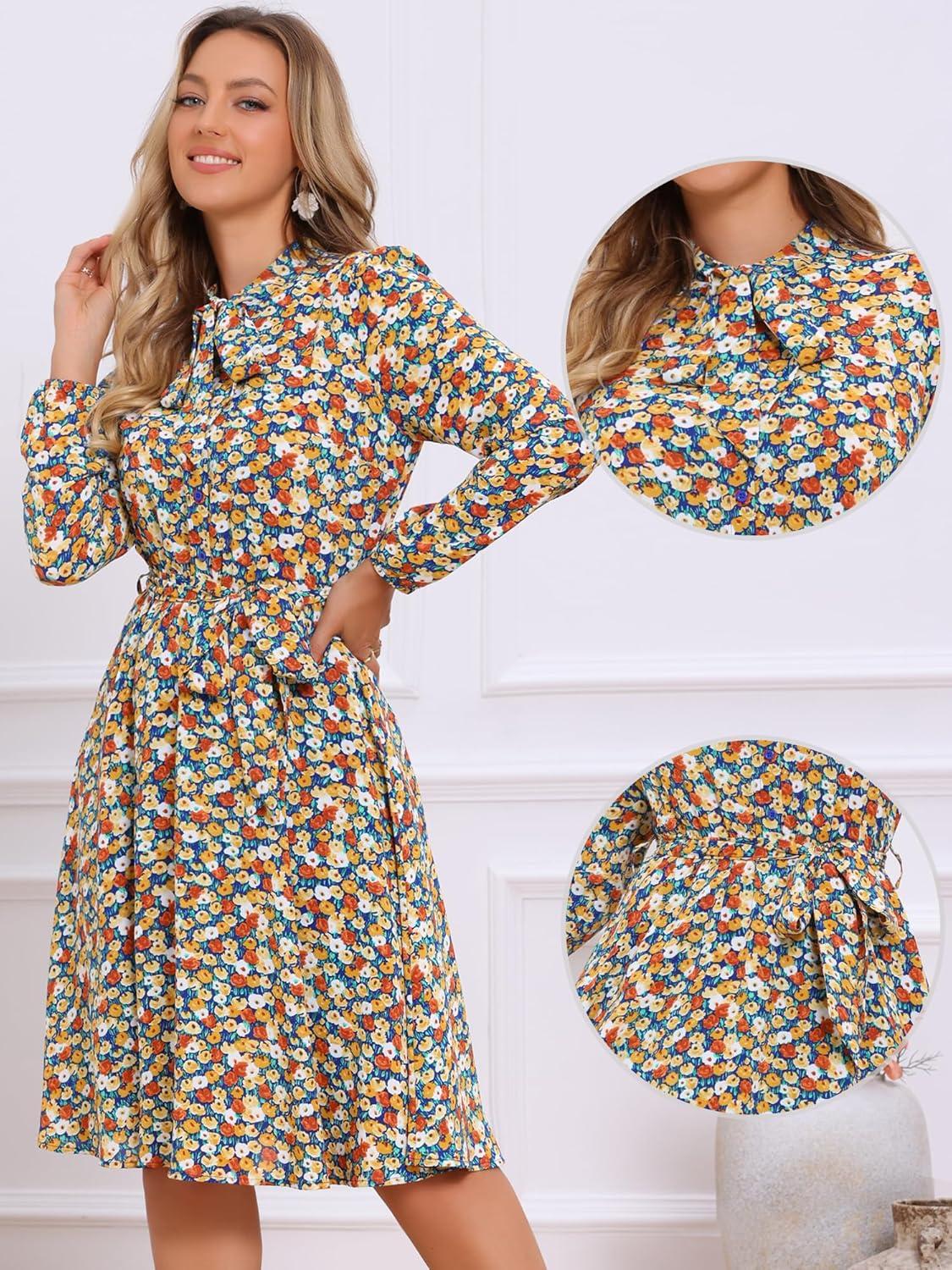 Allegra K Women’s Tie Neck Dresses Chiffon Long Sleeve Belted Vintage Floral Dress(Blue Yellow)