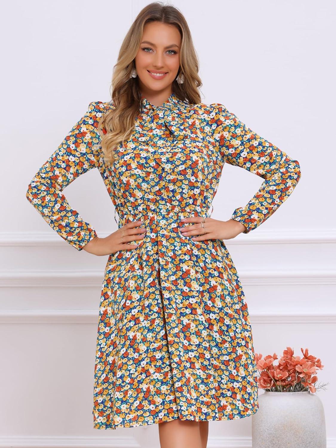 Allegra K Women's Tie Neck Dresses Chiffon Long Sleeve Belted Vintage Floral Dress(Blue Yellow)