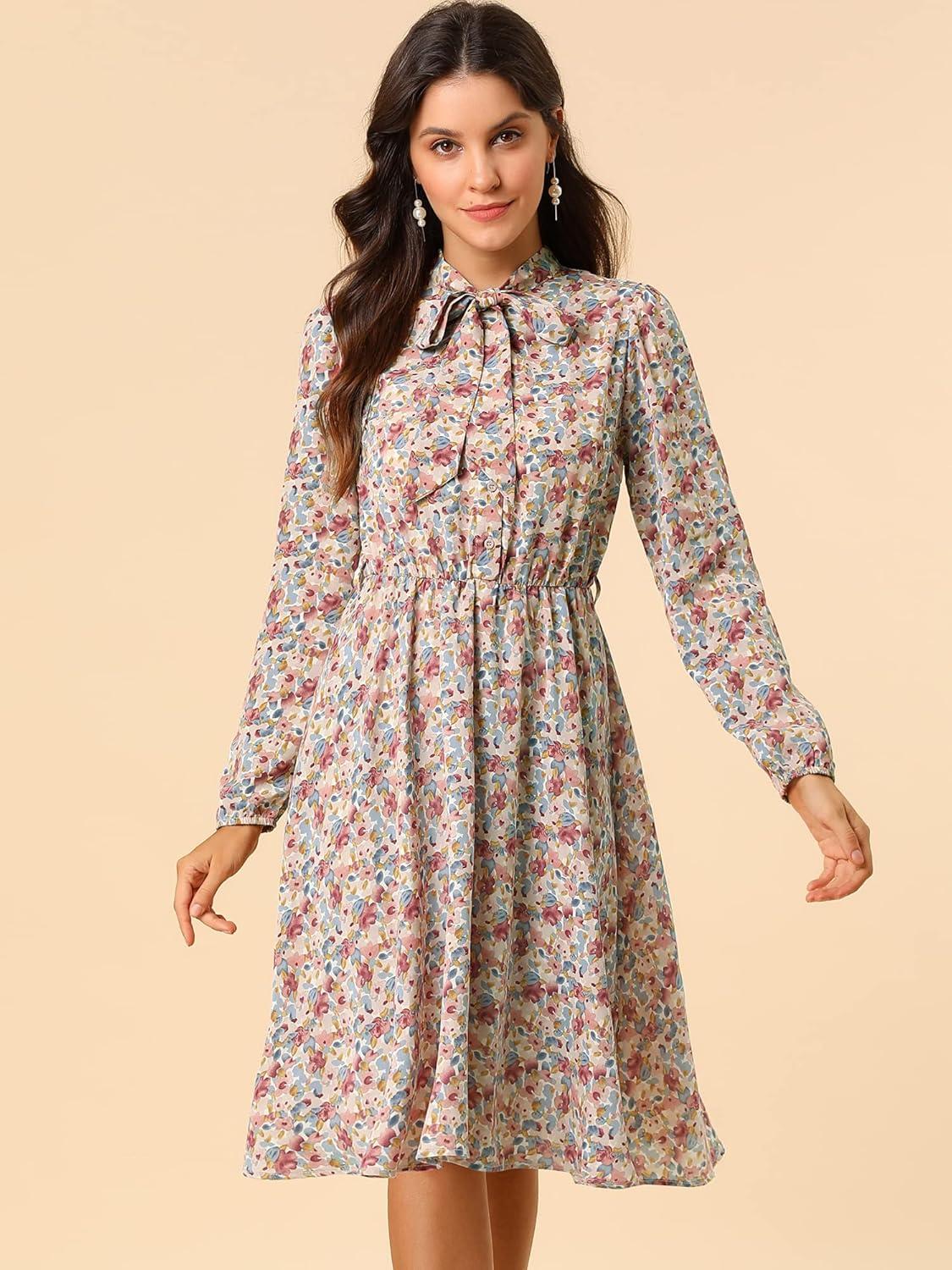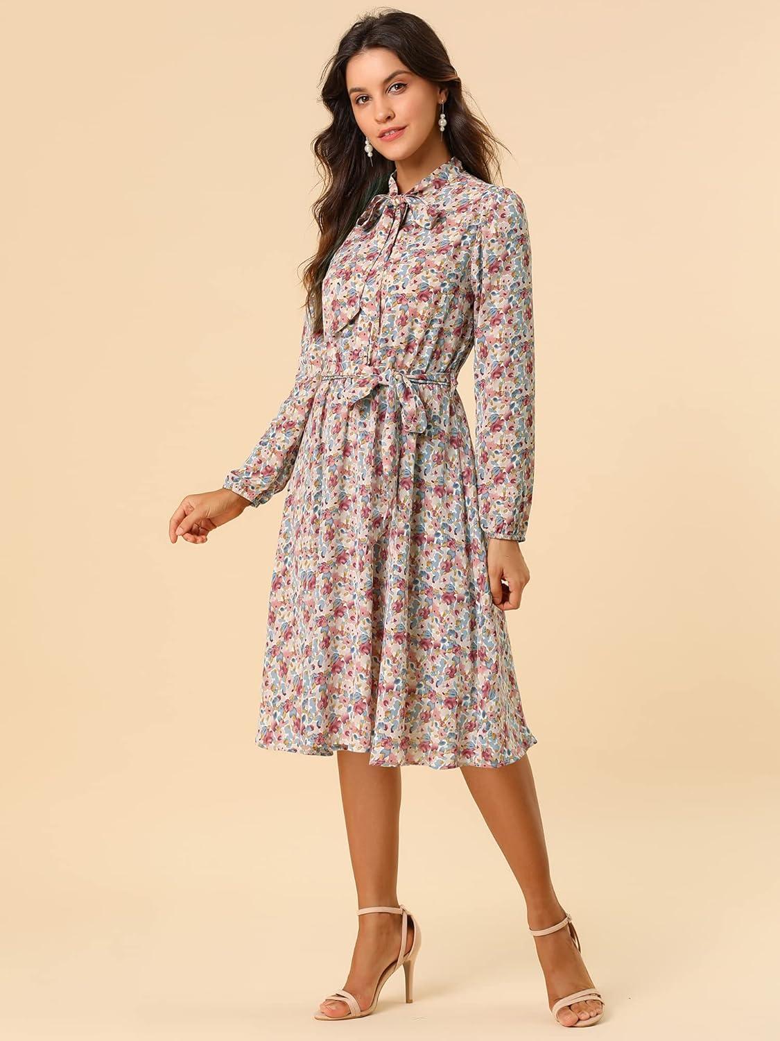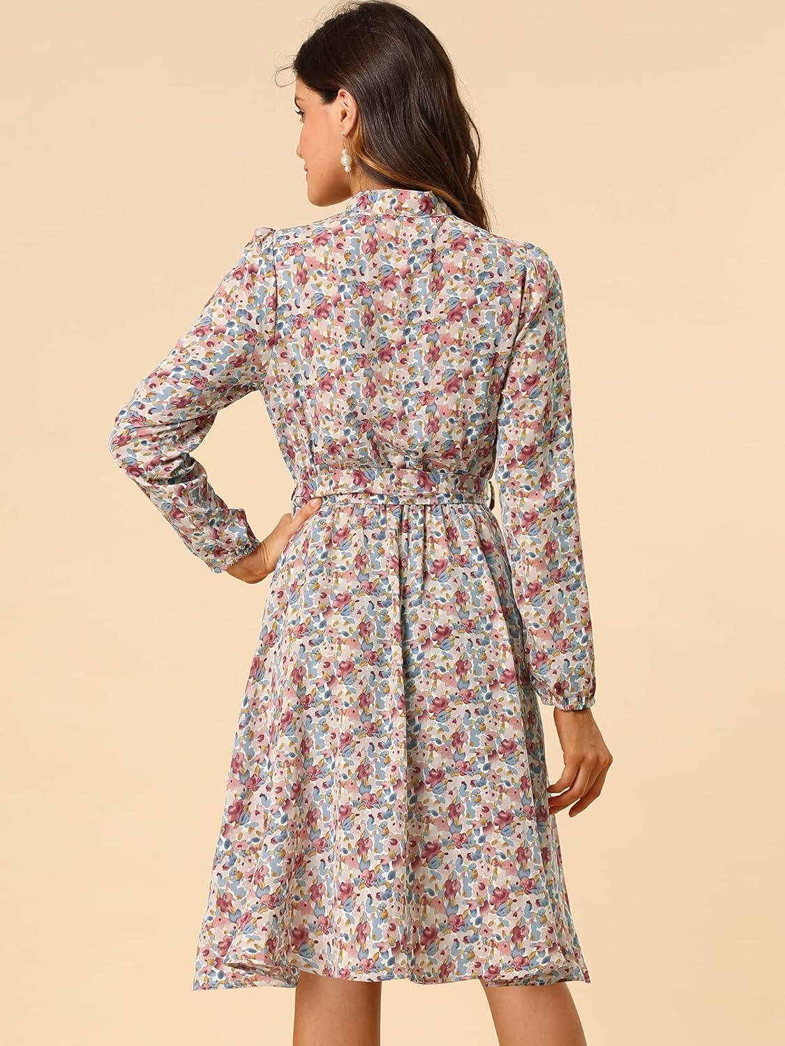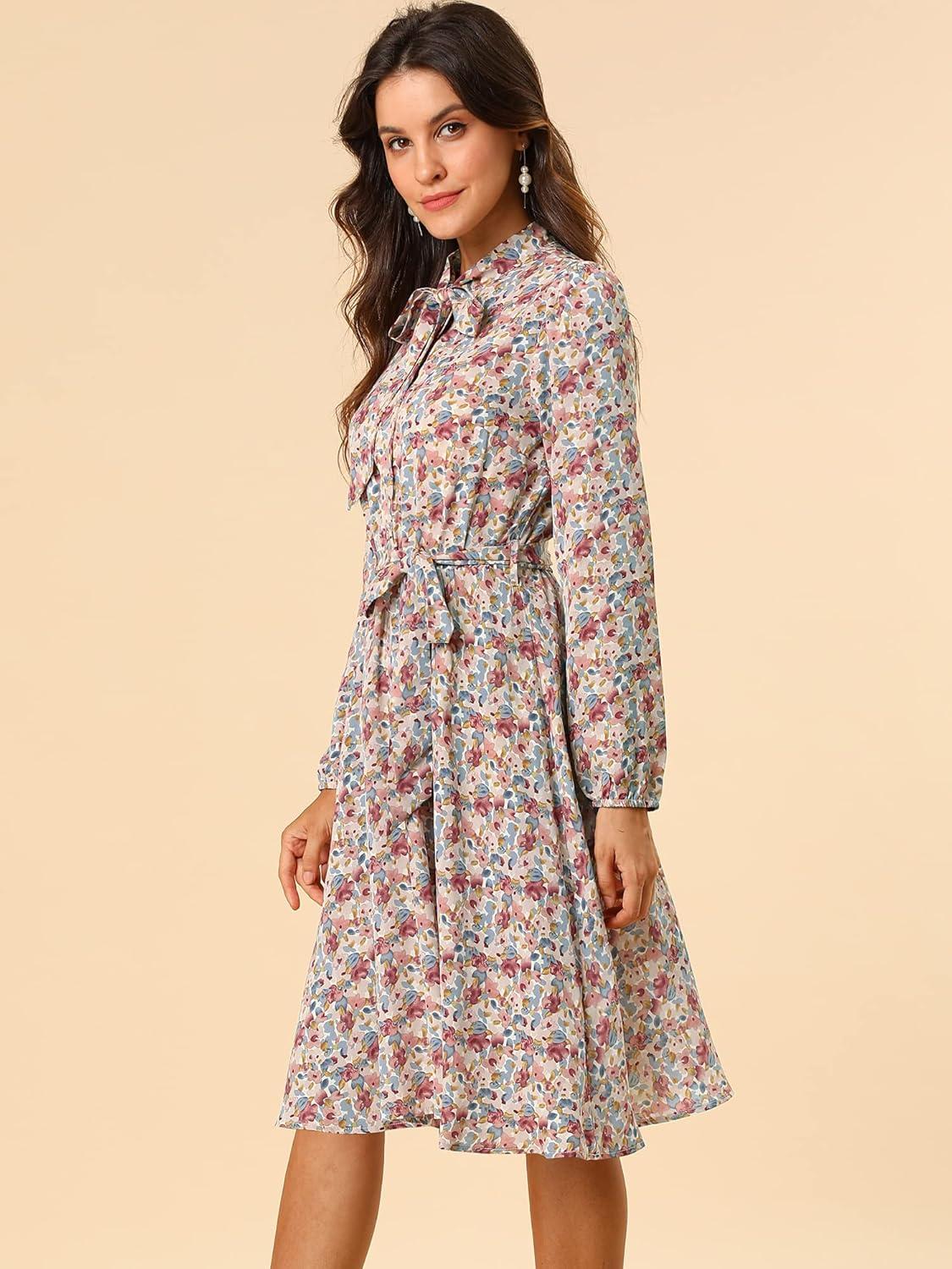Allegra K Women’s Tie Neck Dresses Chiffon Long Sleeve Belted Vintage Floral Dress(Purples)