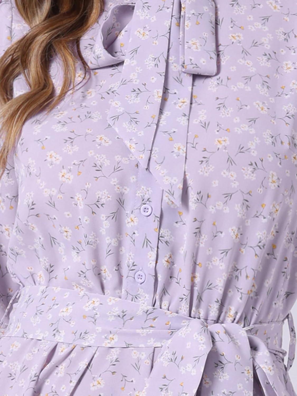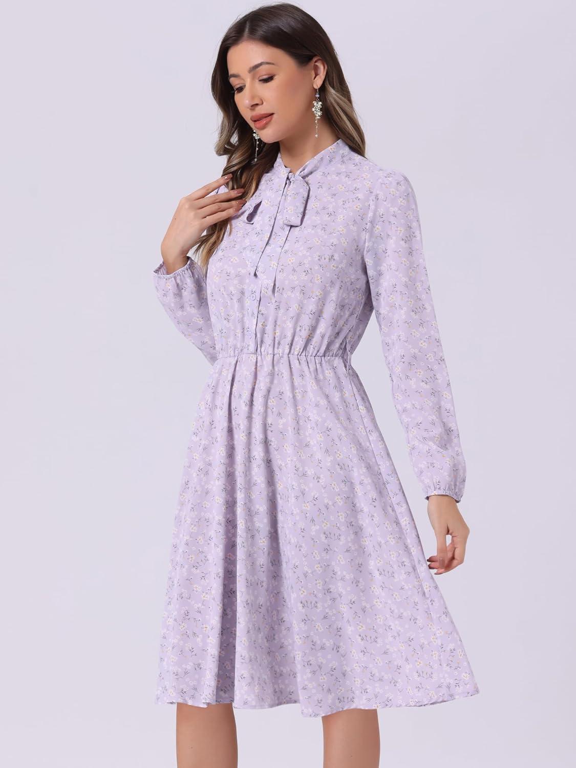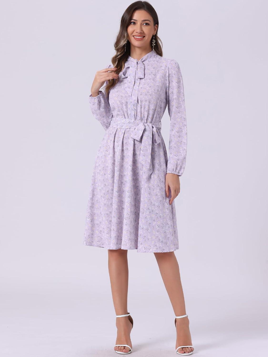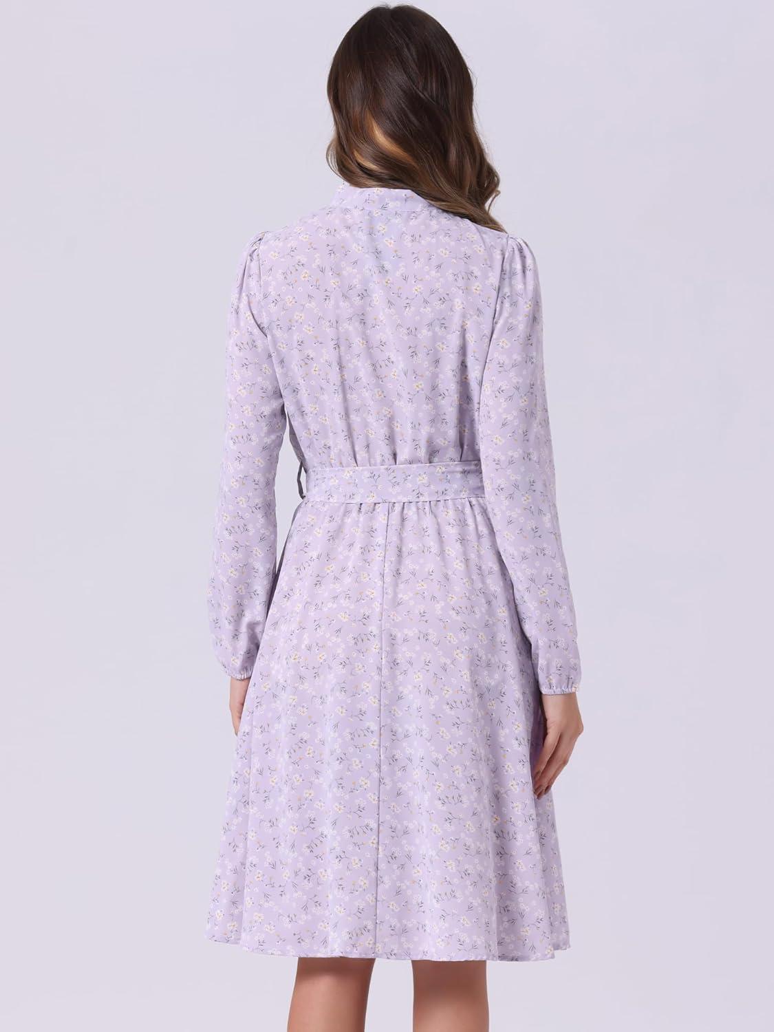 Allegra K Women’s Tie Neck Dresses Chiffon Long Sleeve Belted Vintage Floral Dress(Light Purple)