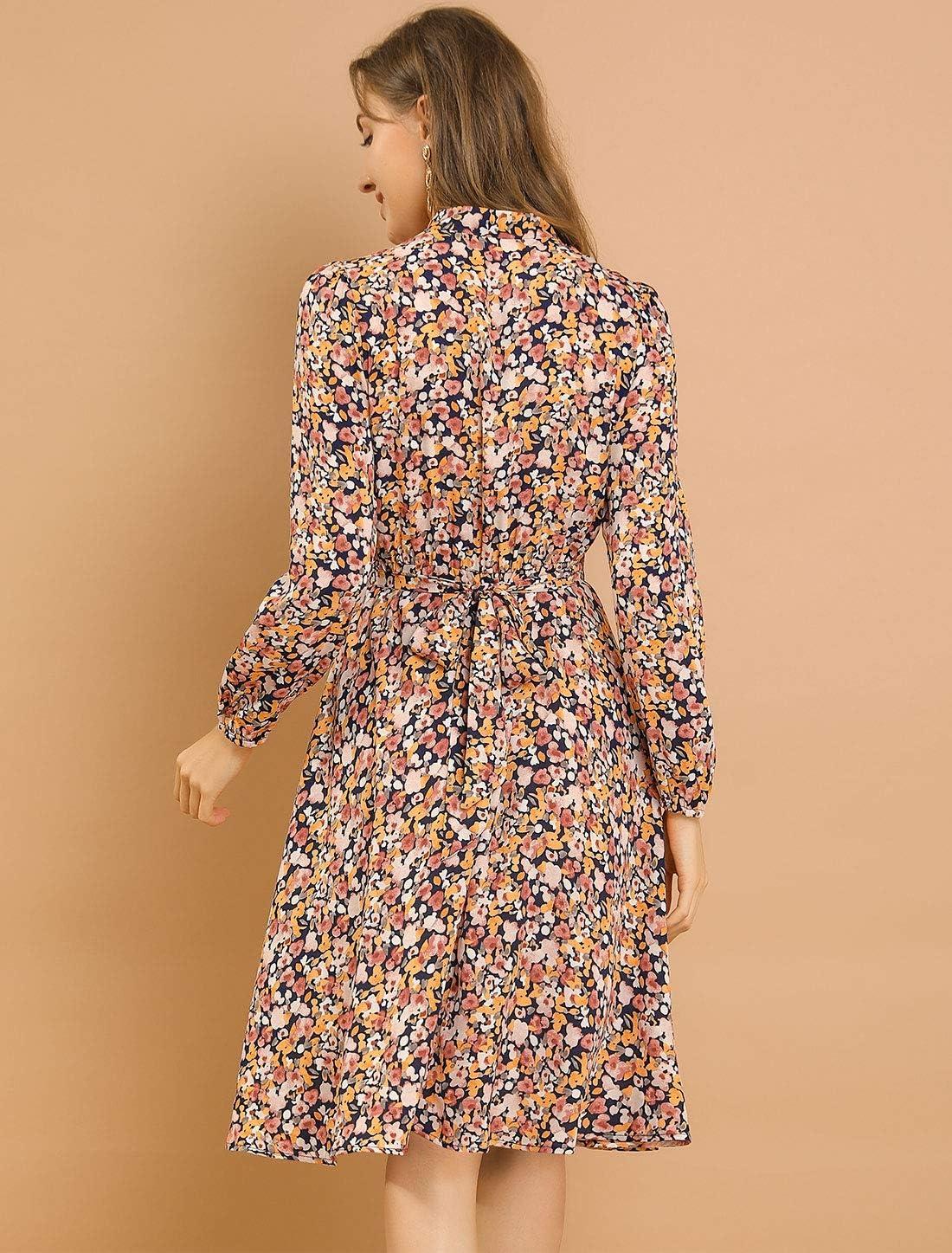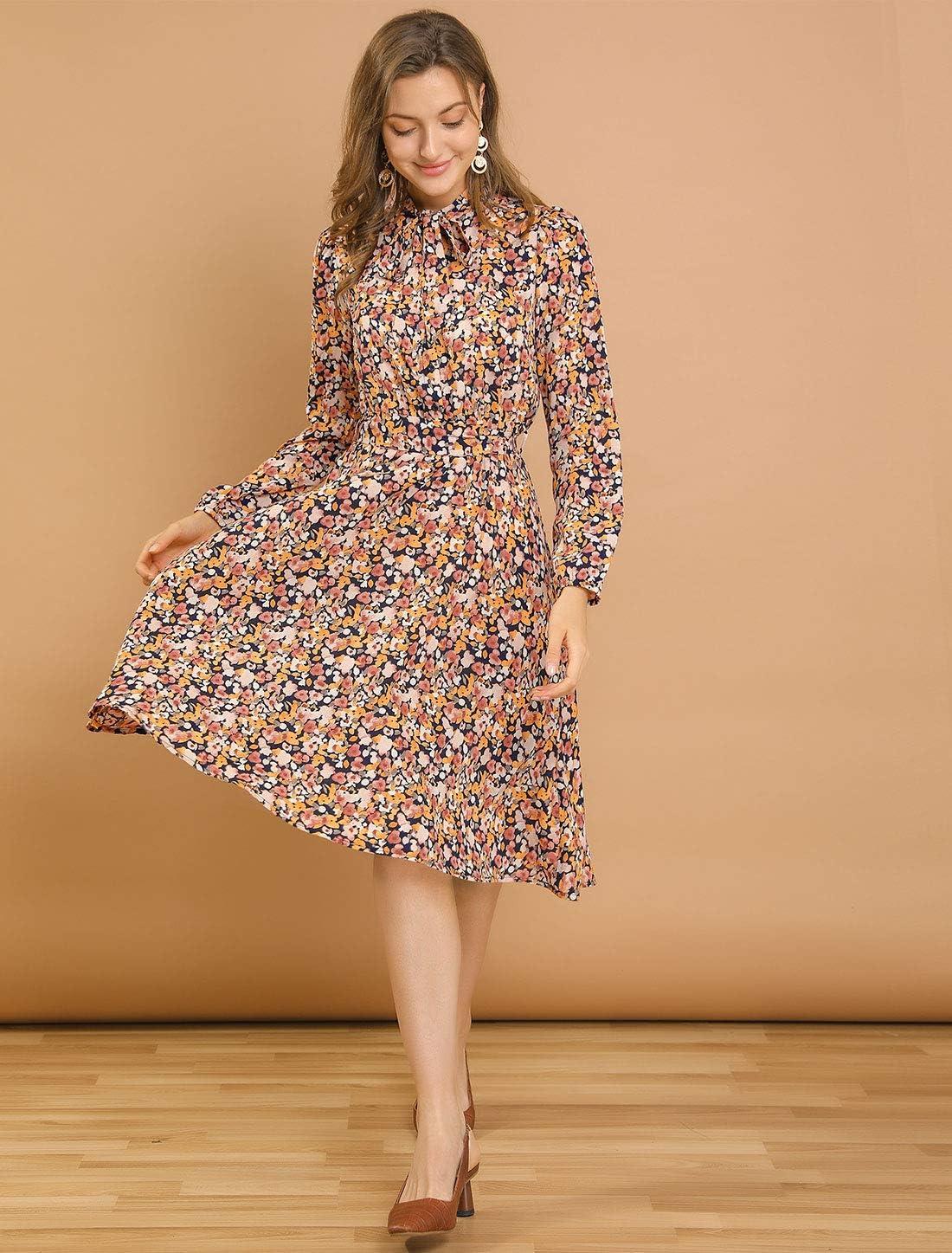 Allegra K Women’s Tie Neck Dresses Chiffon Long Sleeve Belted Vintage Floral Dress(Yellow)