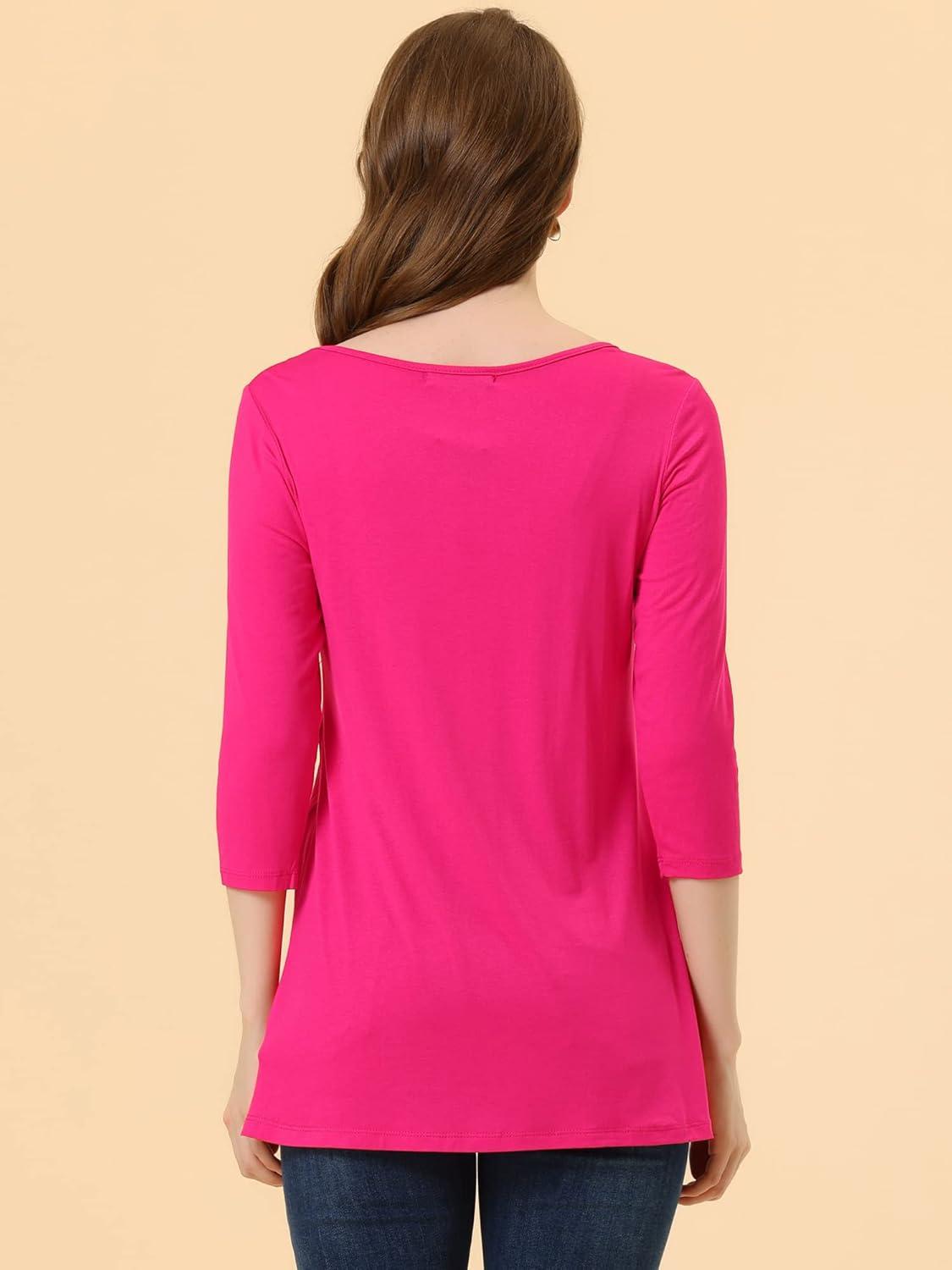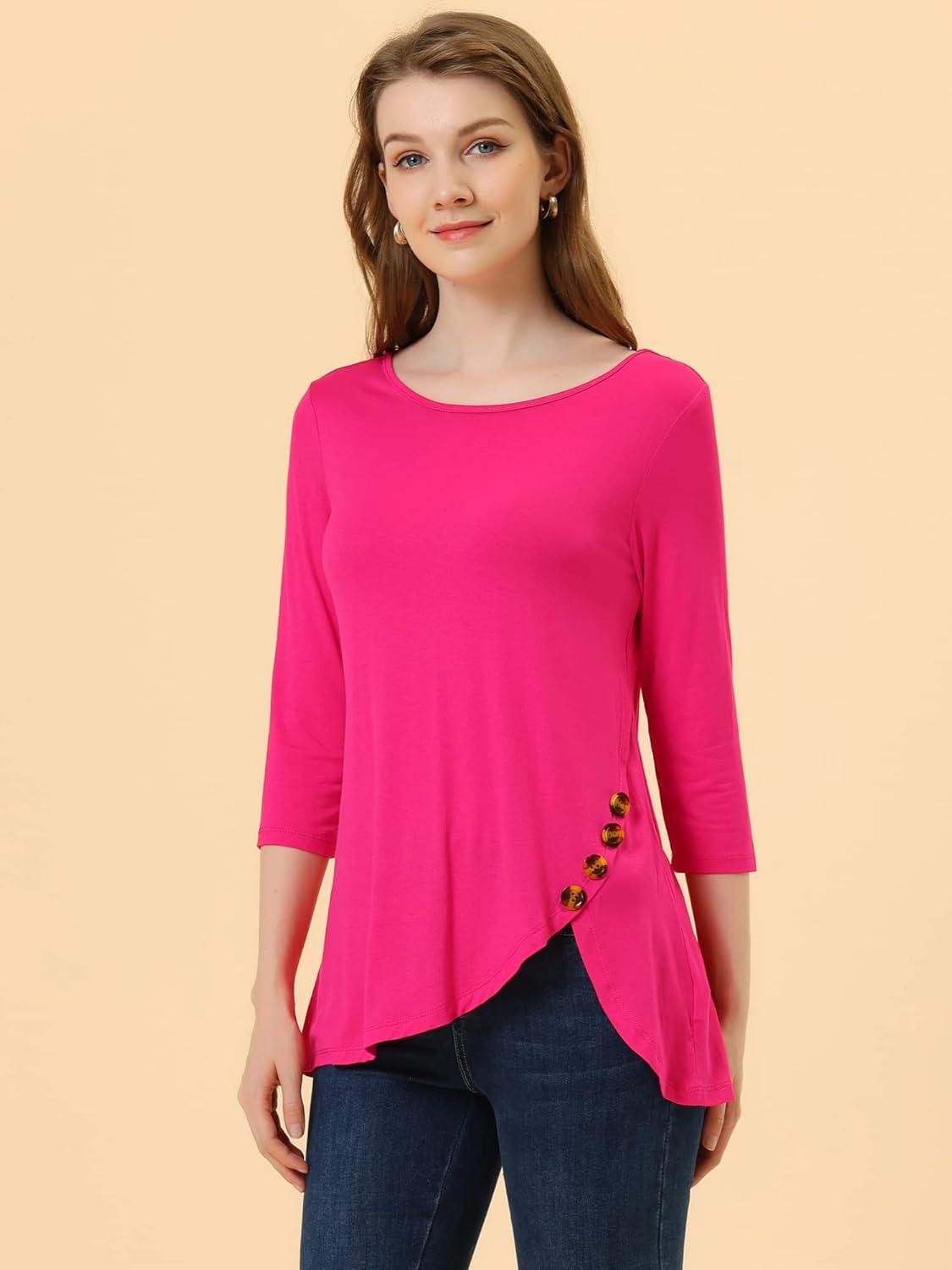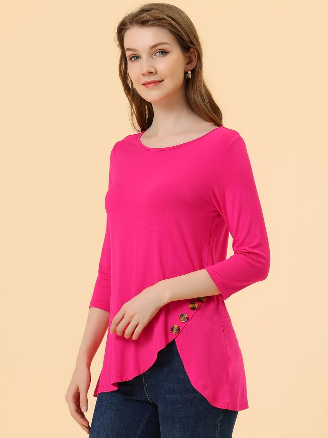 Allegra K Women's Tunic Tops Loose Fit Dressy High Low Round Neck 2025 Fall 3/4 Sleeve Long Shirt(Hot Pink)