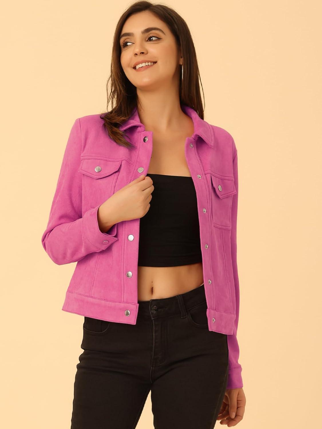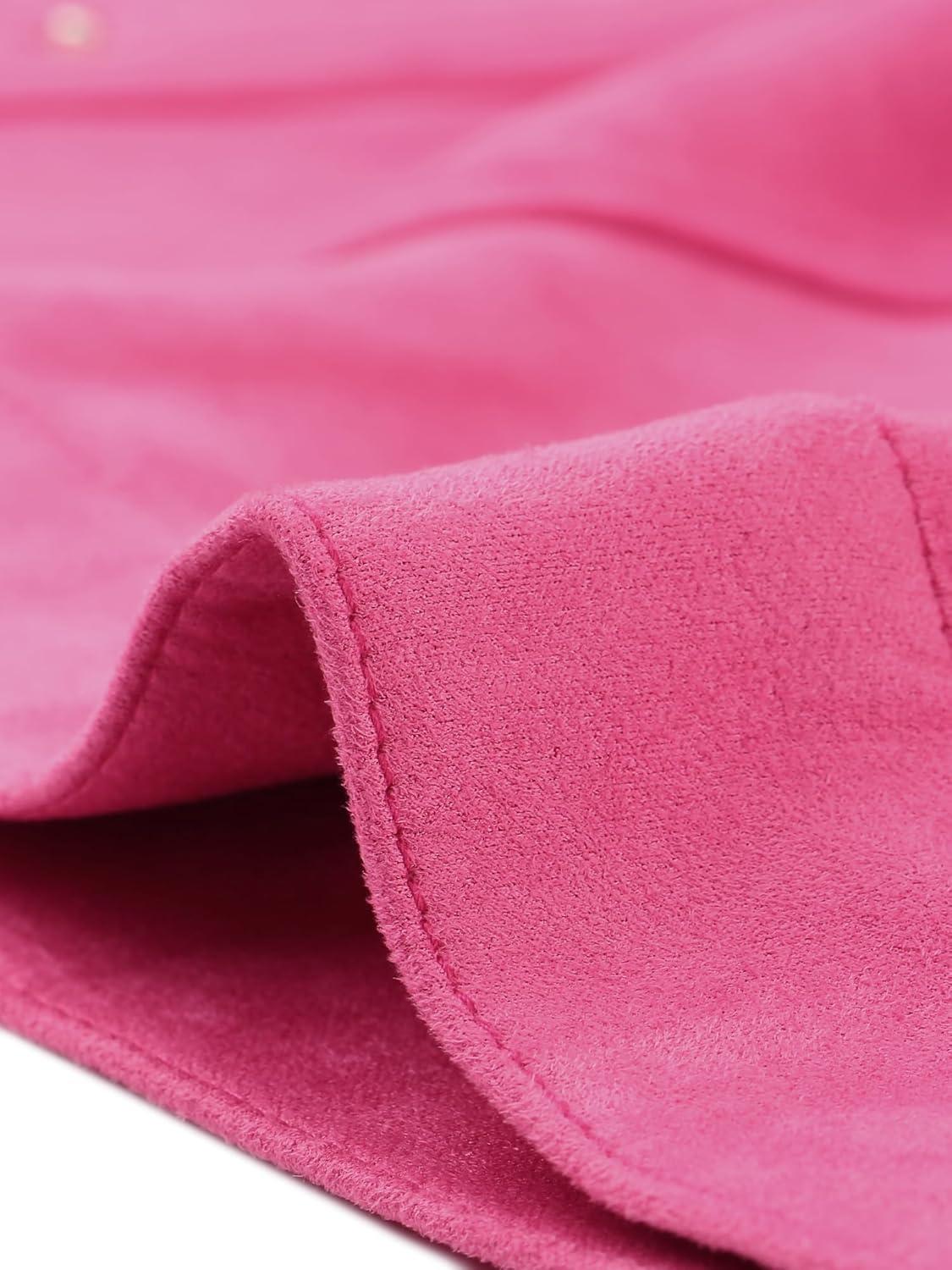 Allegra K Women’s Turn-Down Collar Flap Pockets Snap Button Faux Suede Jacket(Hot Pink)