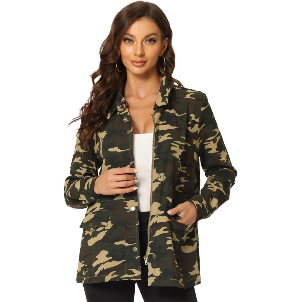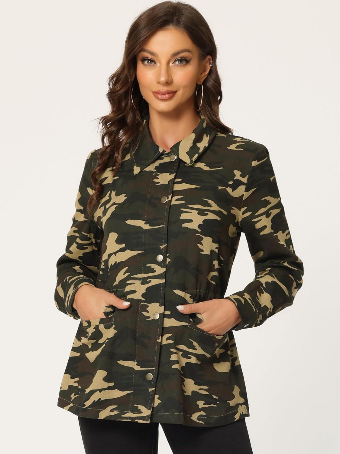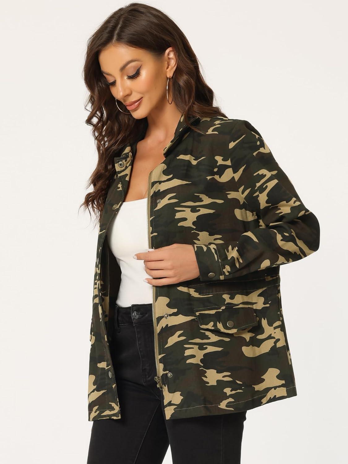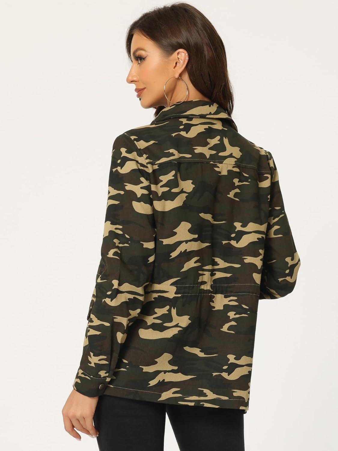 Allegra K Women’s Utility Jacket Zip Up Drawstring Waist Snap Buttons Lightweight Anorak Jackets with Pockets(Camouflage)