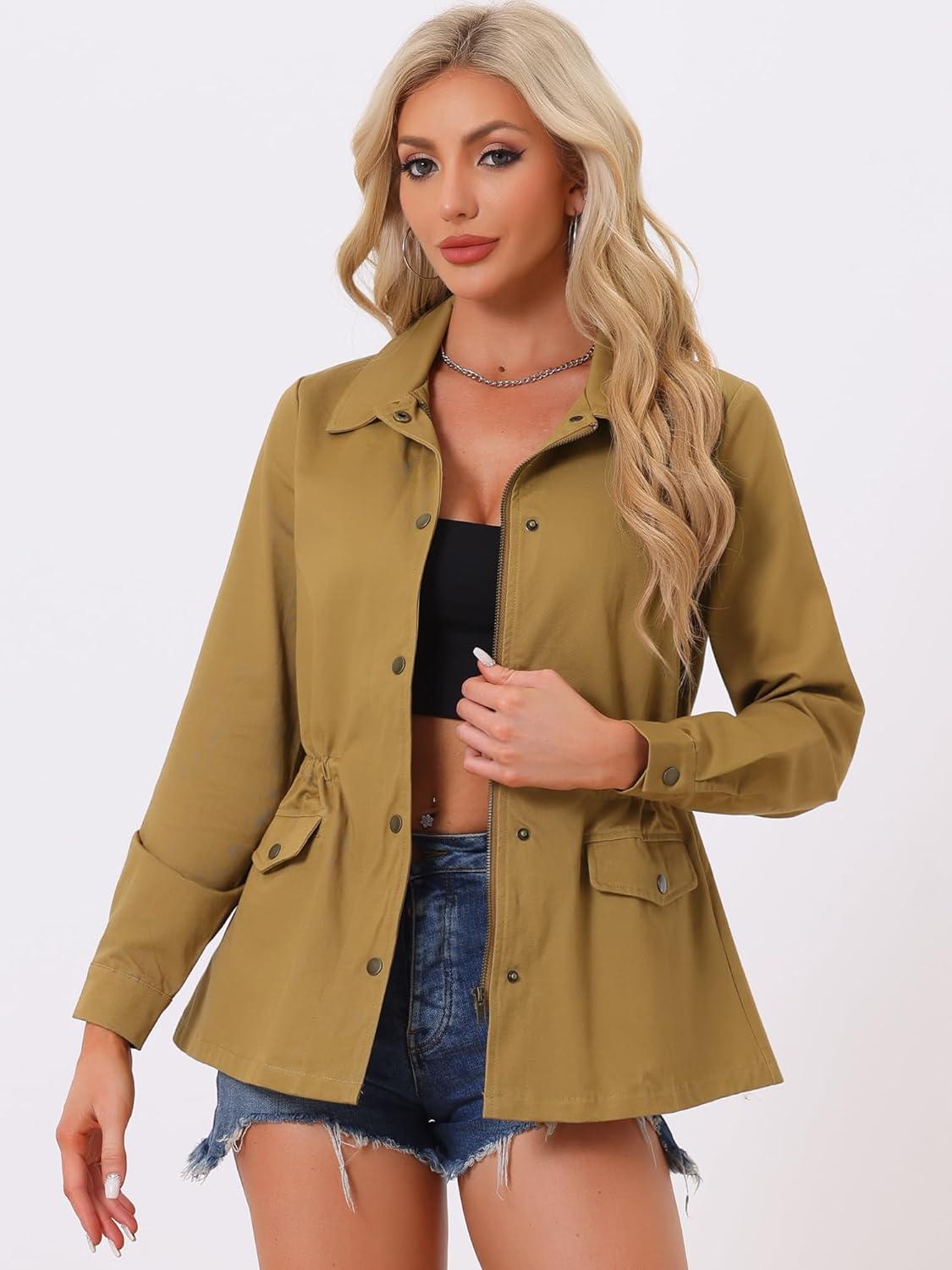 Allegra K Women’s Utility Jacket Zip Up Drawstring Waist Snap Buttons Lightweight Anorak Jackets with Pockets(Dark Khaki)