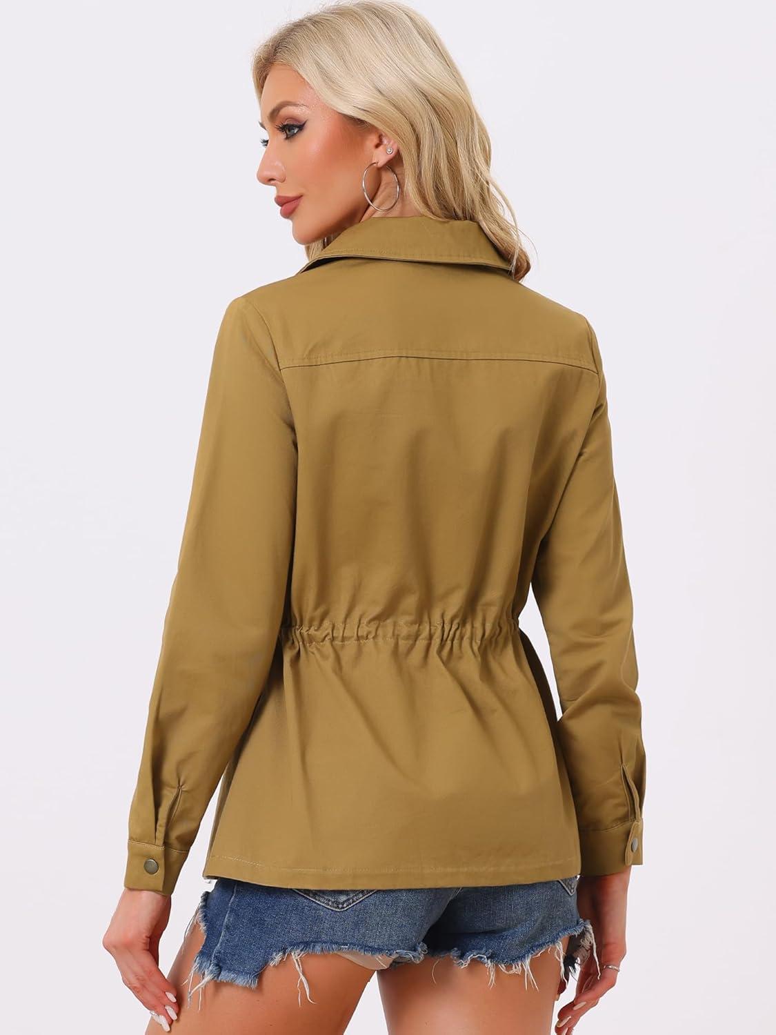 Allegra K Women's Utility Jacket Zip Up Drawstring Waist Snap Buttons Lightweight Anorak Jackets with Pockets(Dark Khaki)