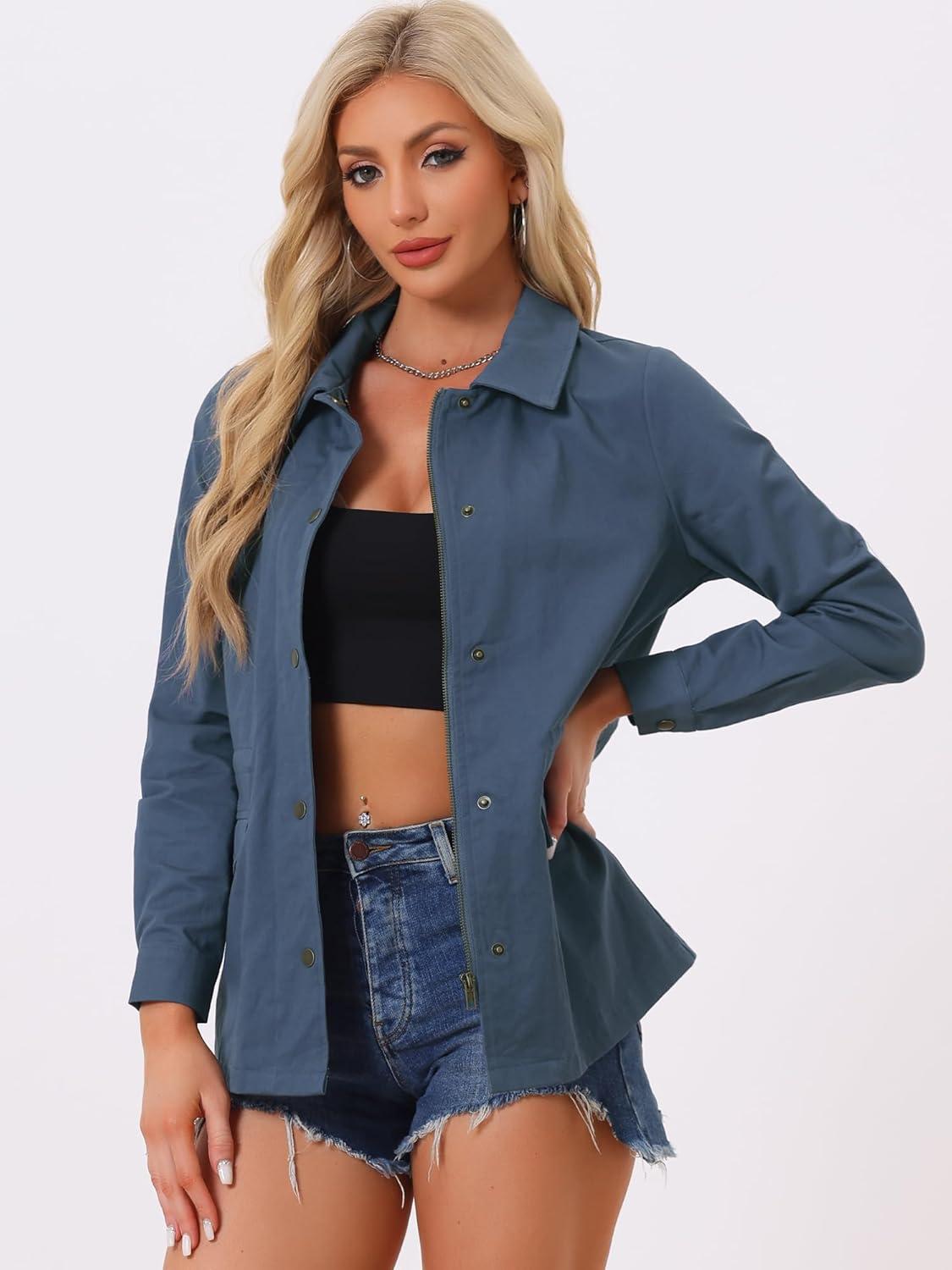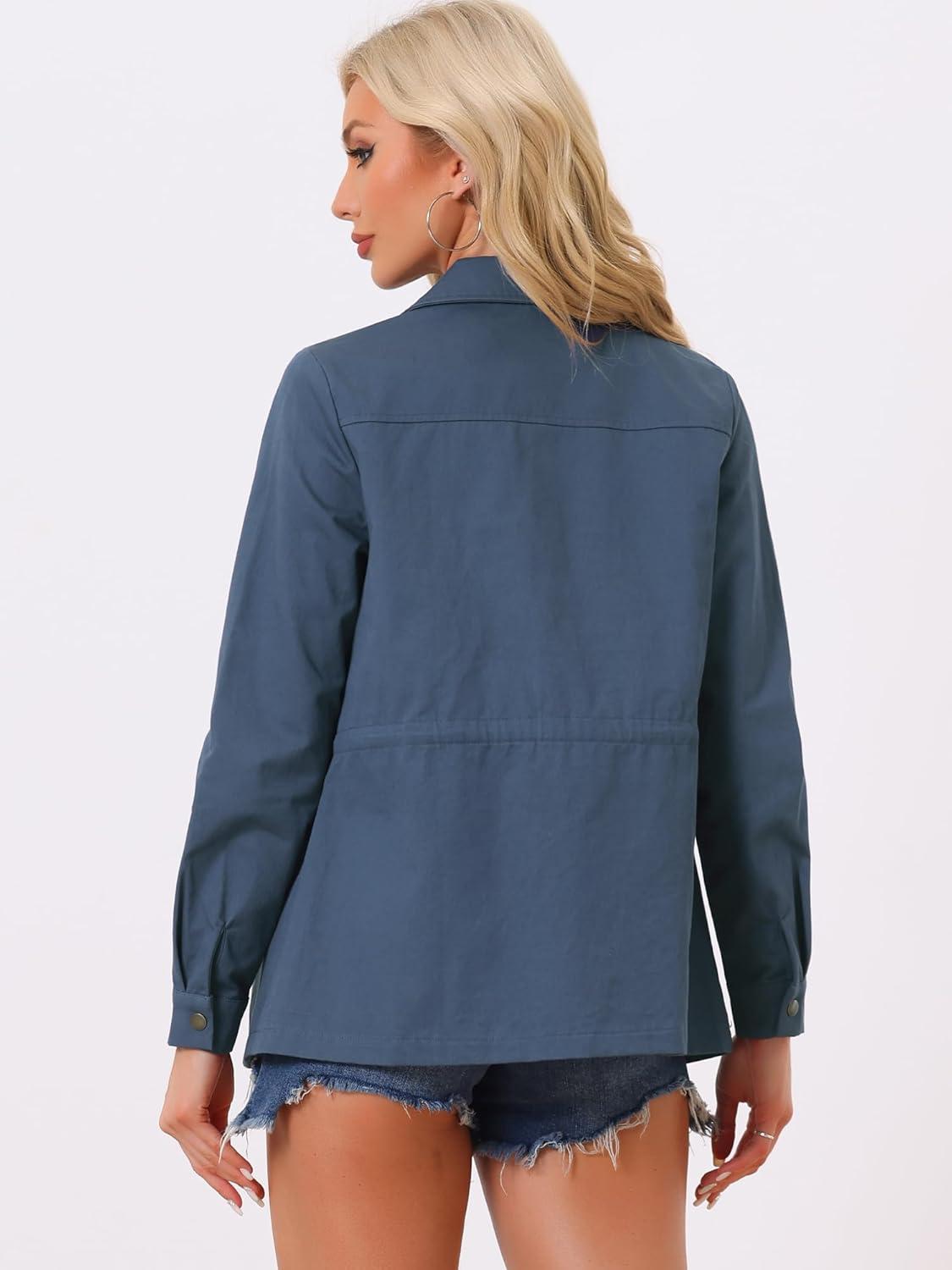 Allegra K Women's Utility Jacket Zip Up Drawstring Waist Snap Buttons Lightweight Anorak Jackets with Pockets(Deep Gray Blue)
