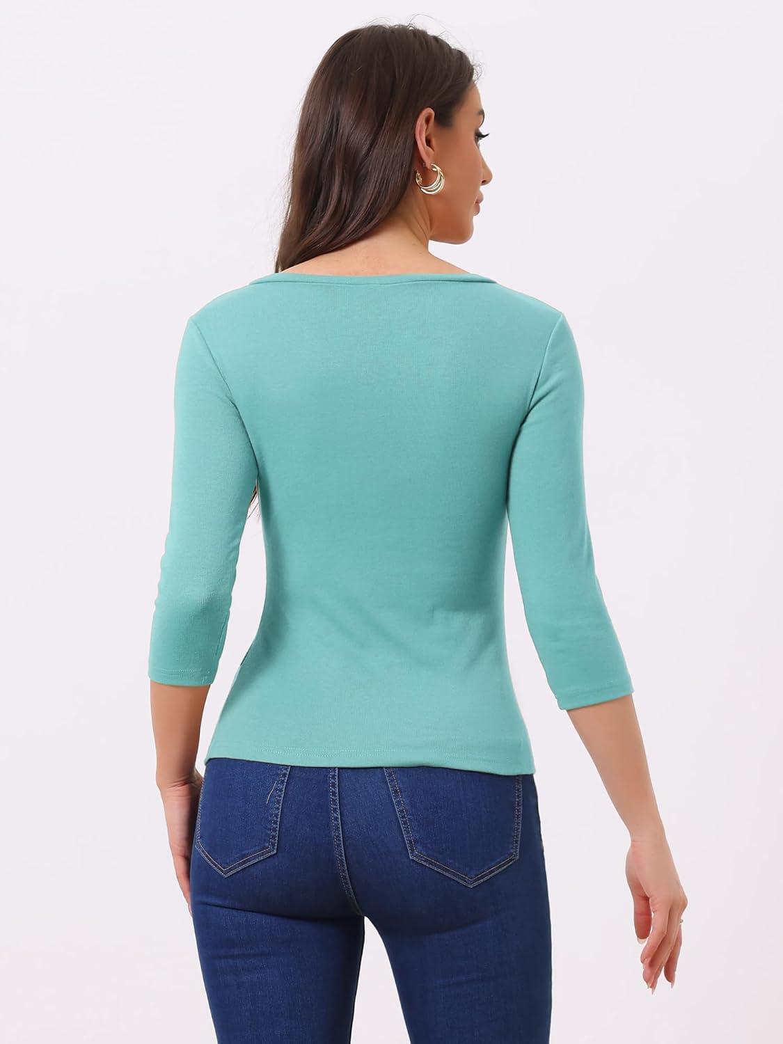 Allegra K Women’s V Neck Blouse 3/4 Sleeves Solid Knitted Buttons Decor Ruched Top(Dark Cyan)