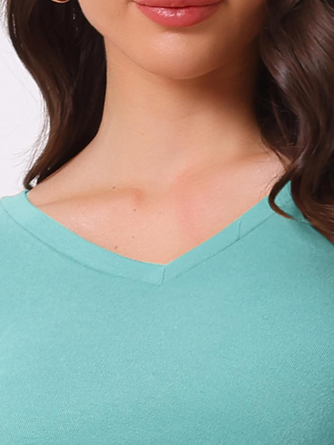 imageAllegra K Womens V Neck Blouse 34 Sleeves Solid Knitted Buttons Decor Ruched TopDark Cyan