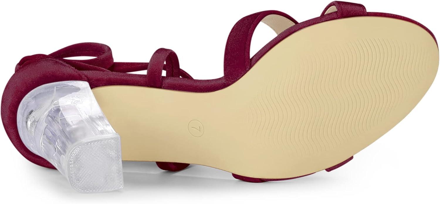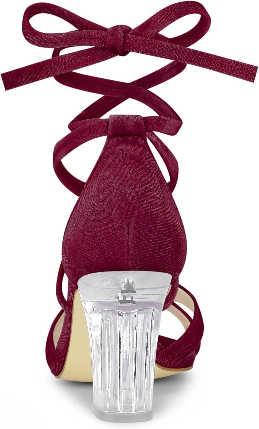 Allegra K Women's Velvet Lace Up Clear Heels Block Heel Sandals(Burgundy)