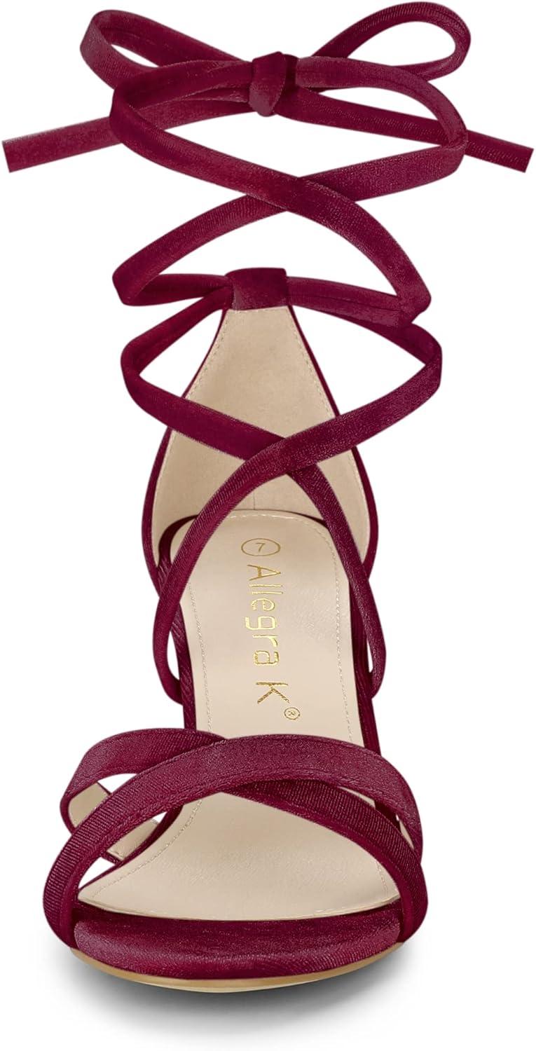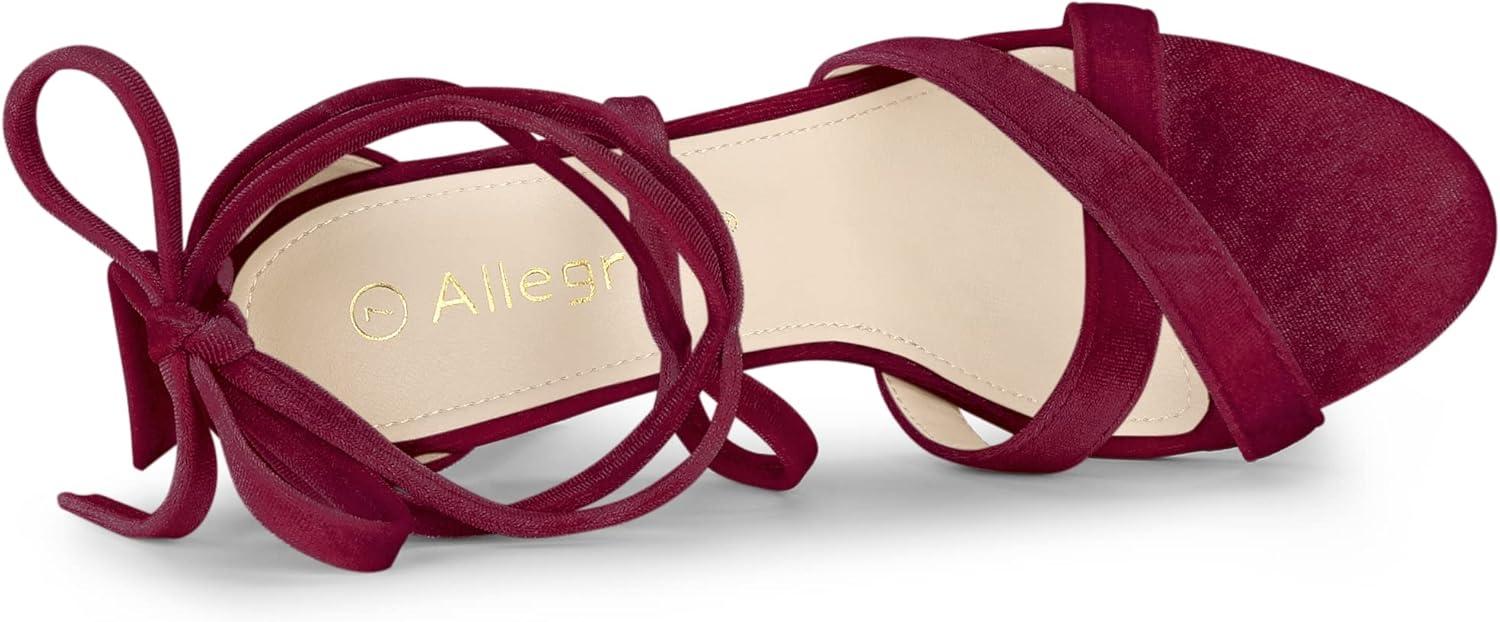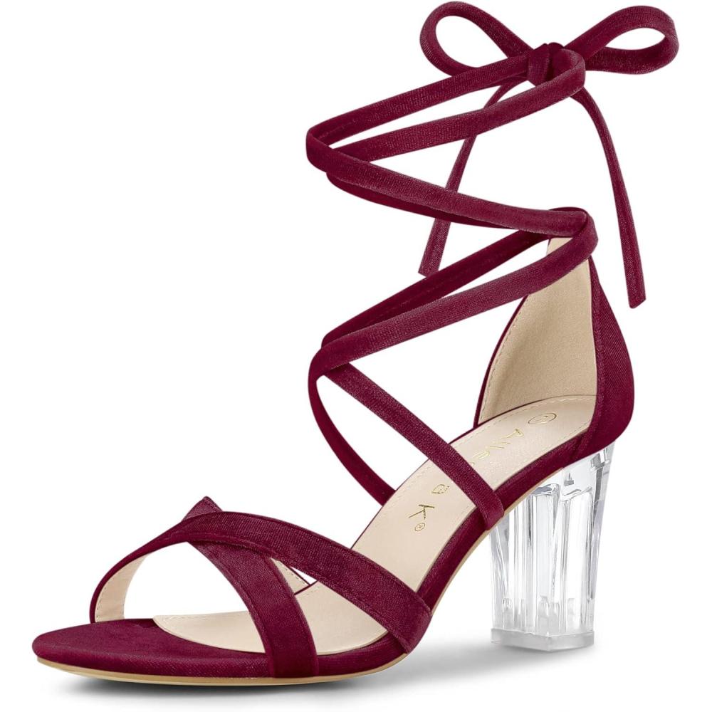 Allegra K Women’s Velvet Lace Up Clear Heels Block Heel Sandals(Burgundy)