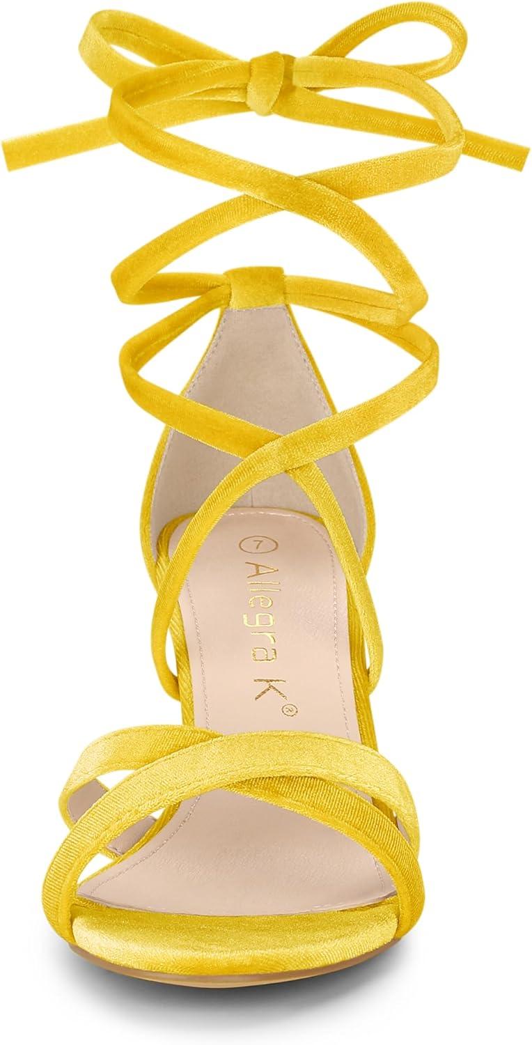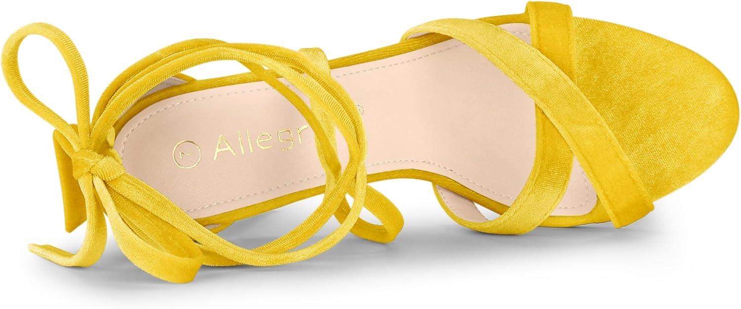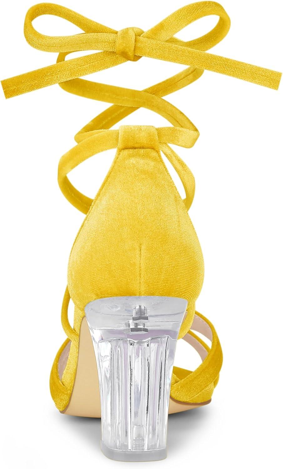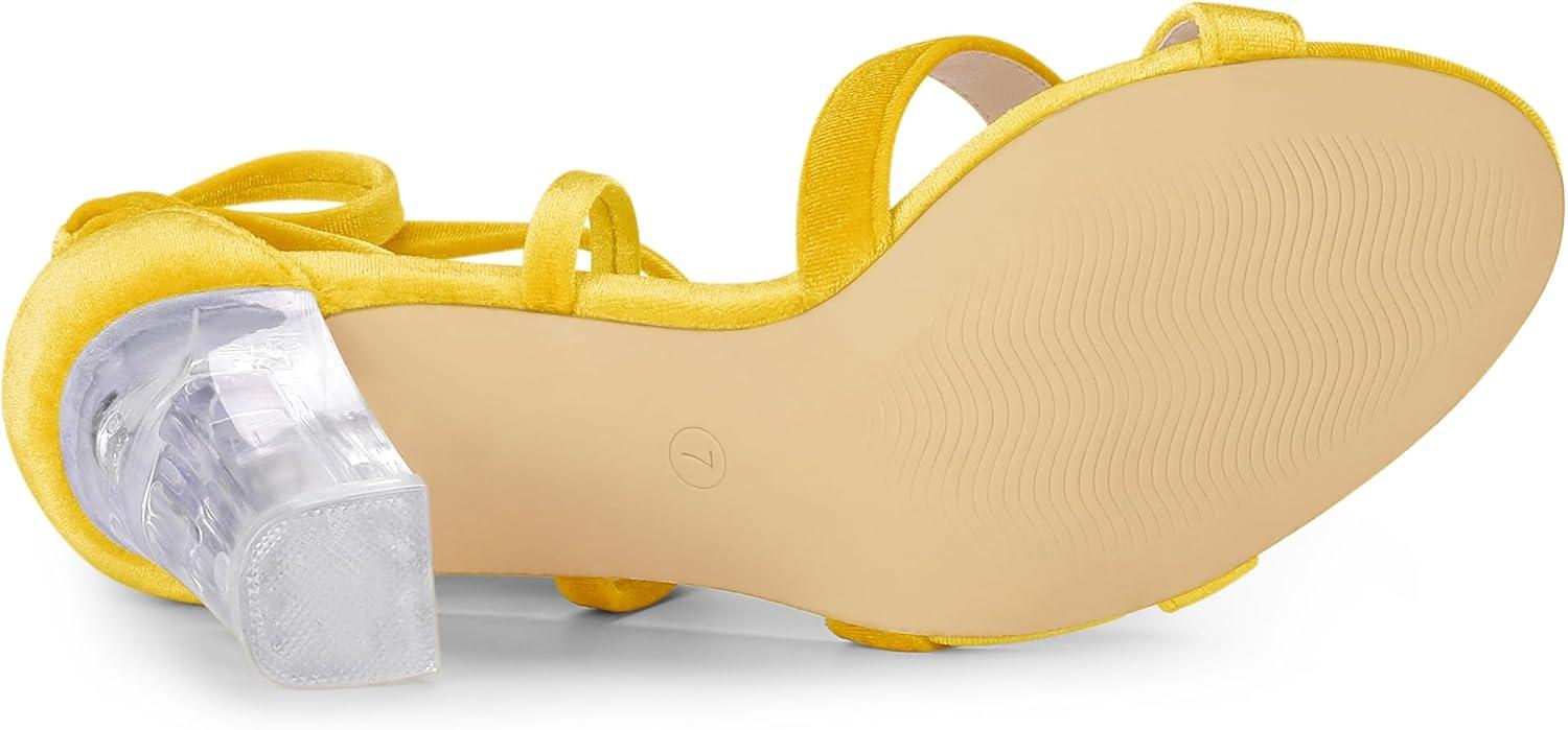 Allegra K Women’s Velvet Lace Up Clear Heels Block Heel Sandals(Yellow)