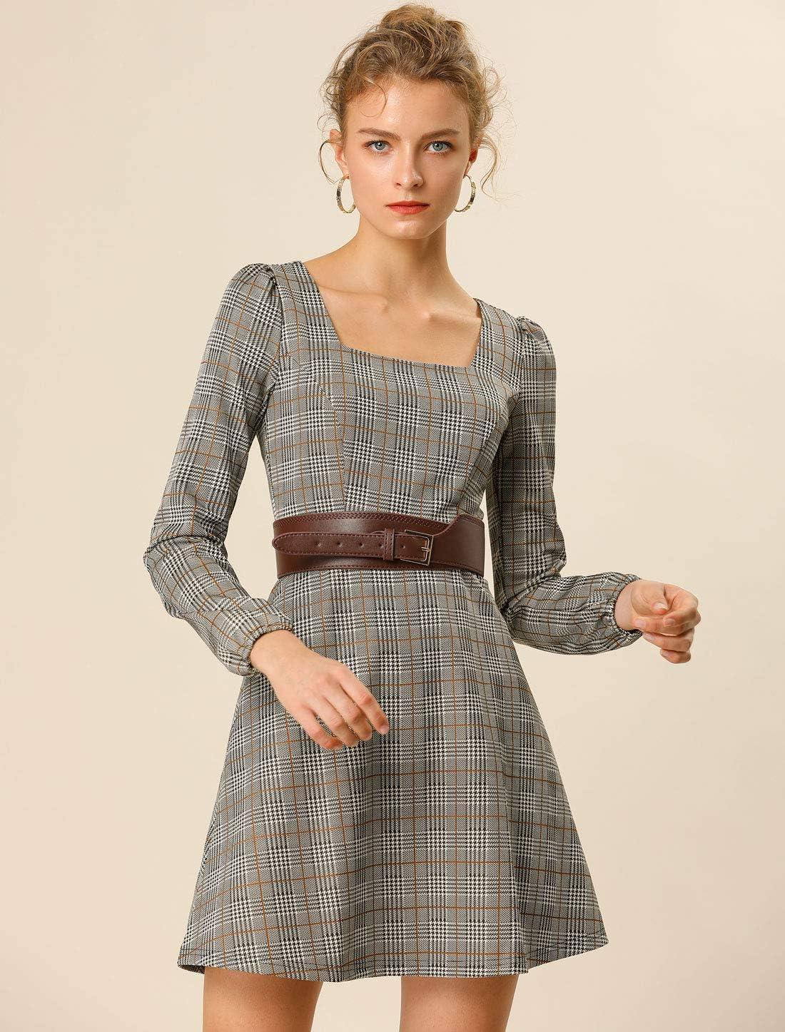Allegra K Women’s Vintage Plaid Dress Retro Square Neck Long Sleeve Office Work Christmas Mini Dresses(Brown)
