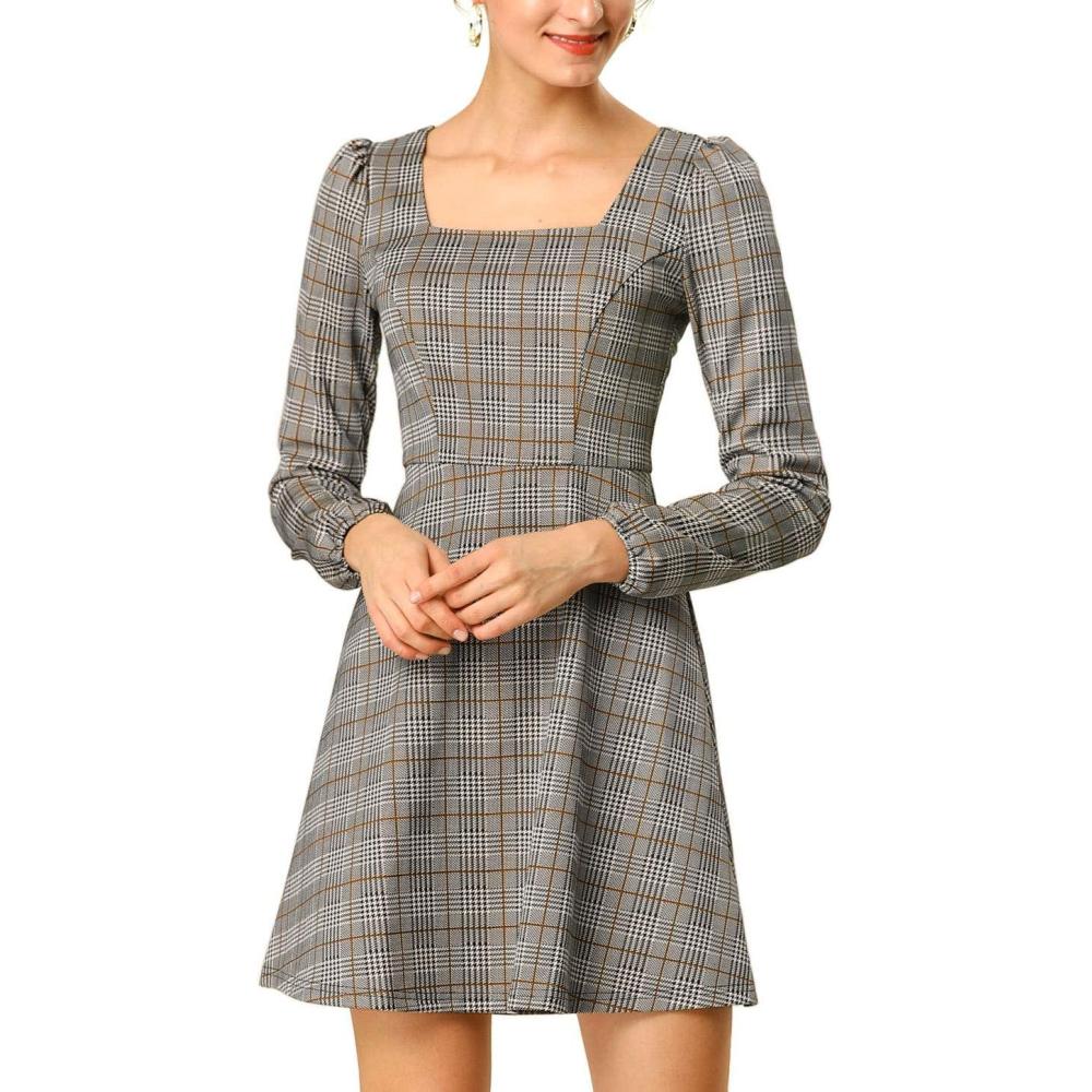 imageAllegra K Womens Vintage Plaid Dress Retro Square Neck Long Sleeve Office Work Christmas Mini DressesBrowngold