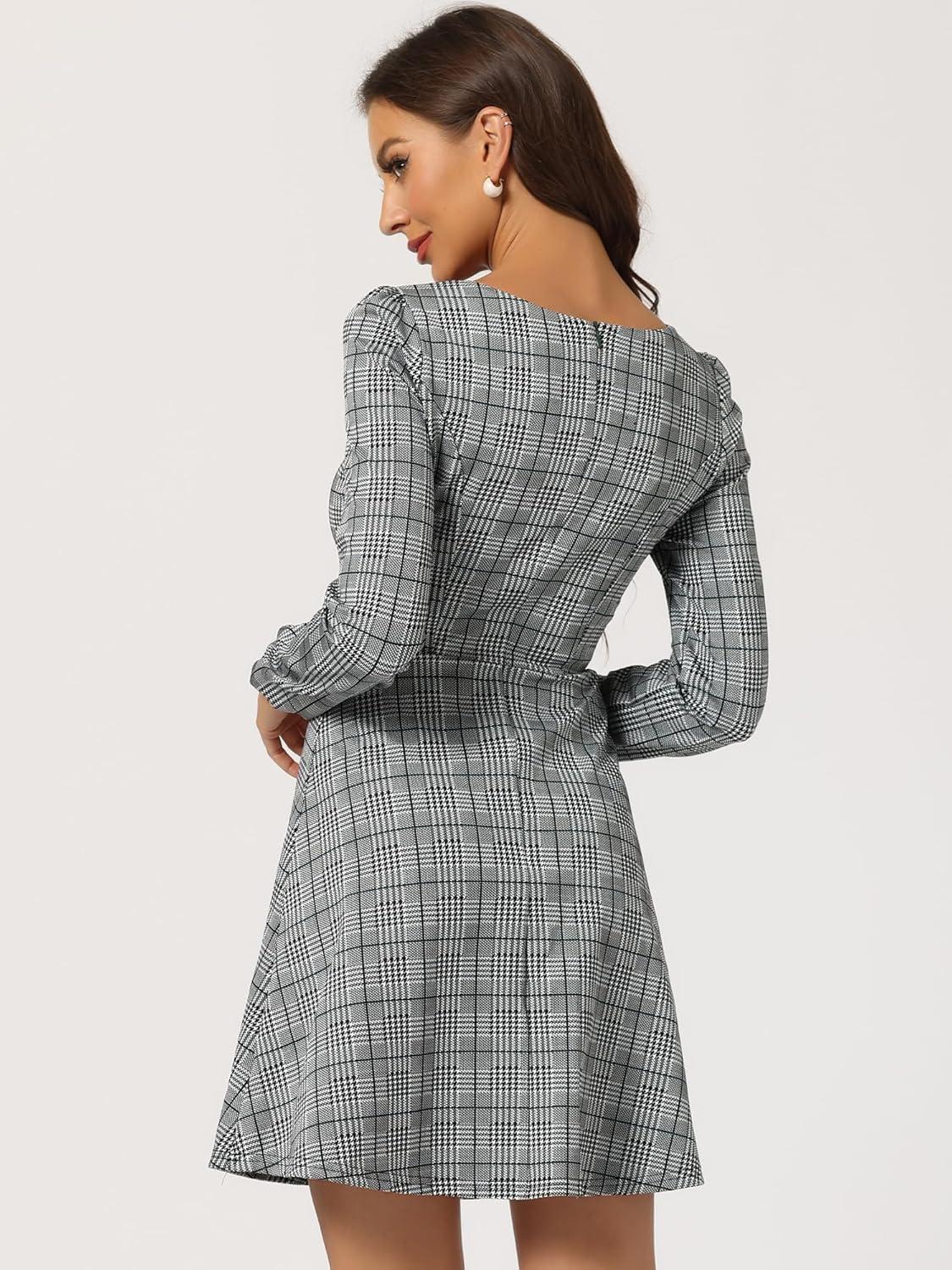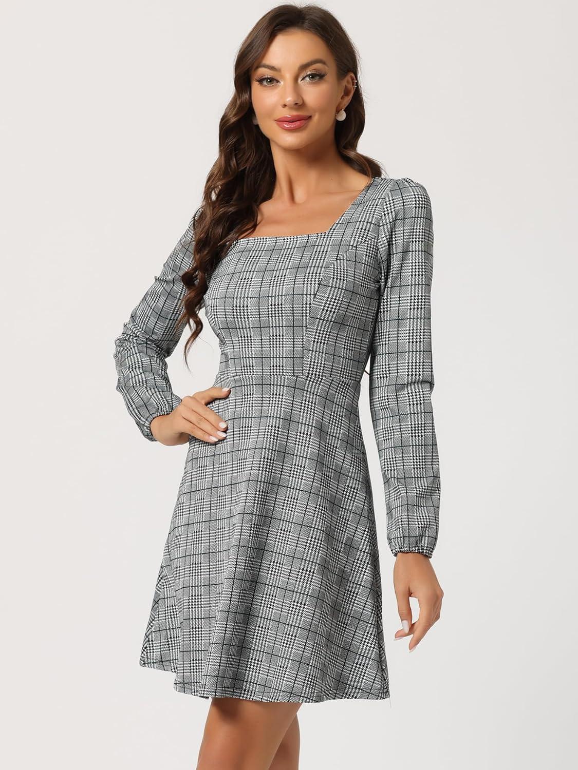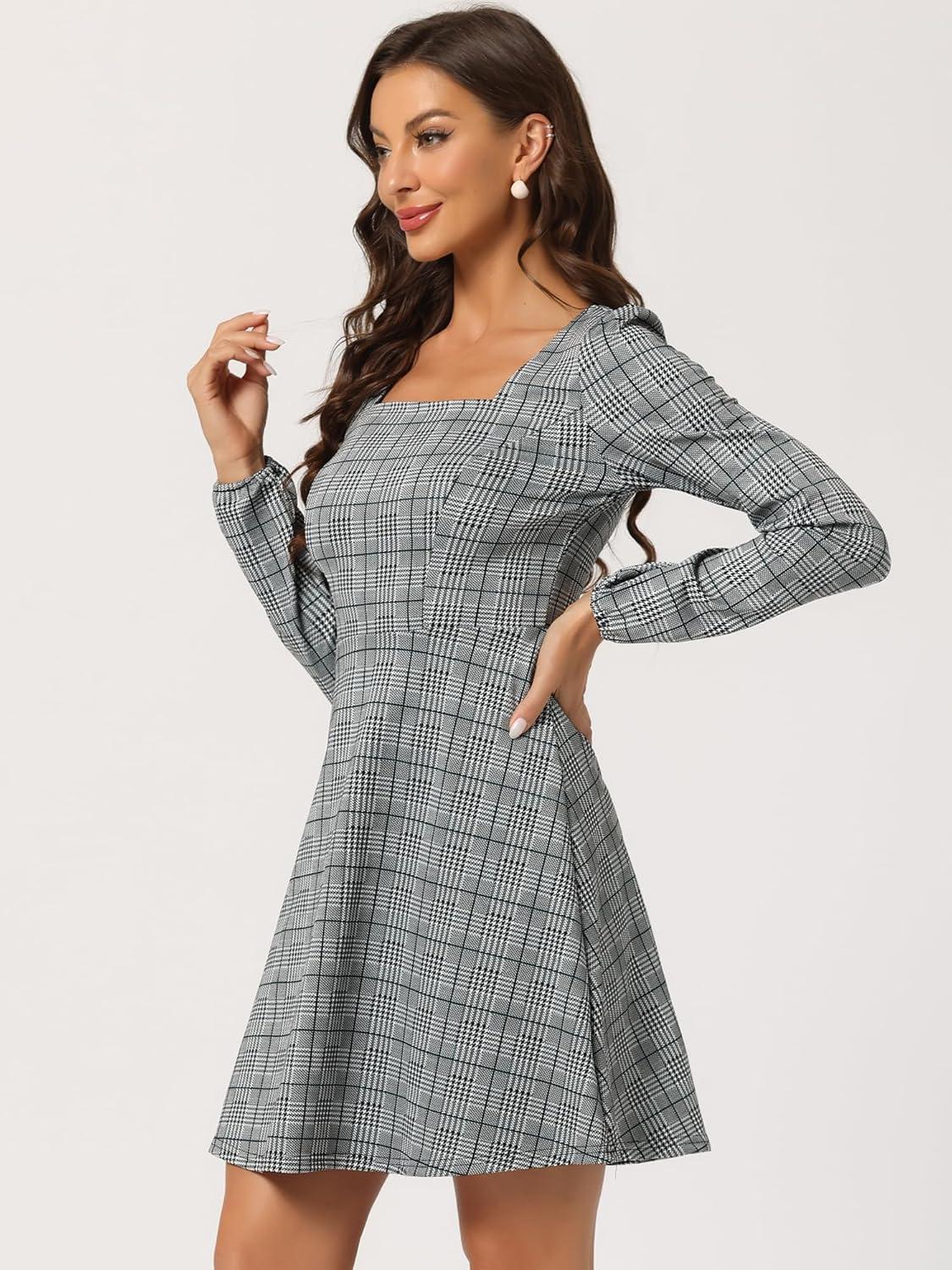 imageAllegra K Womens Vintage Plaid Dress Retro Square Neck Long Sleeve Office Work Christmas Mini DressesGreen