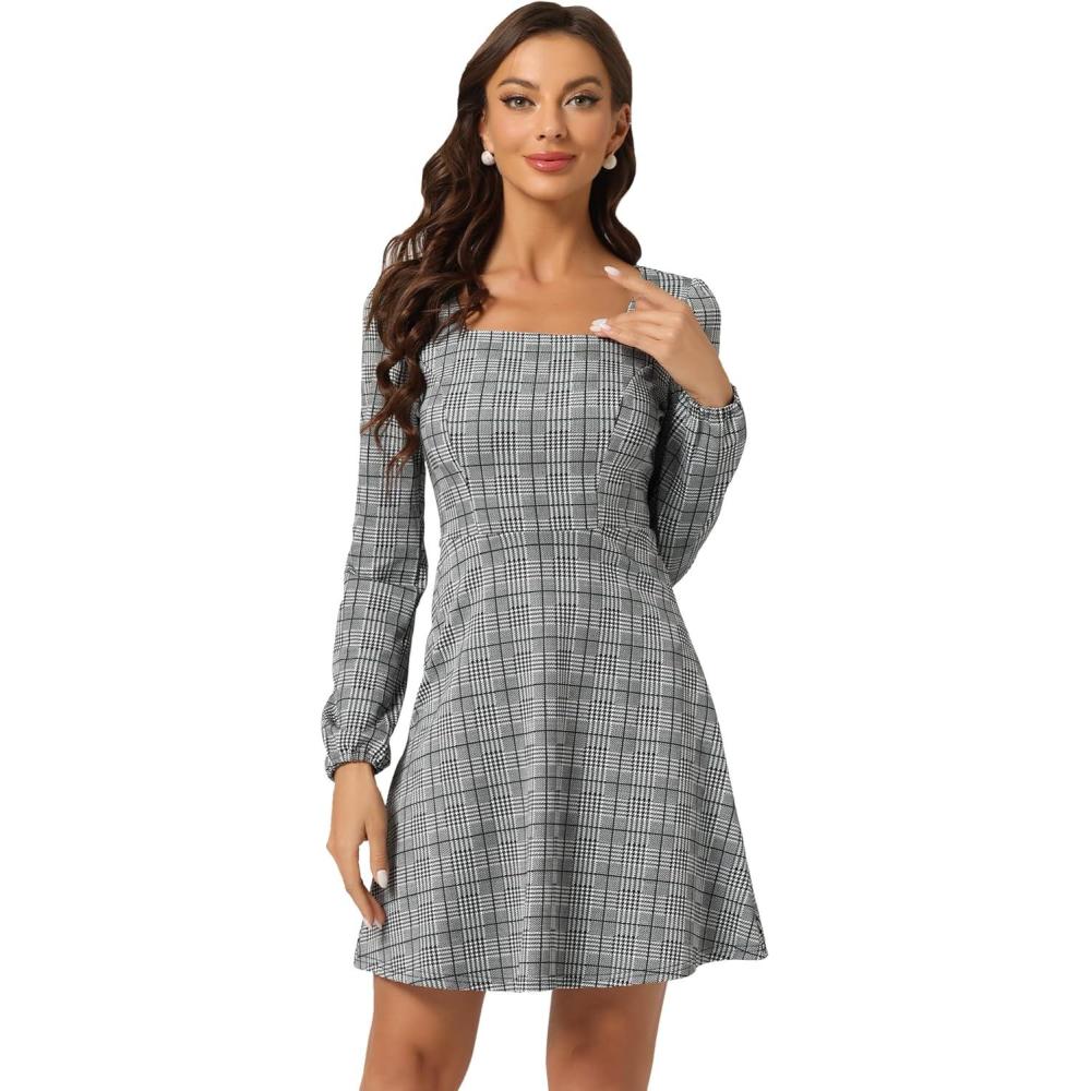 Allegra K Women’s Vintage Plaid Dress Retro Square Neck Long Sleeve Office Work Christmas Mini Dresses(Brown-gold)