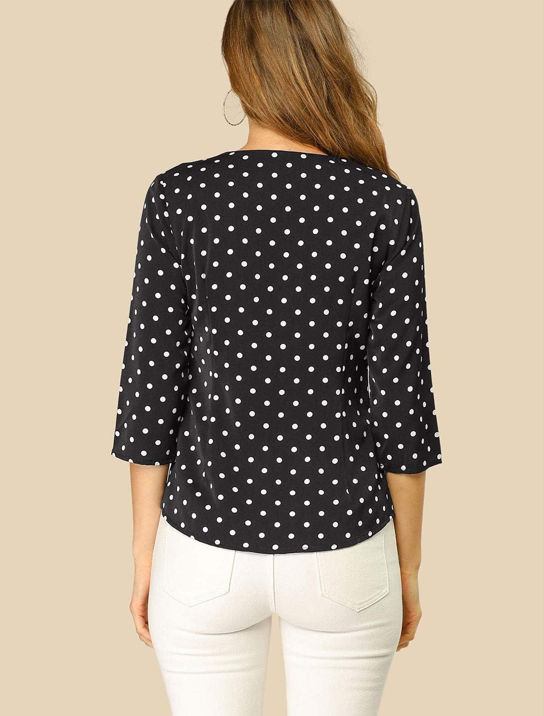 Allegra K Women’s Vintage Polka Dots 3/4 Sleeve Button Front V Neck Casual Office Blouse Top(Black)