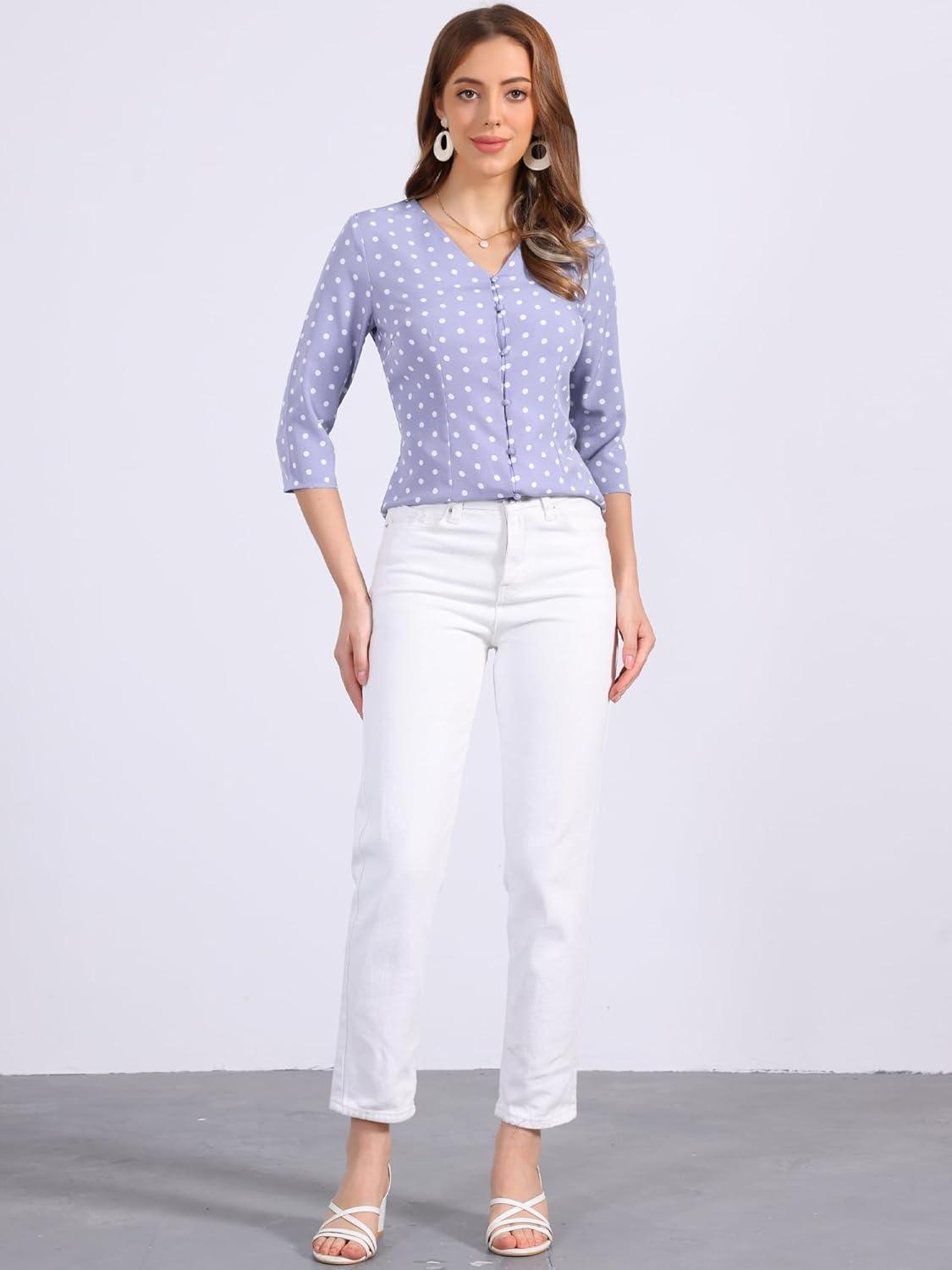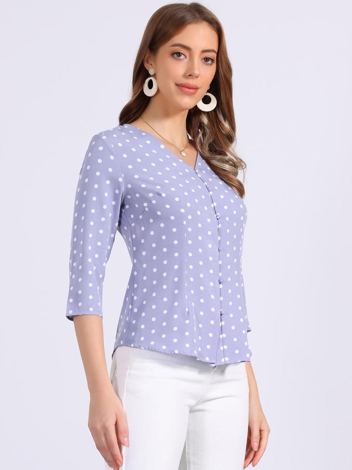 Allegra K Women’s Vintage Polka Dots 3/4 Sleeve Button Front V Neck Casual Office Blouse Top(Dusty Purple)