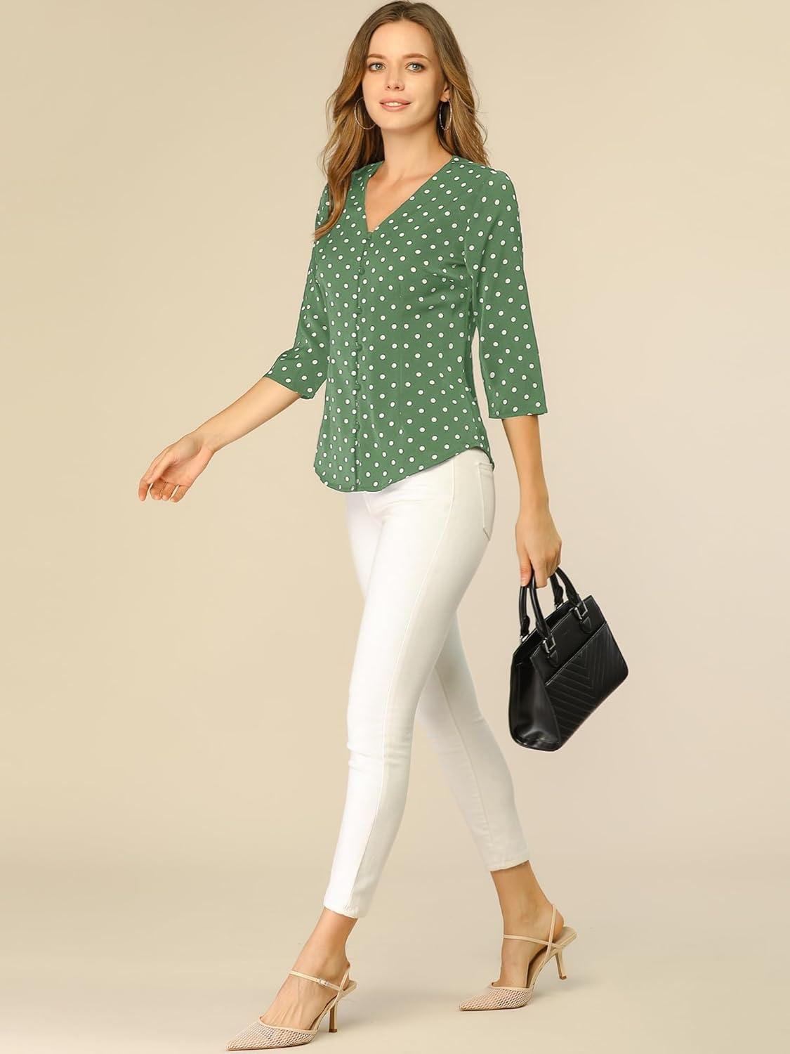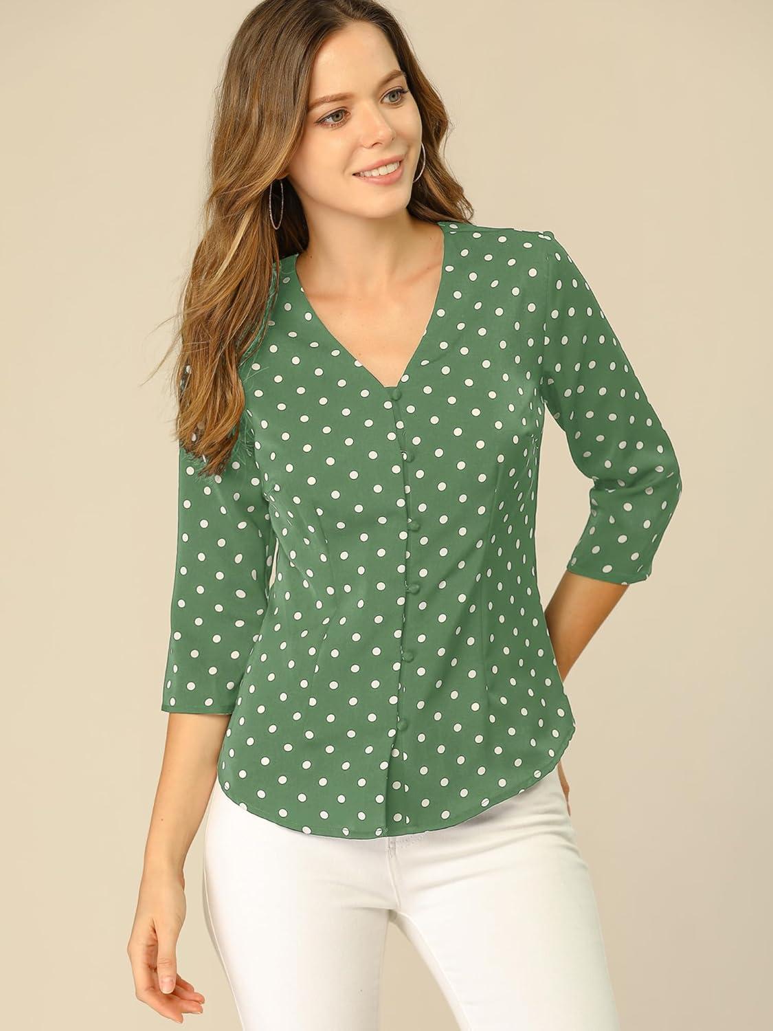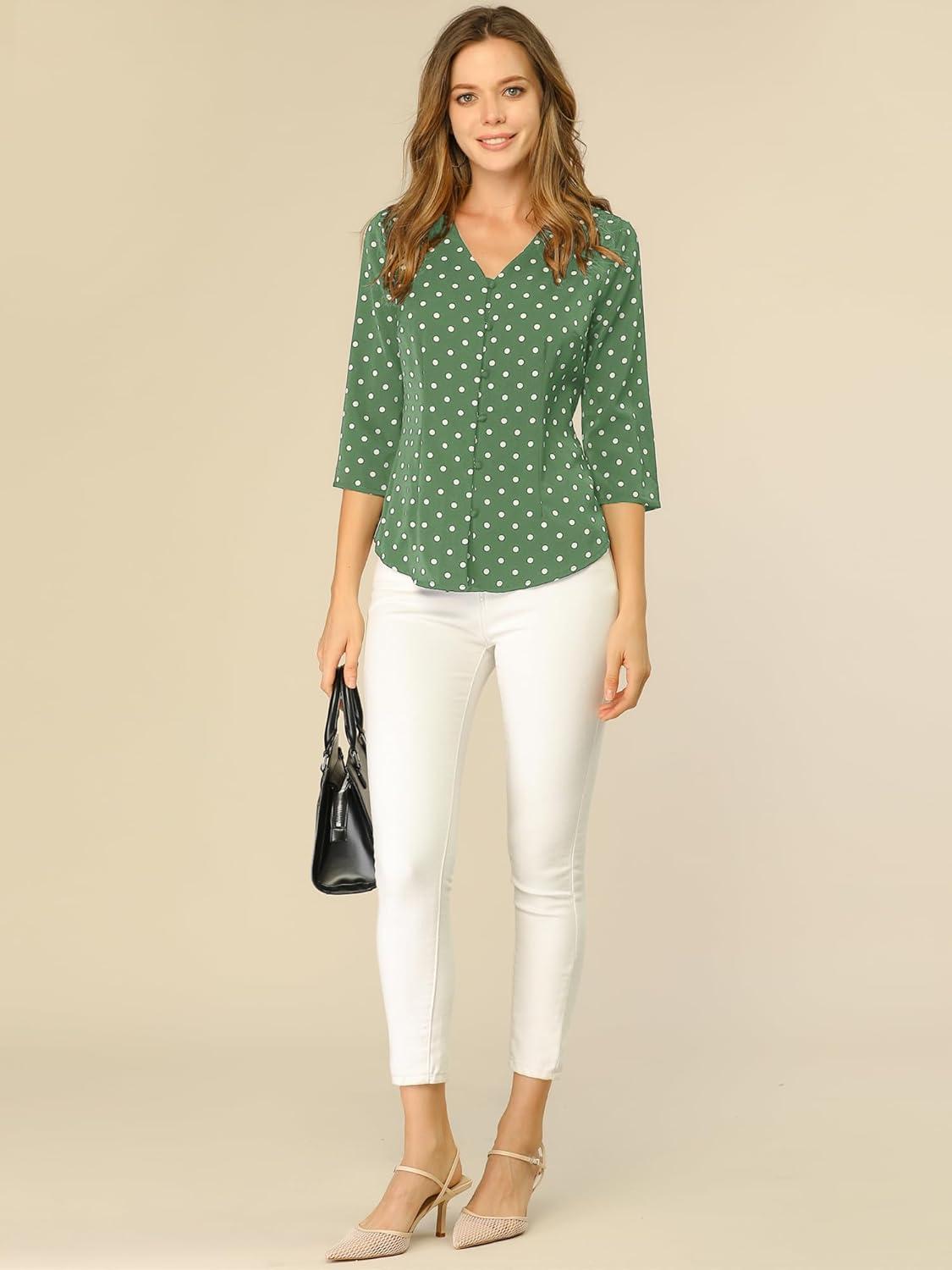 Allegra K Women’s Vintage Polka Dots 3/4 Sleeve Button Front V Neck Casual Office Blouse Top(Olive Green)