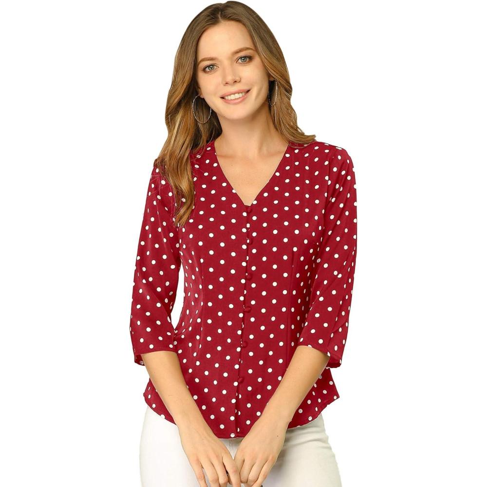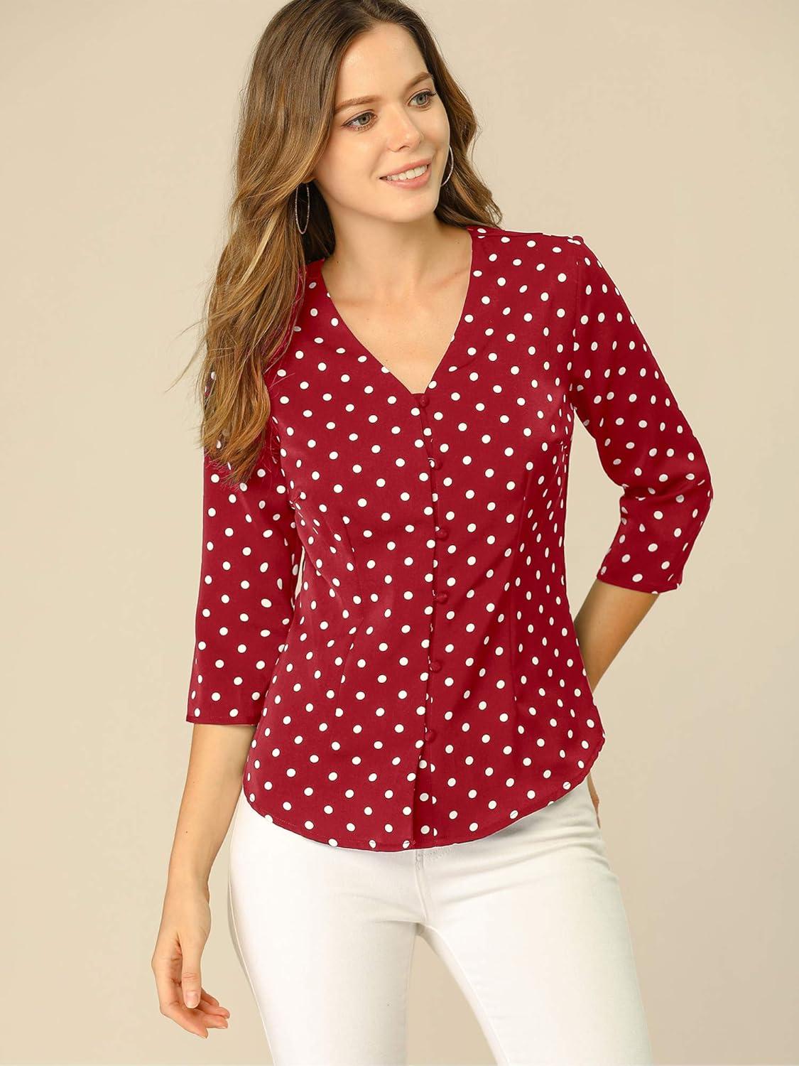 imageAllegra K Womens Vintage Polka Dots 34 Sleeve Button Front V Neck Casual Office Blouse TopRed