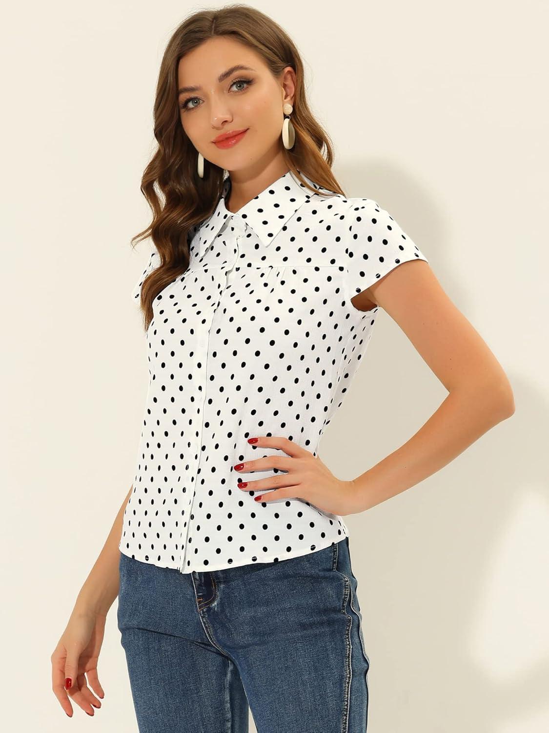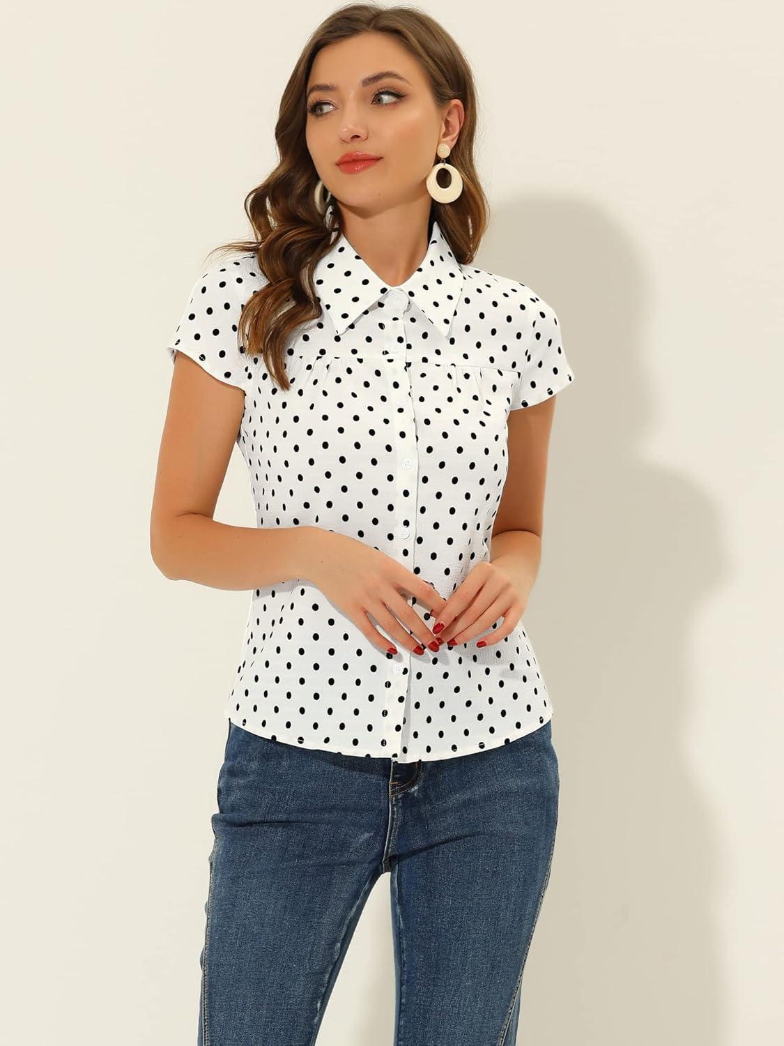 Allegra K Women’s Vintage Polka Dots Shirt Retro Short Sleeve Button Up Tops(White)