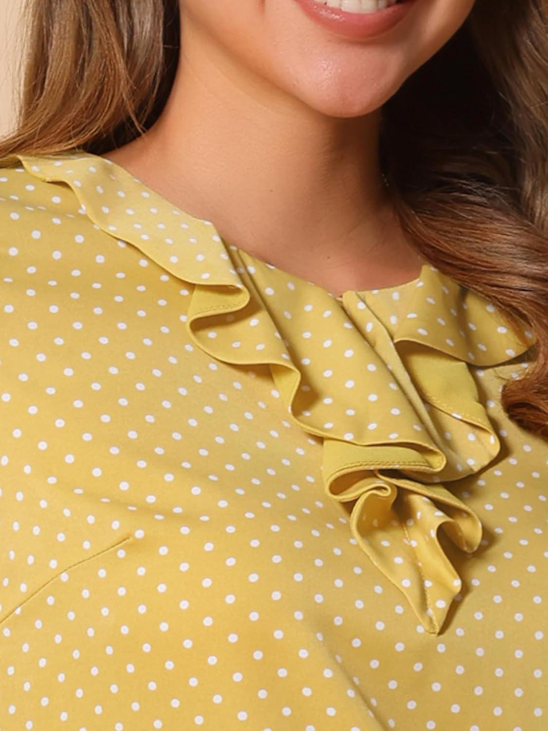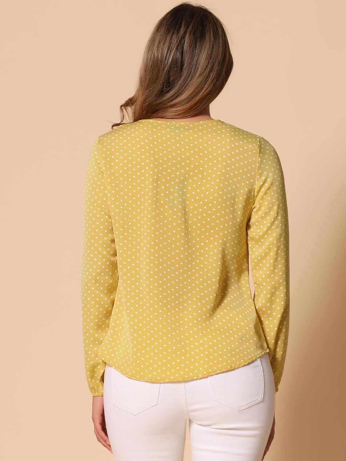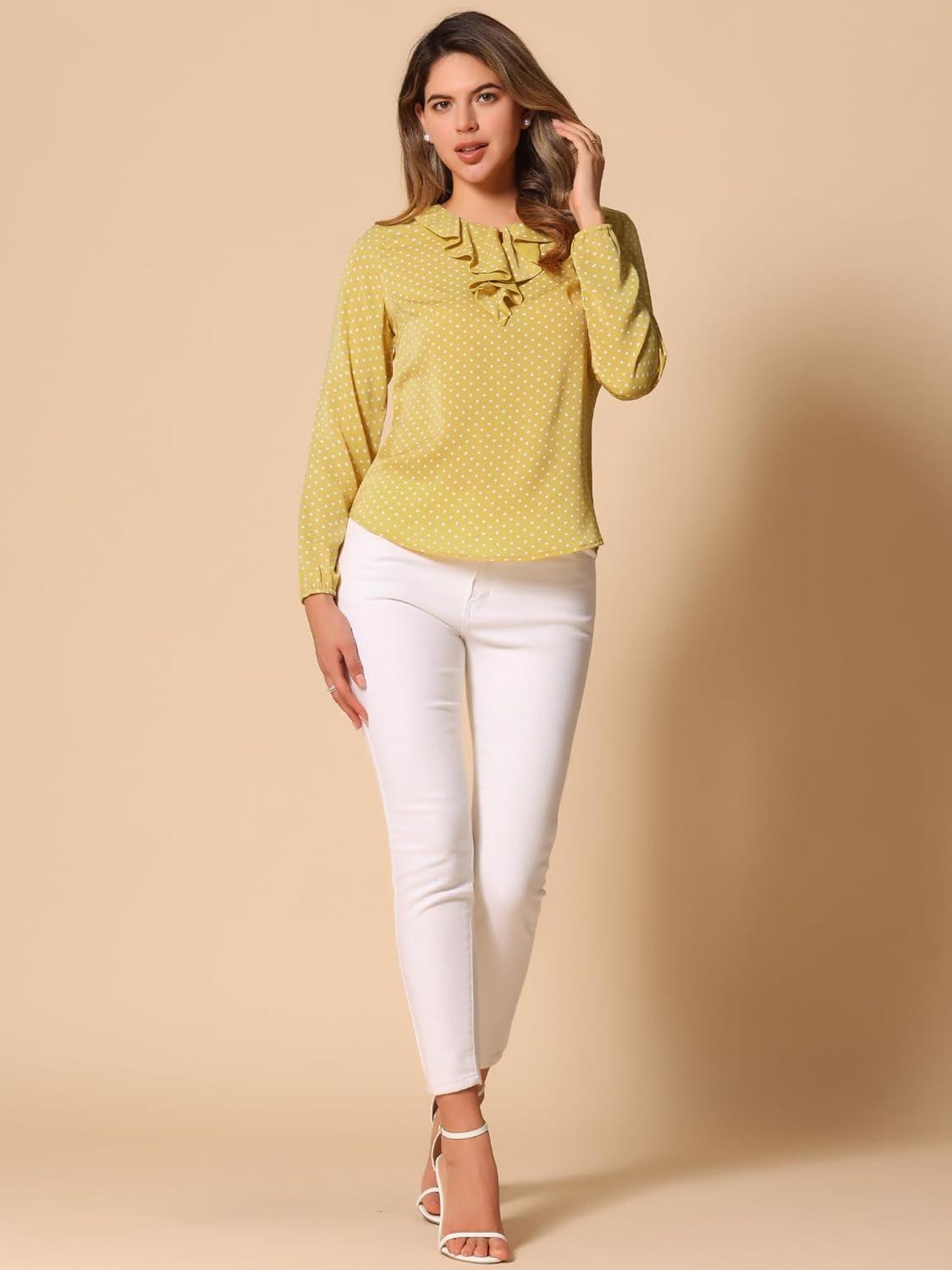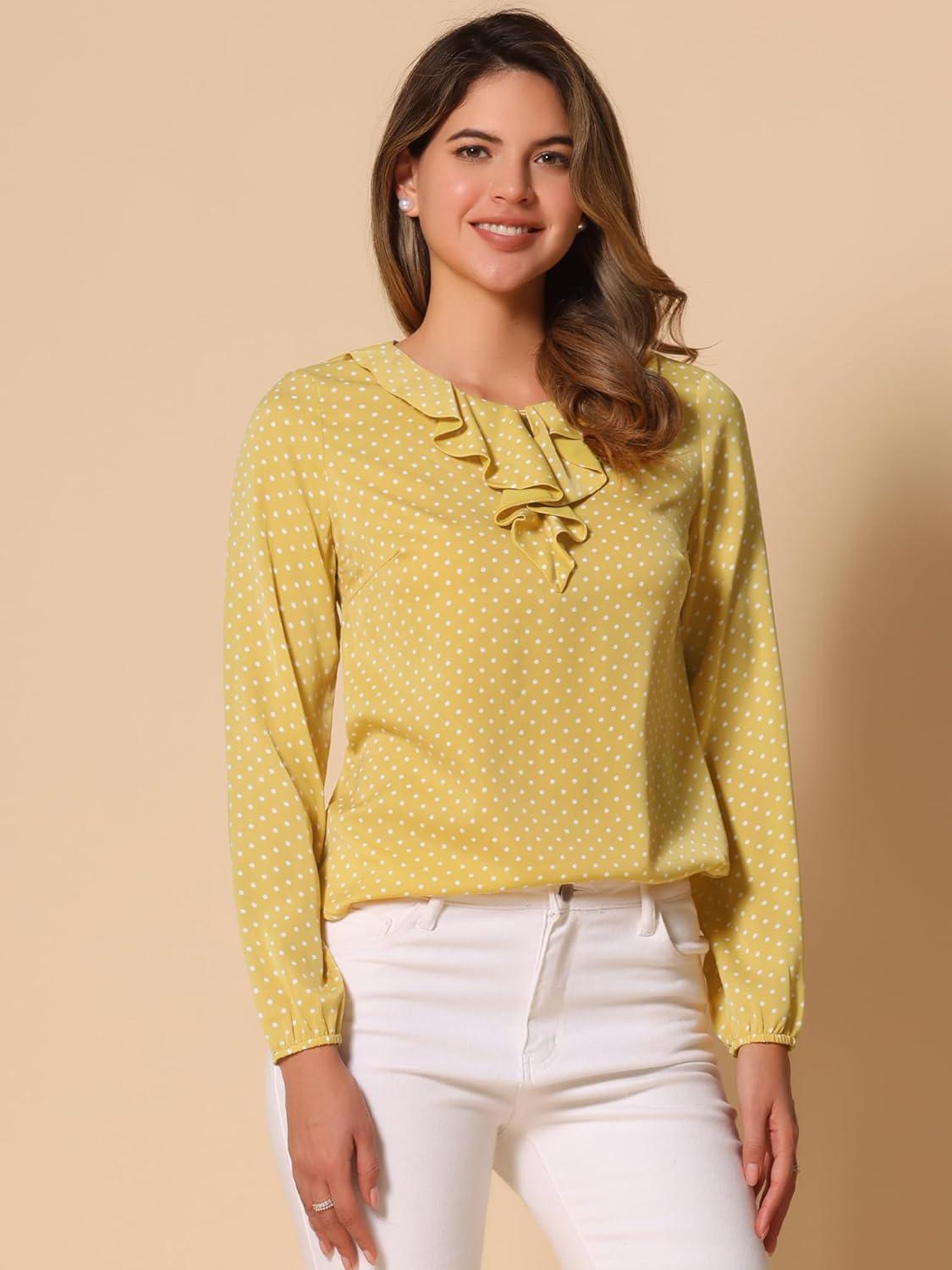 Allegra K Women’s Vintage Ruffle Neck Chiffon Printed Top Halloween Long Sleeve Casual Office Blouse(Light Yellow-polka Dots)