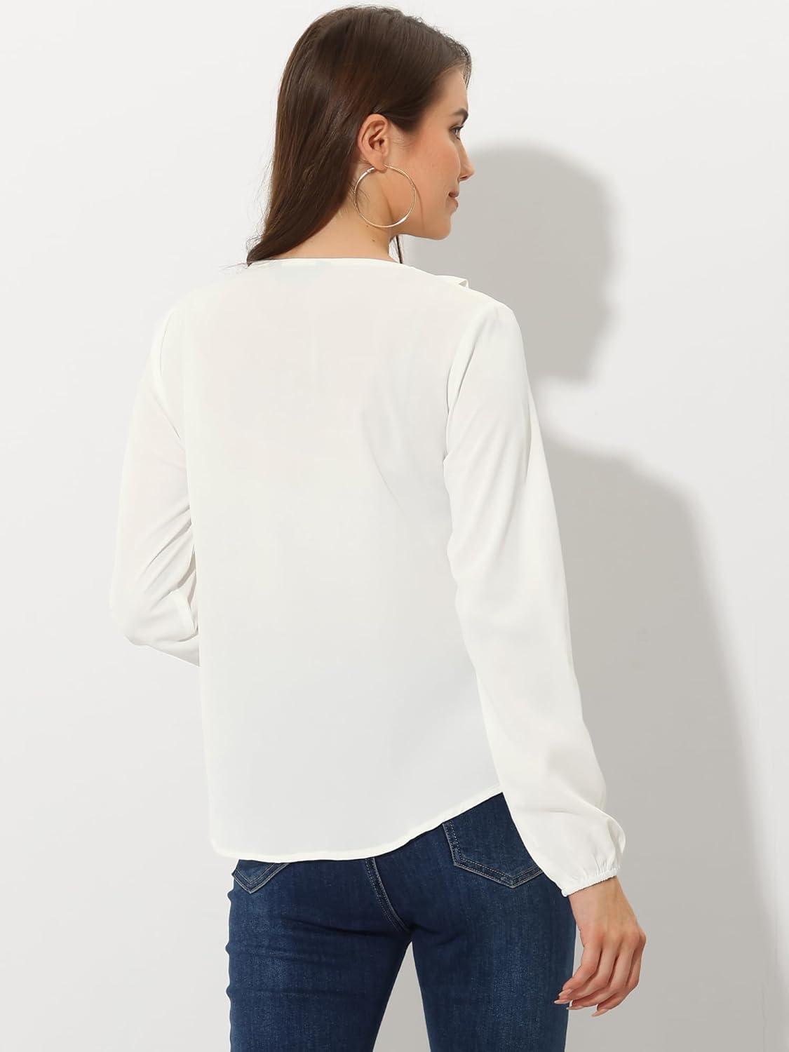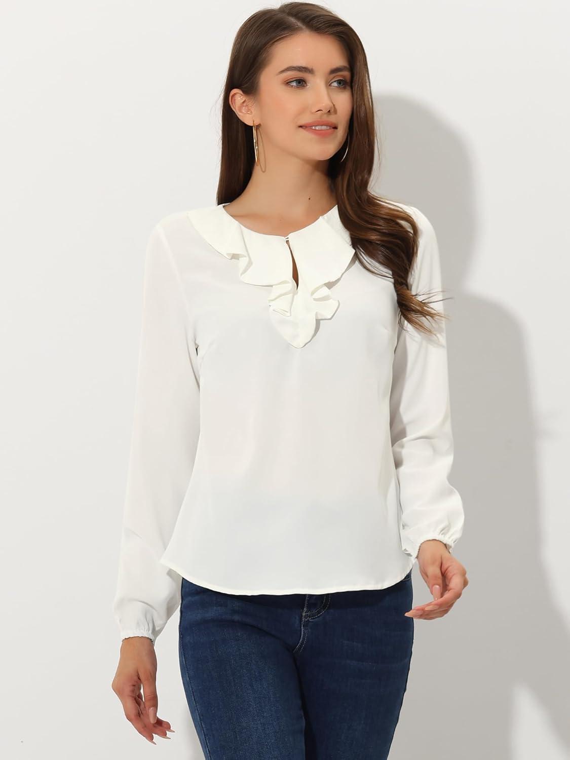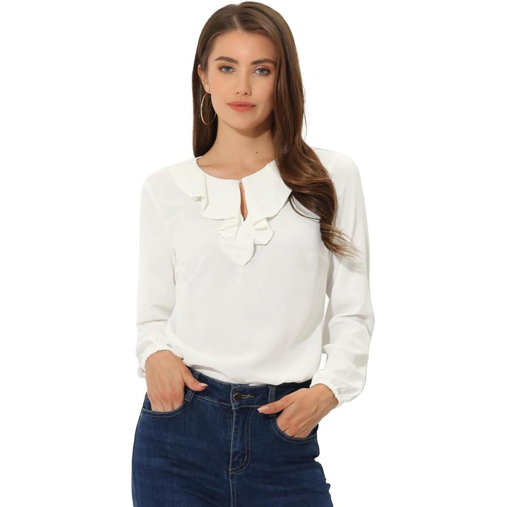 Allegra K Women’s Vintage Ruffle Neck Chiffon Printed Top Halloween Long Sleeve Casual Office Blouse(White-solid)