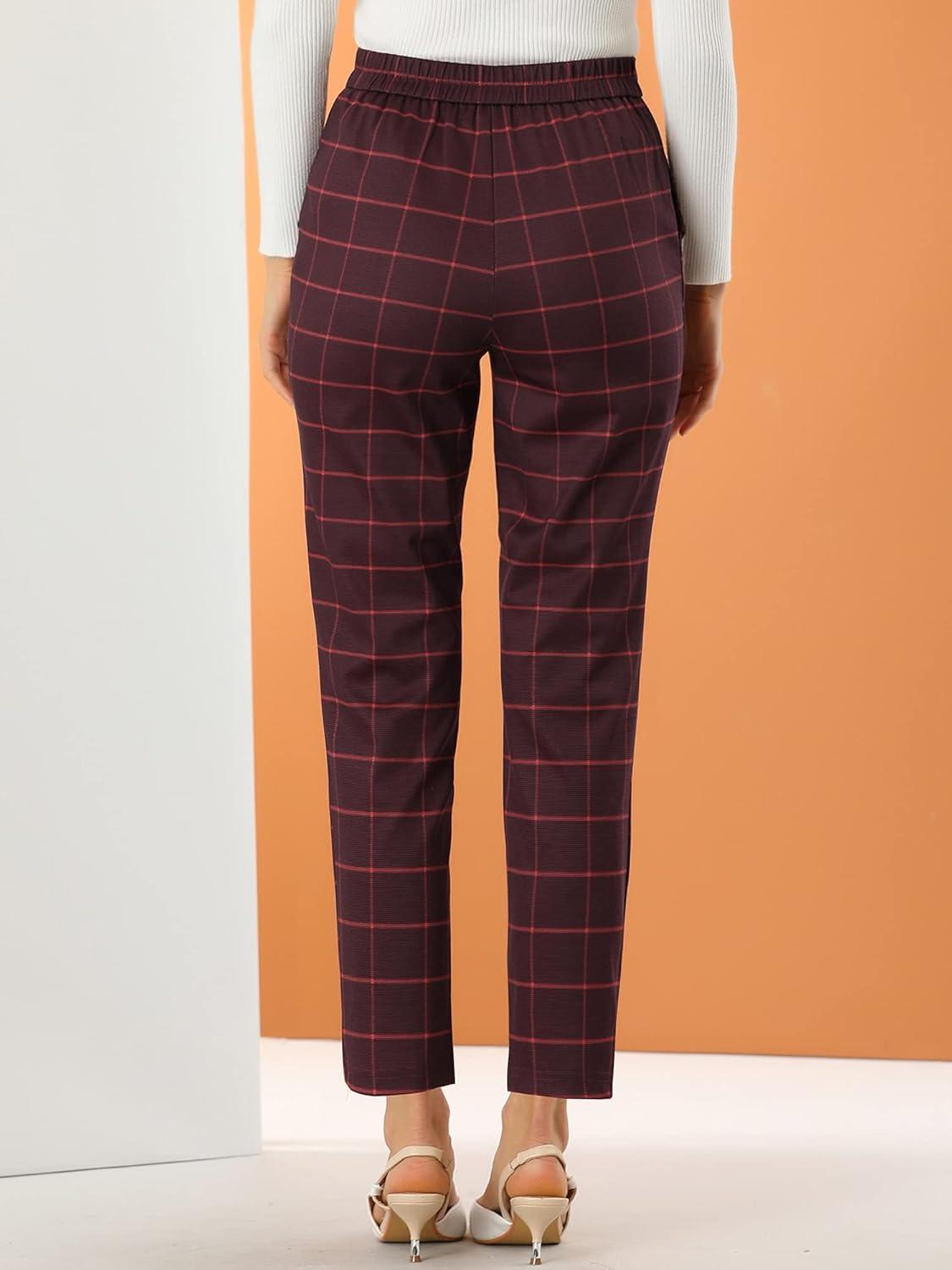 Allegra K Women's Vintage Tartan Plaid Pants Elastic Waist Straight Long Trousers(Burgundy)