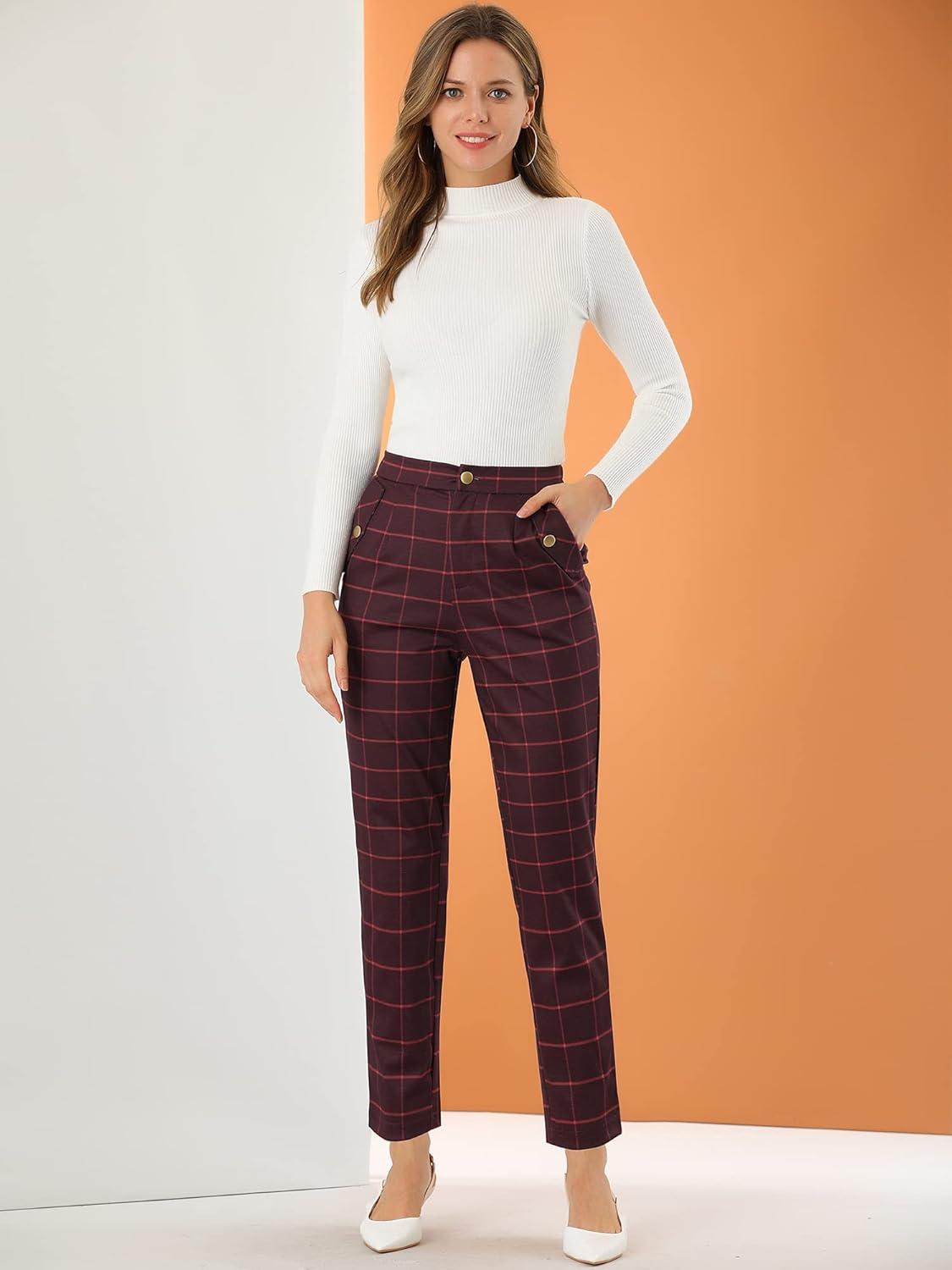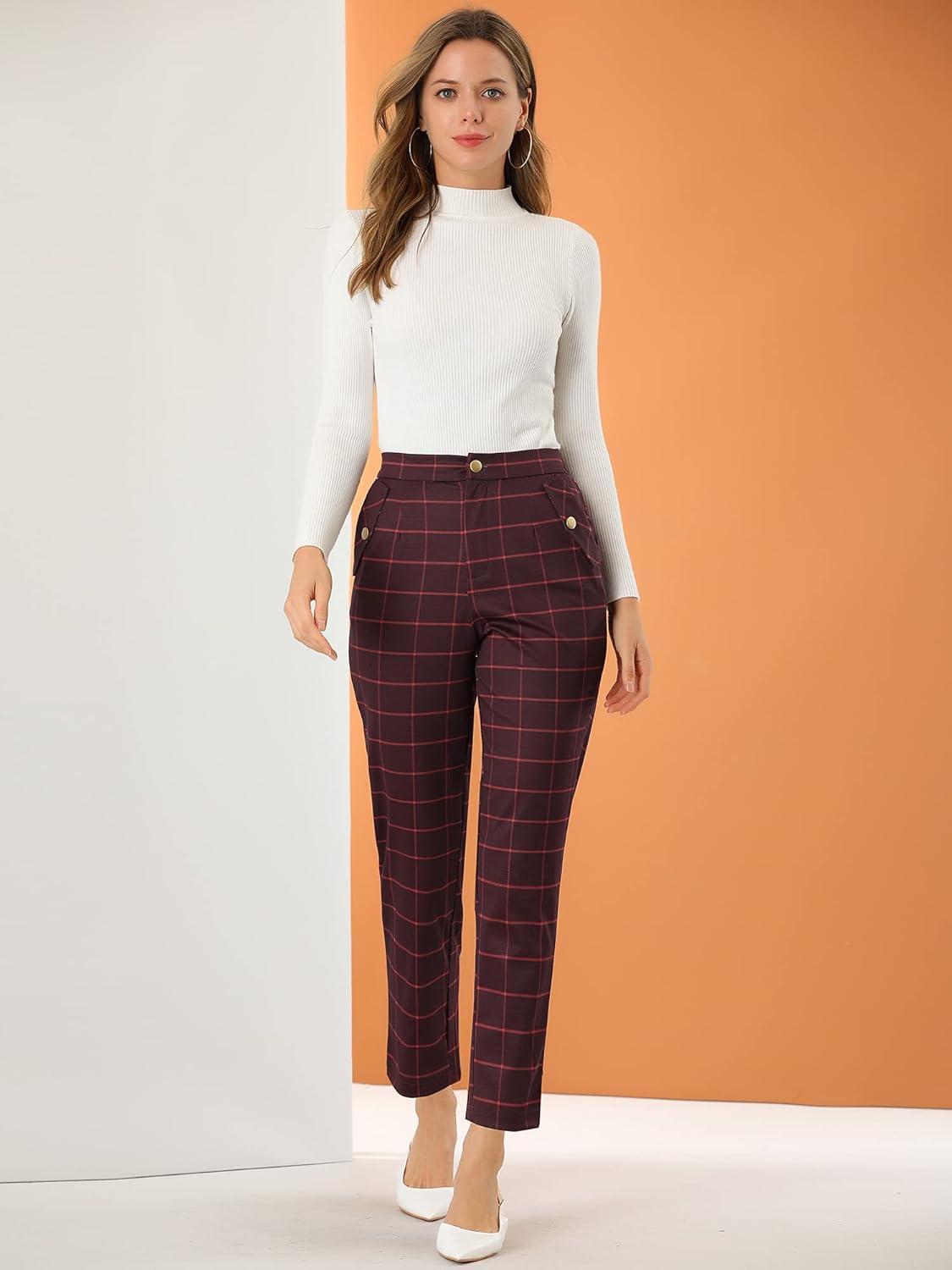 Allegra K Women’s Vintage Tartan Plaid Pants Elastic Waist Straight Long Trousers(Burgundy)