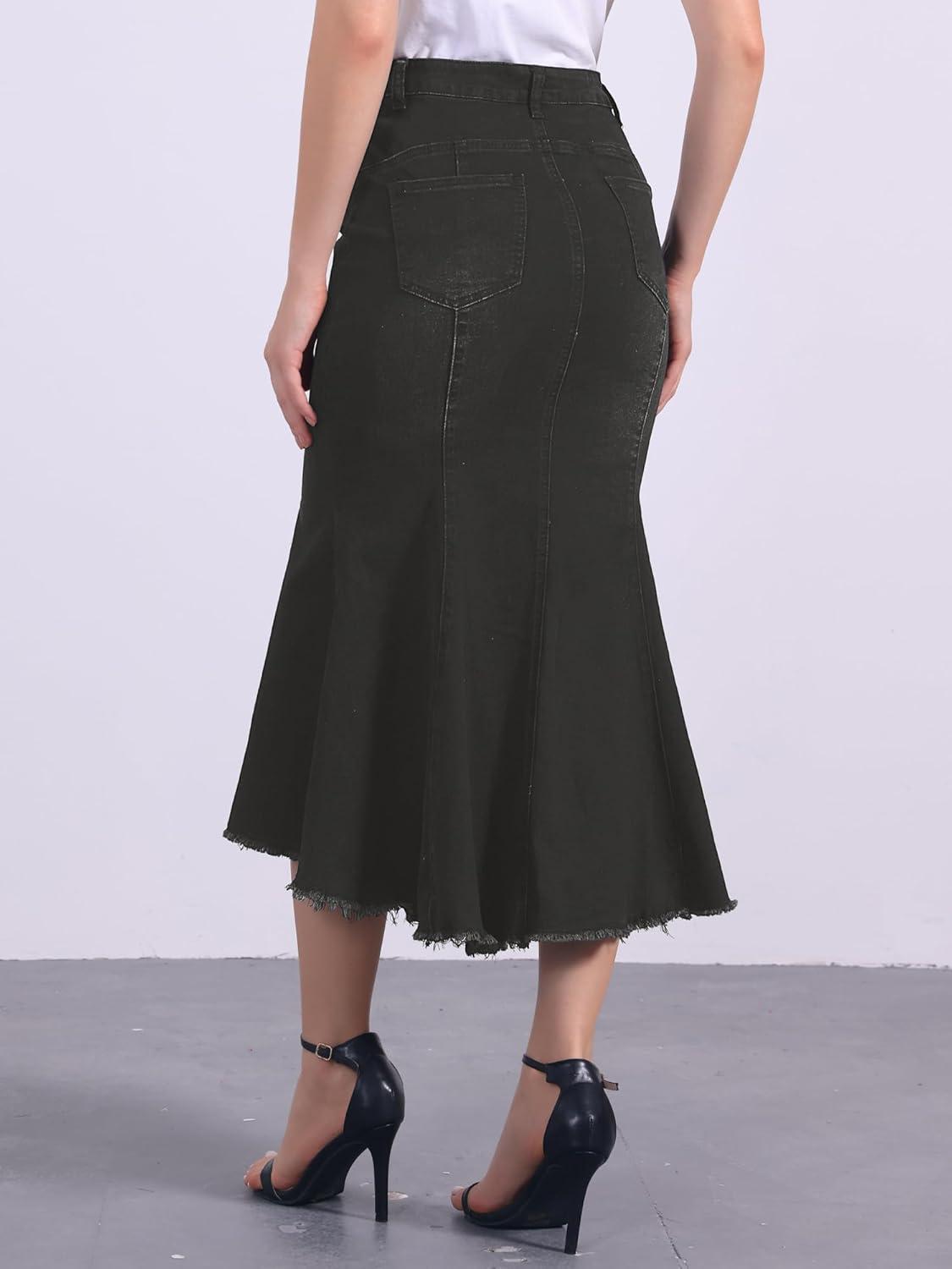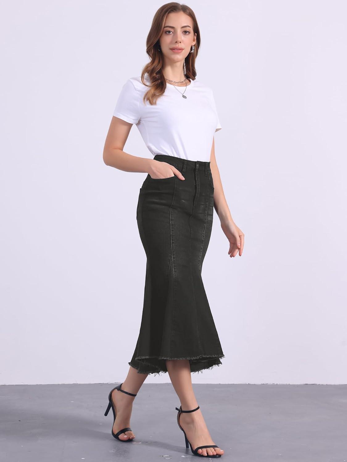 Allegra K Women’s Washed Fishtail Denim Skirt High Waist Raw Hem Fashion Casual Midi Jean Skirts with Pockets(Black)