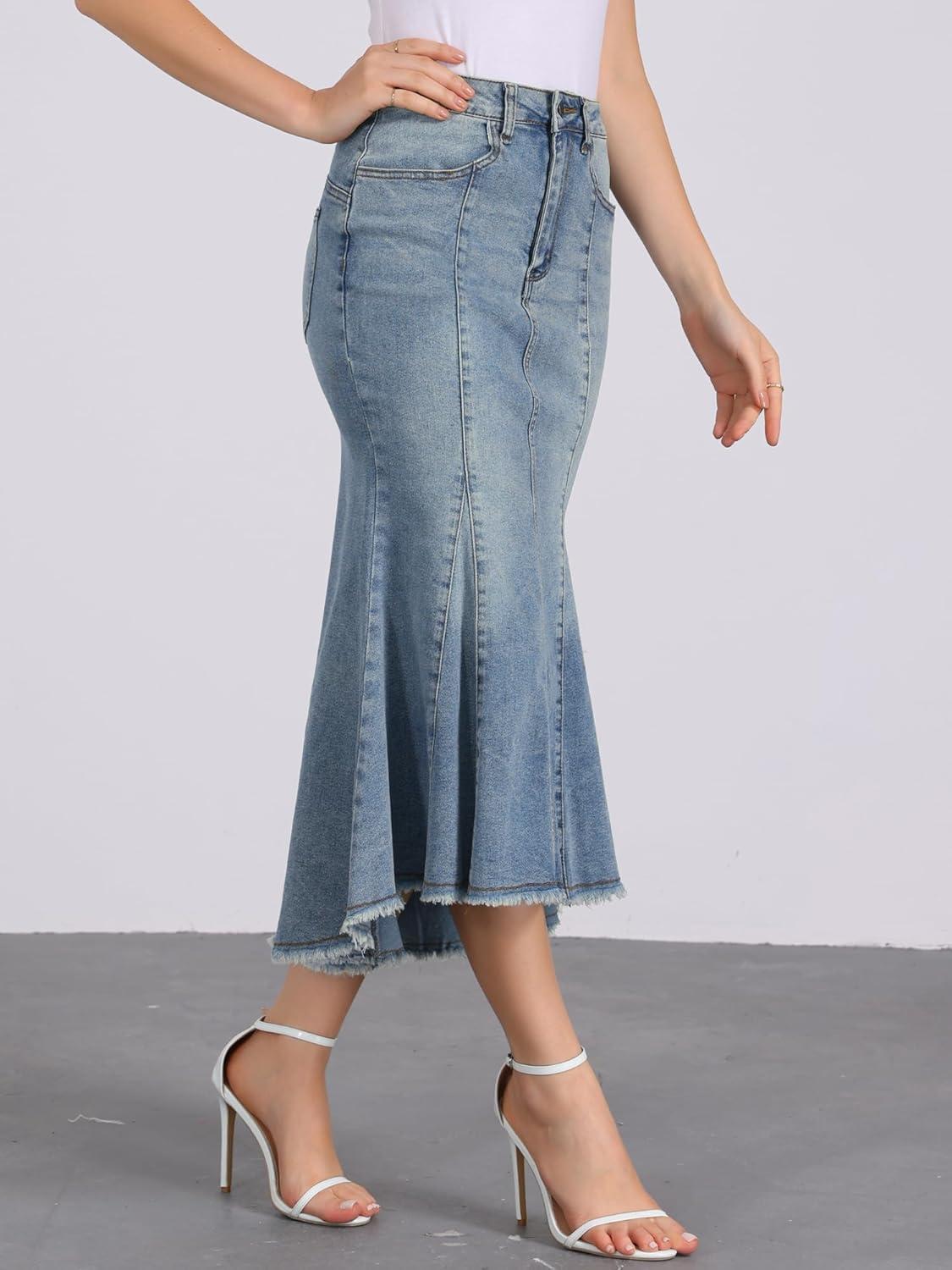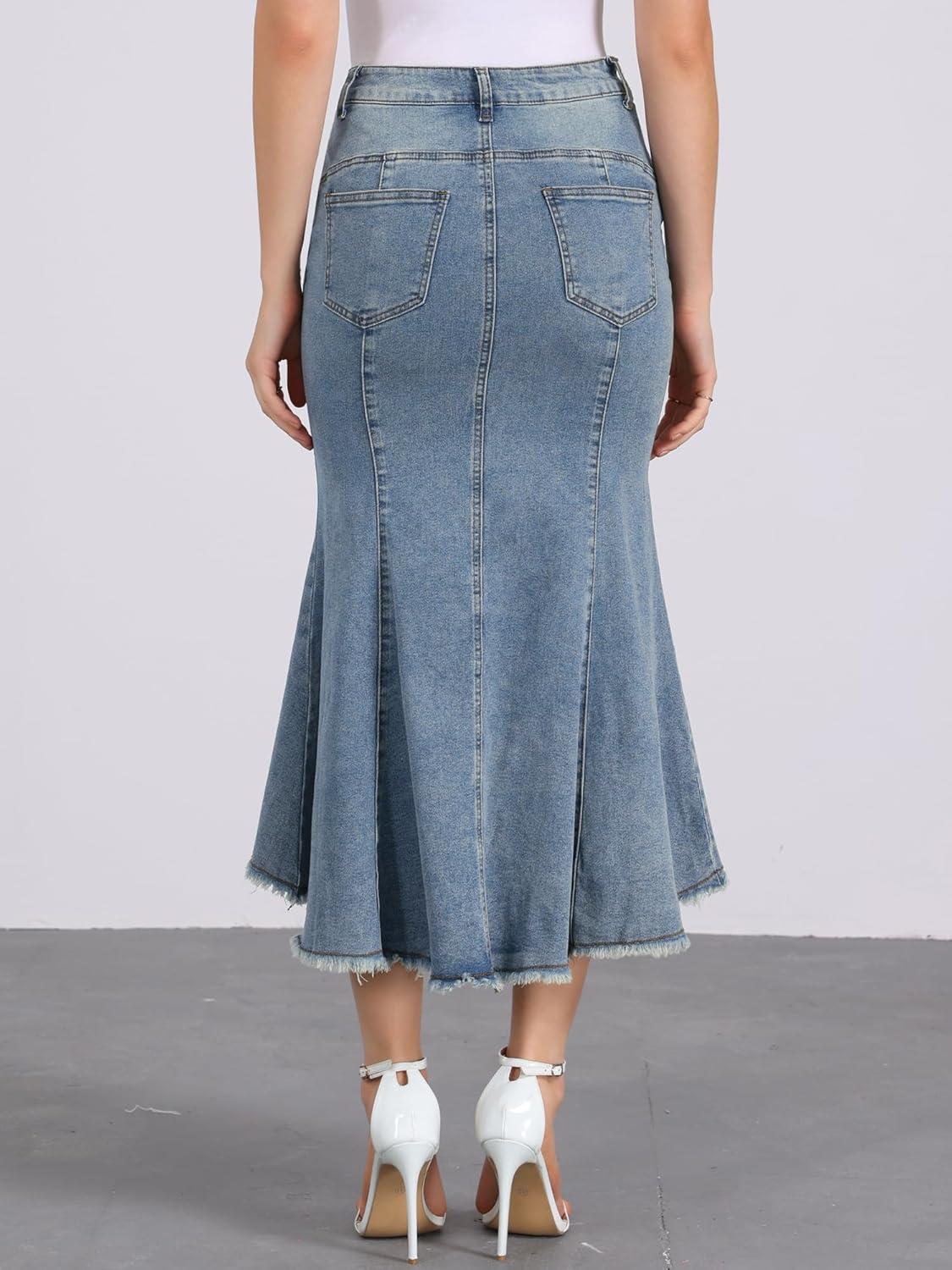 Allegra K Women’s Washed Fishtail Denim Skirt High Waist Raw Hem Fashion Casual Midi Jean Skirts with Pockets(Grey Blue)