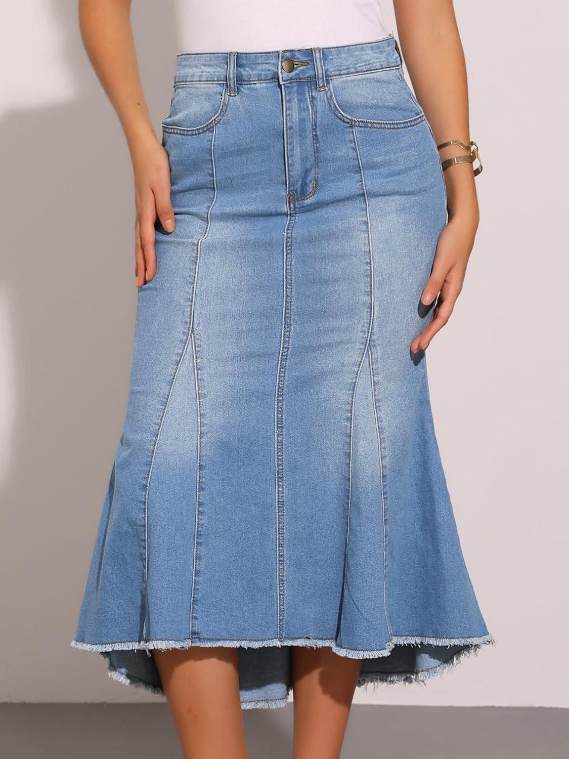 Allegra K Women’s Washed Fishtail Denim Skirt High Waist Raw Hem Fashion Casual Midi Jean Skirts with Pockets(Medium Blue)