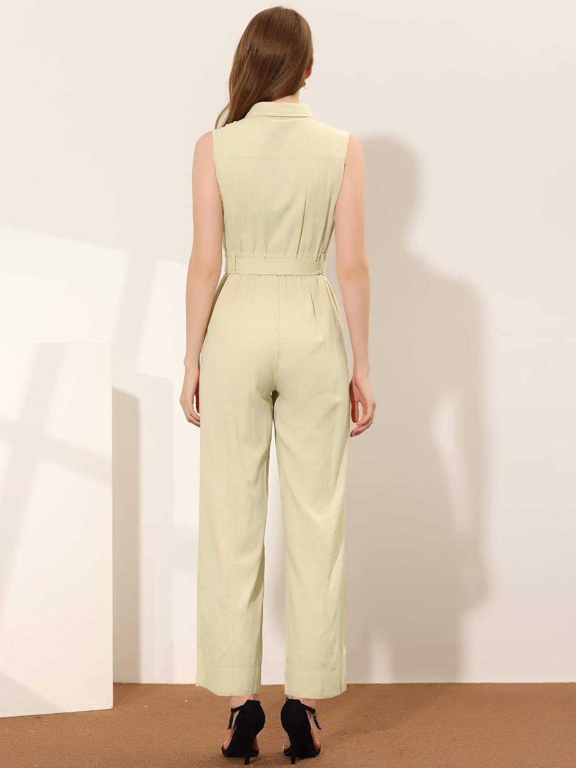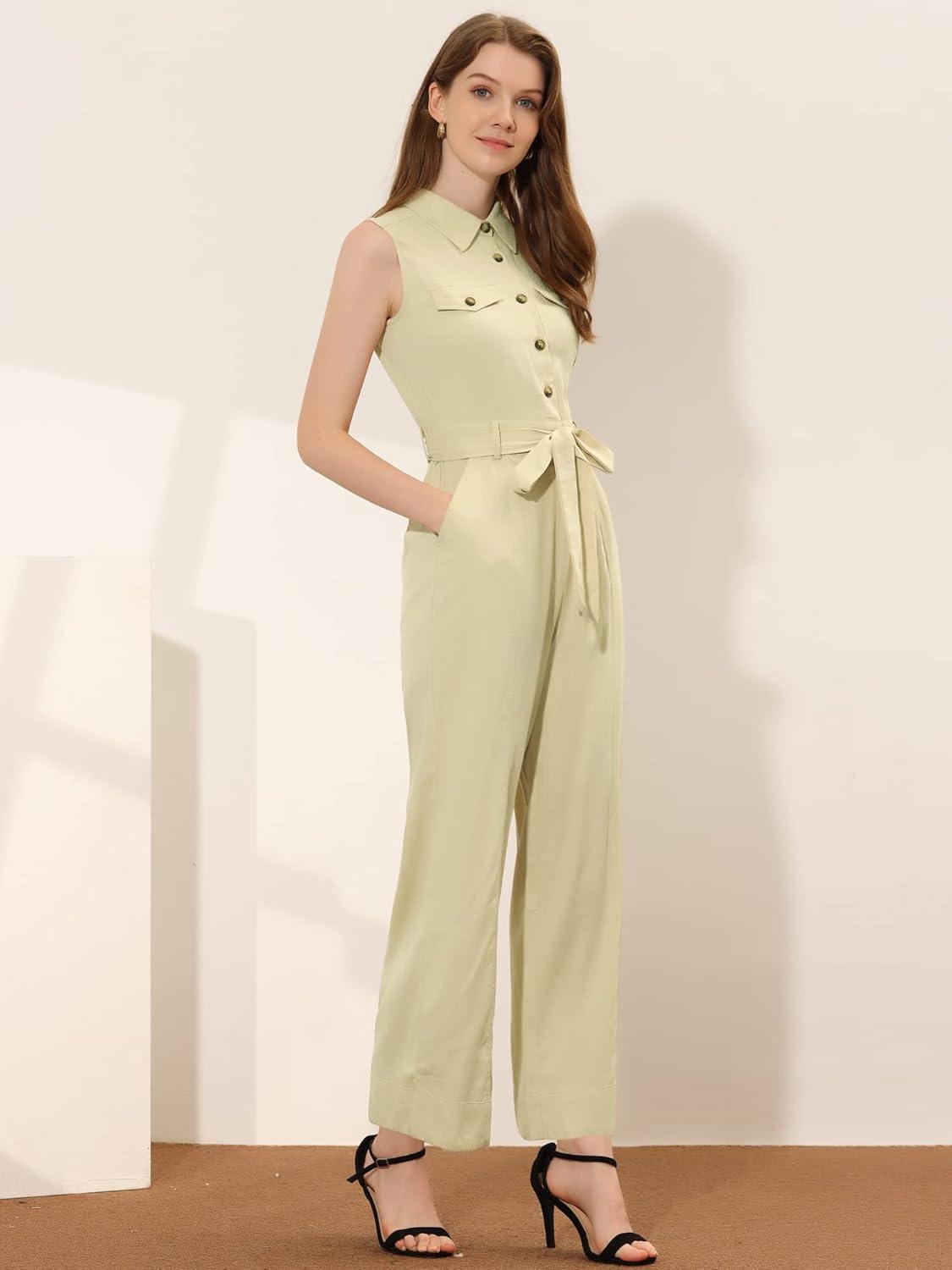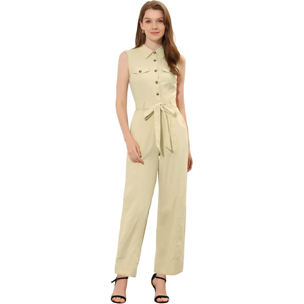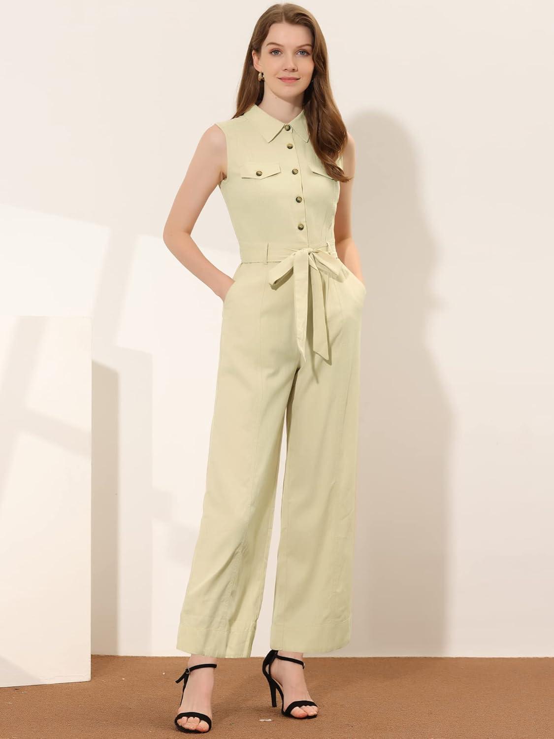 imageAllegra K Womens Wide Leg Jumpsuit 2026 Sleeveless Collared Tie Waist Coverall Button Down Cargo JumpsuitsYellow