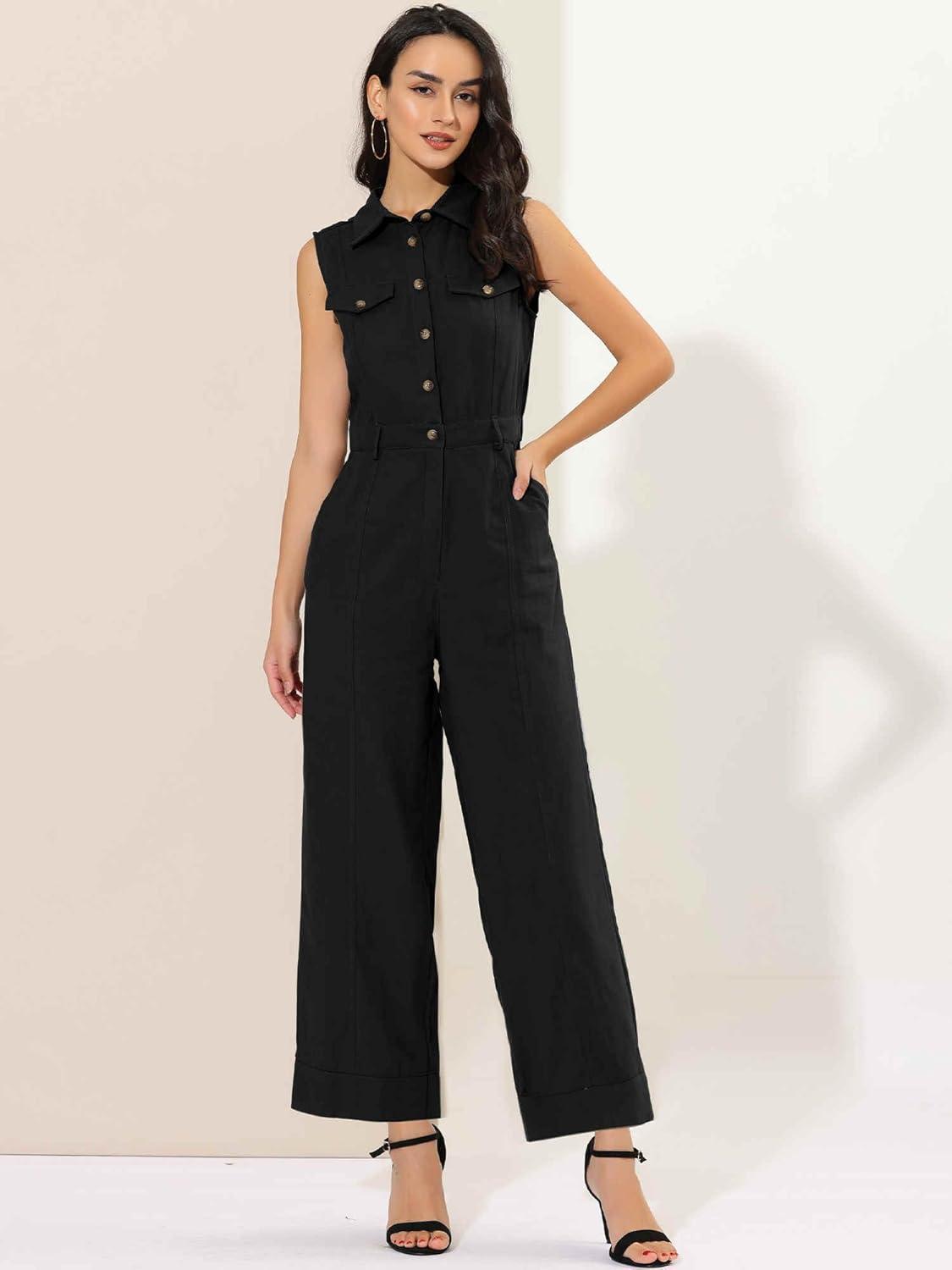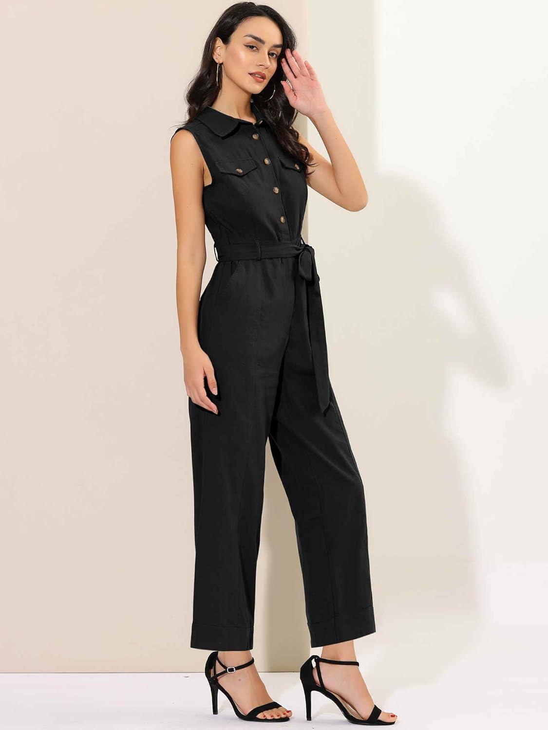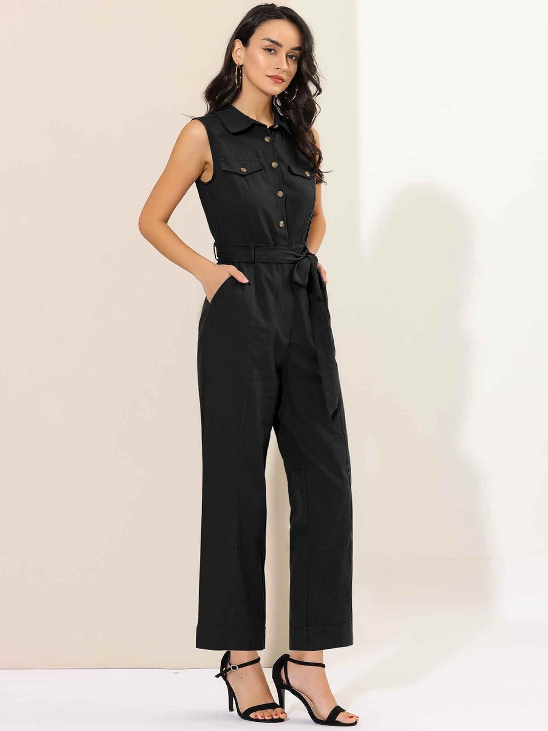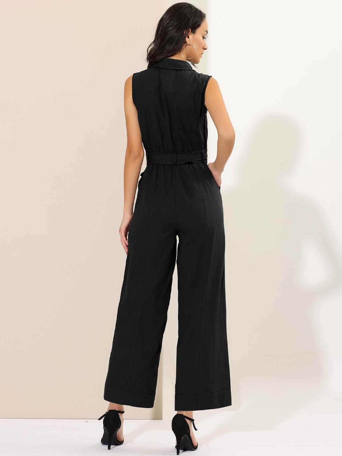 Allegra K Women’s Wide Leg Jumpsuit 2026 Sleeveless Collared Tie Waist Coverall Button Down Cargo Jumpsuits(Black)