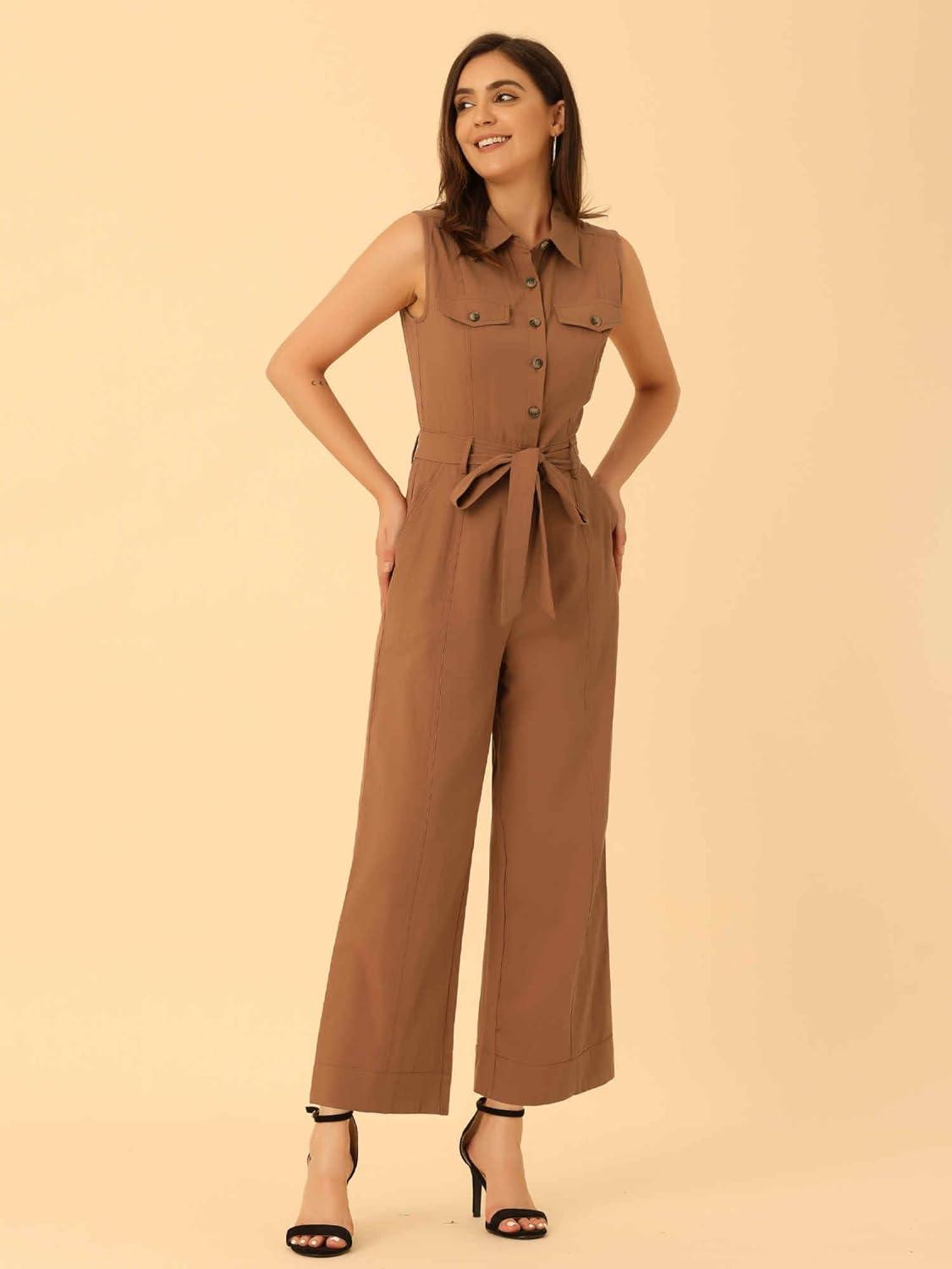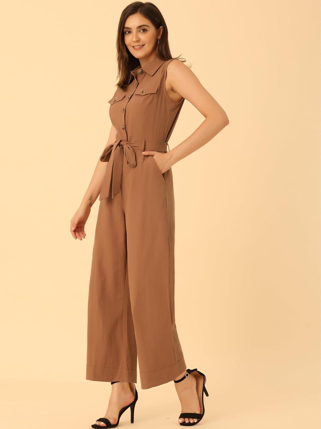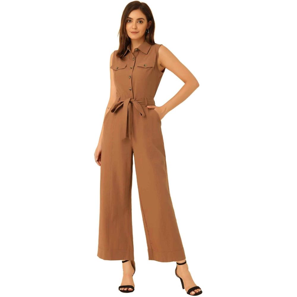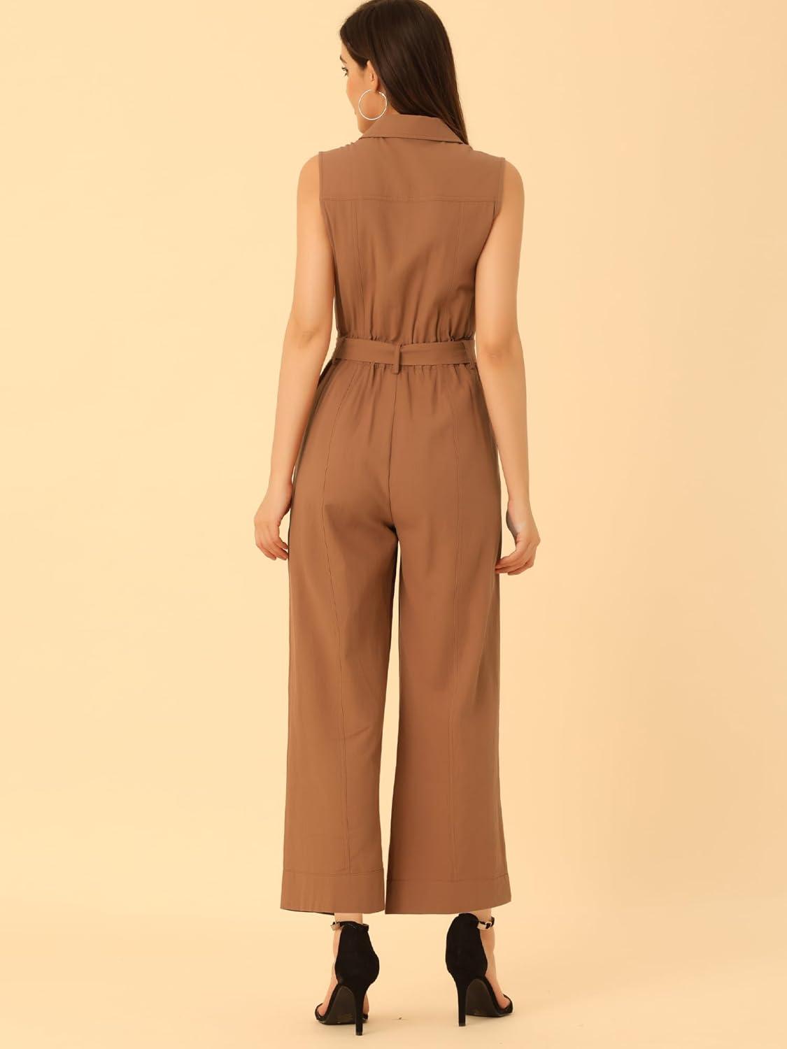 imageAllegra K Womens Wide Leg Jumpsuit 2026 Sleeveless Collared Tie Waist Coverall Button Down Cargo JumpsuitsBrown