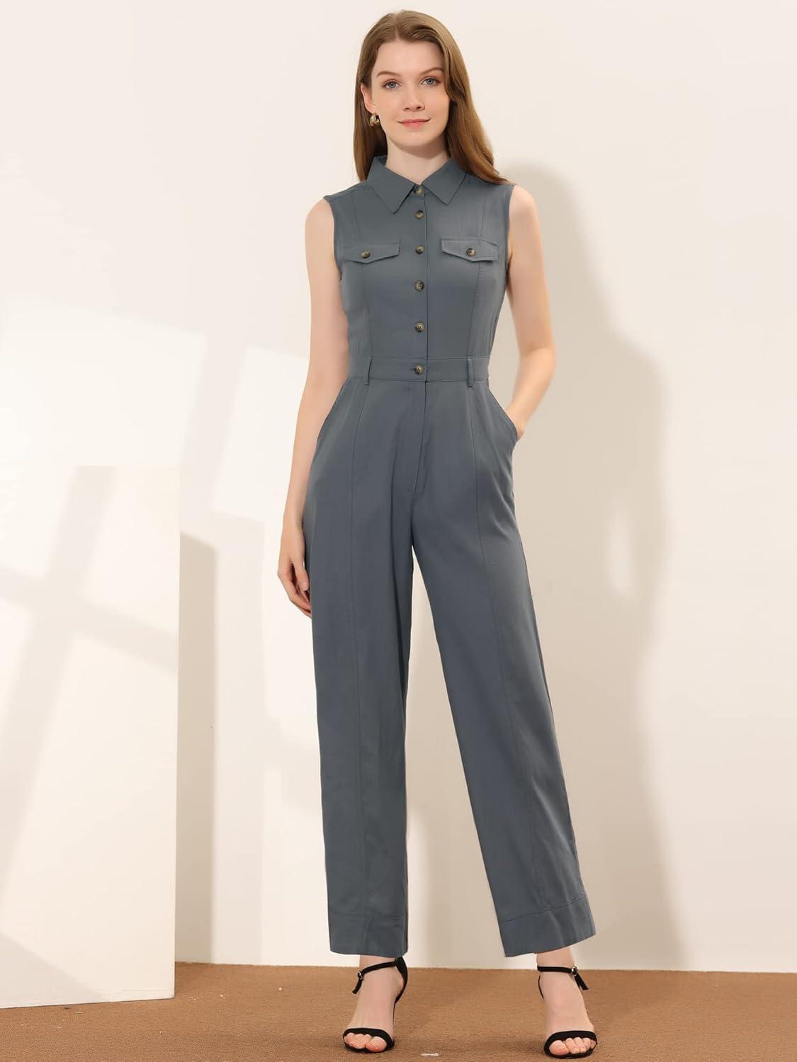 Allegra K Women’s Wide Leg Jumpsuit 2026 Sleeveless Collared Tie Waist Coverall Button Down Cargo Jumpsuits(Grey)
