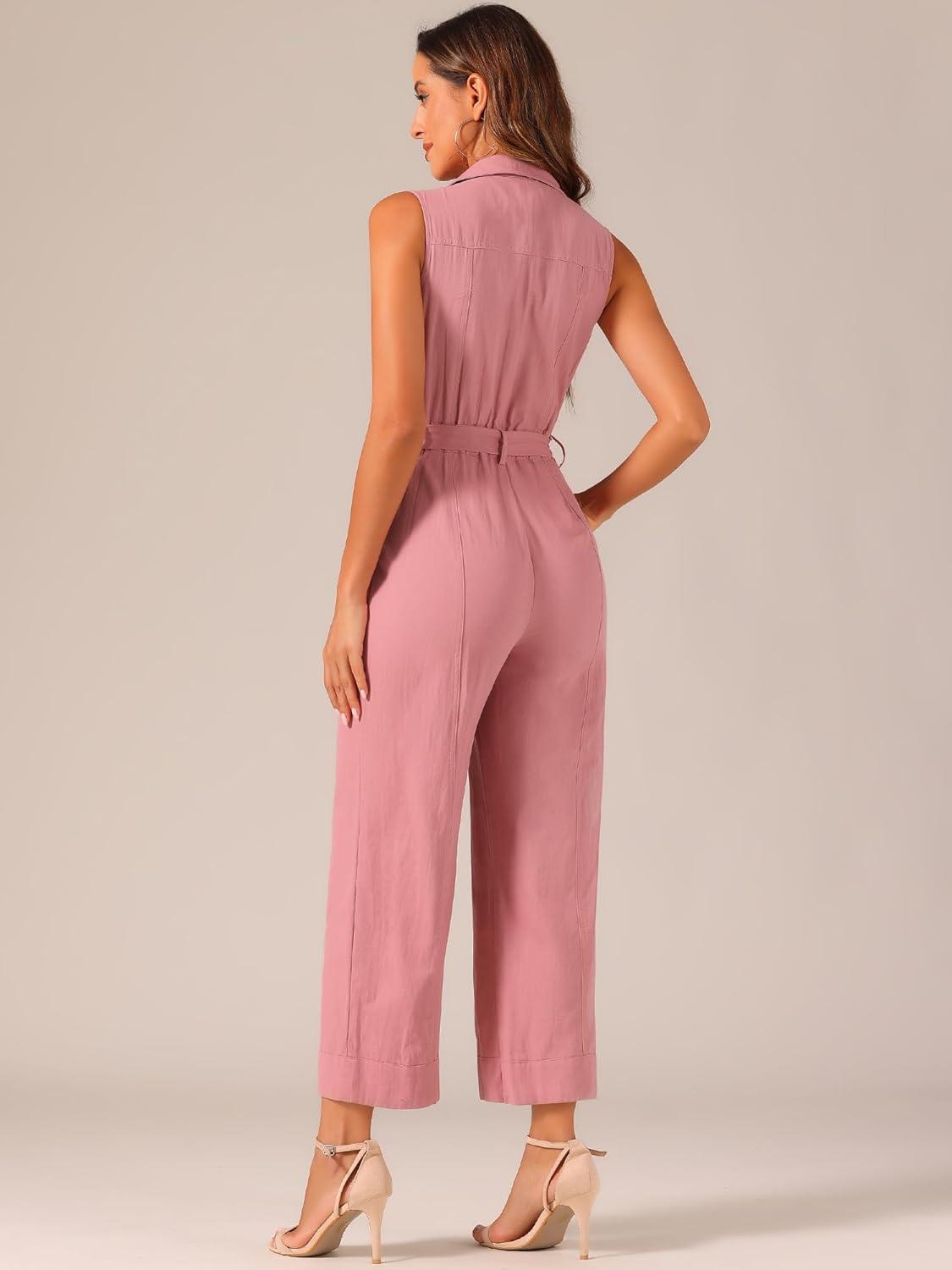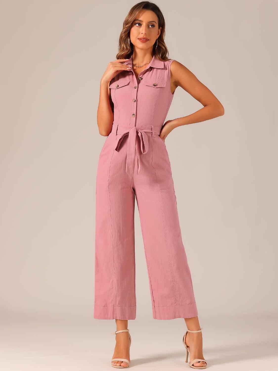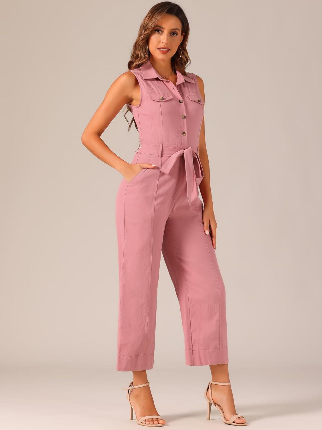 Allegra K Women's Wide Leg Jumpsuit 2026 Sleeveless Collared Tie Waist Coverall Button Down Cargo Jumpsuits(Pink)