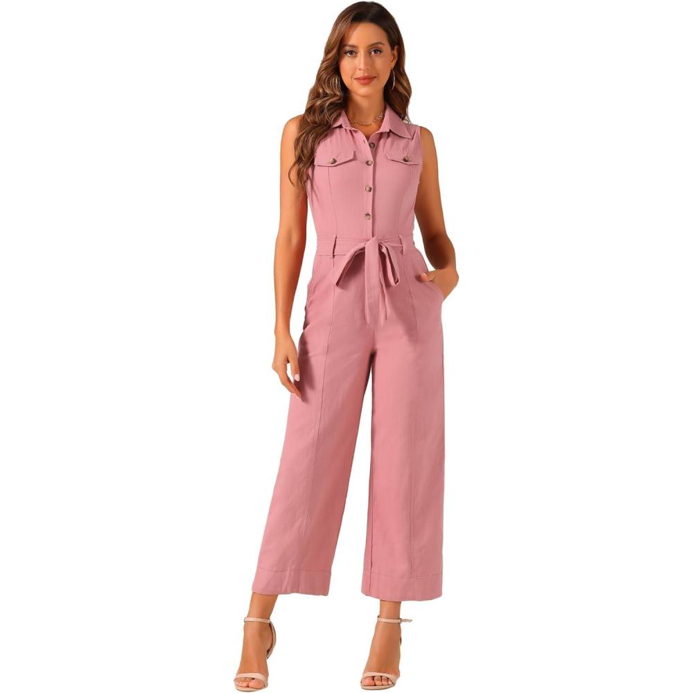 Allegra K Women’s Wide Leg Jumpsuit 2026 Sleeveless Collared Tie Waist Coverall Button Down Cargo Jumpsuits(Pink)