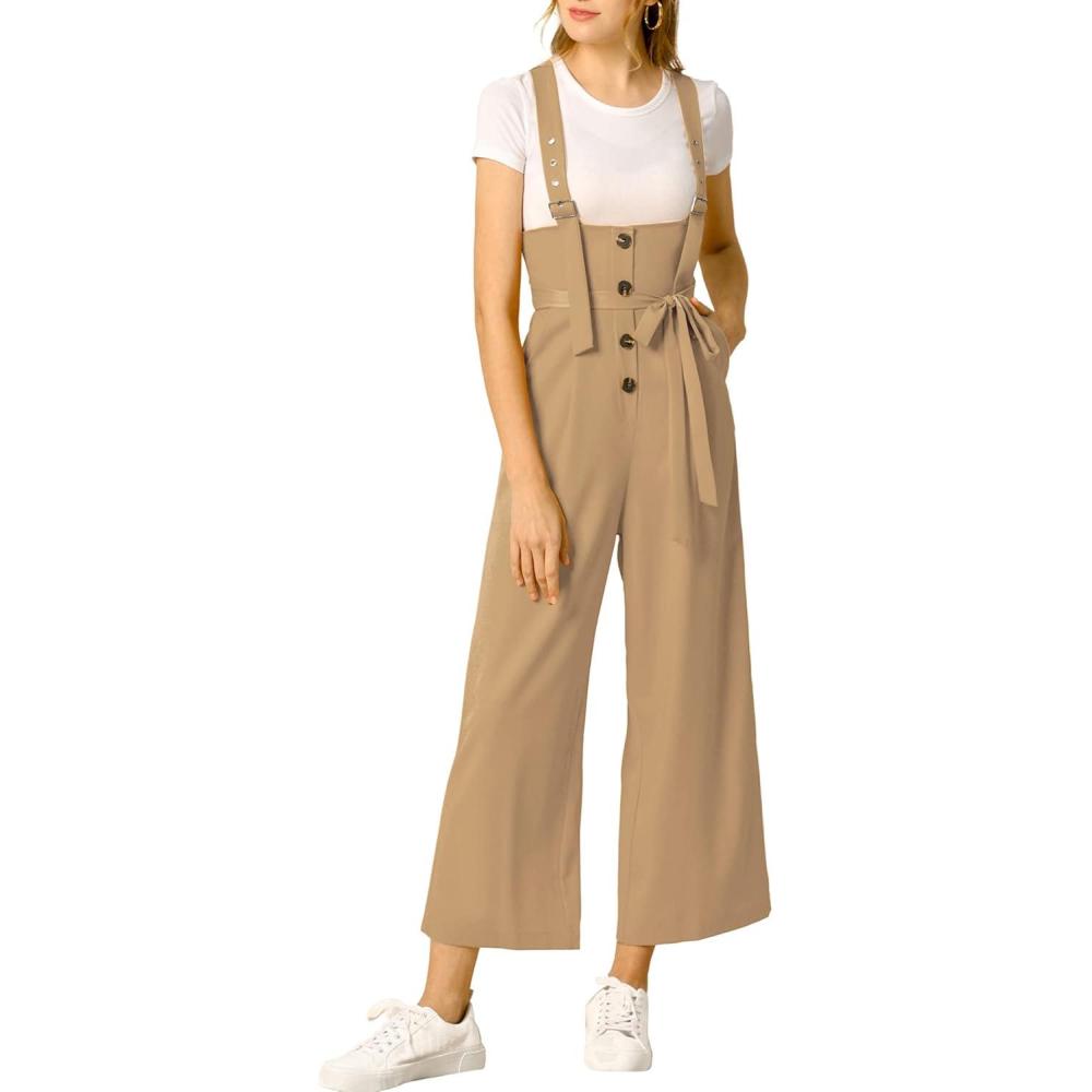 imageAllegra K Womens Wide Leg Overalls Loose Fit Belted High Waist Suspenders JumpsuitsKhaki