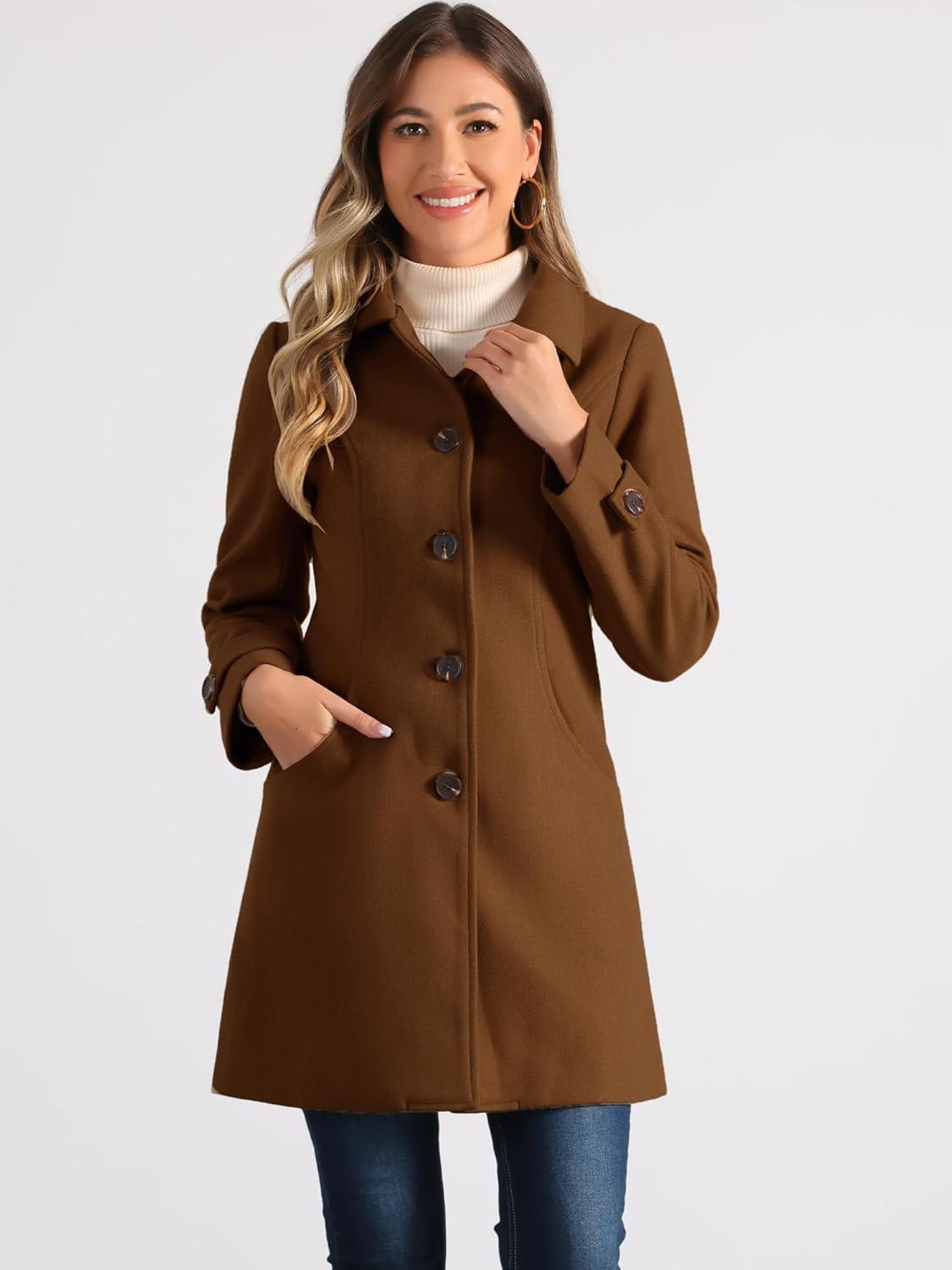 Allegra K Women’s Winter Outerwear Overcoat Peter Pan Collar Mid-thigh A-line Single Breasted Pea Coat(Dark Brown)