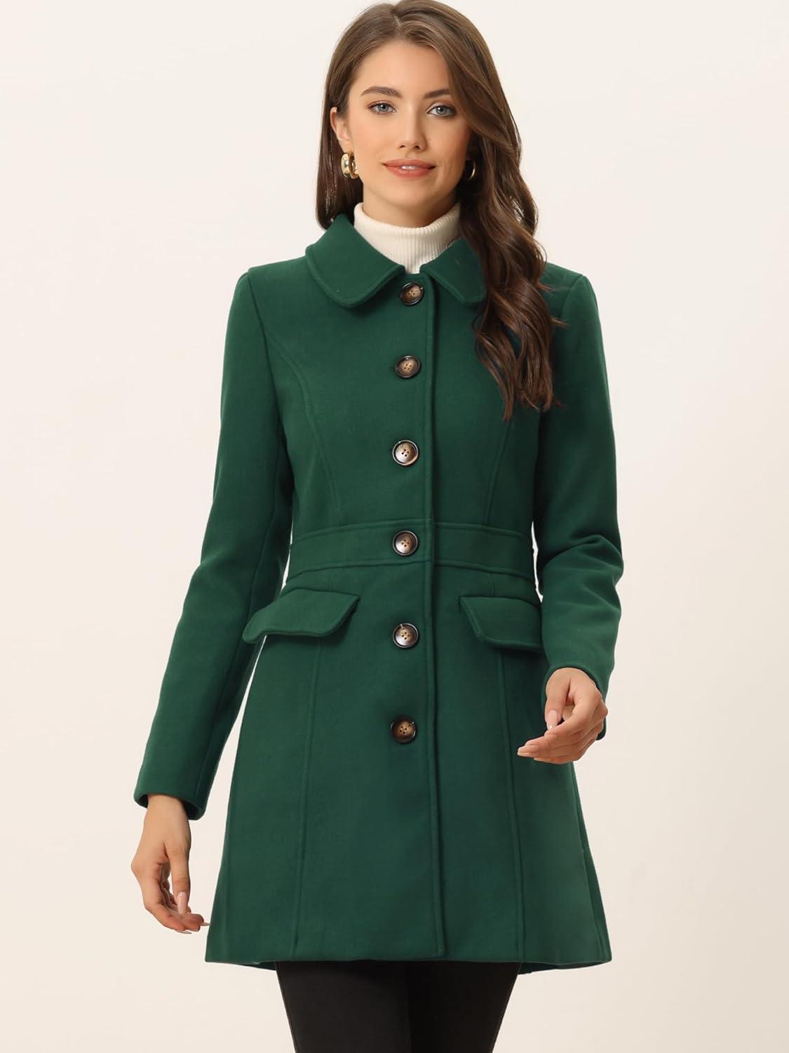 Allegra K Women’s Winter Overcoat Peter Pan Collar Flap Pocket Single Breasted Coat(Dark Green)