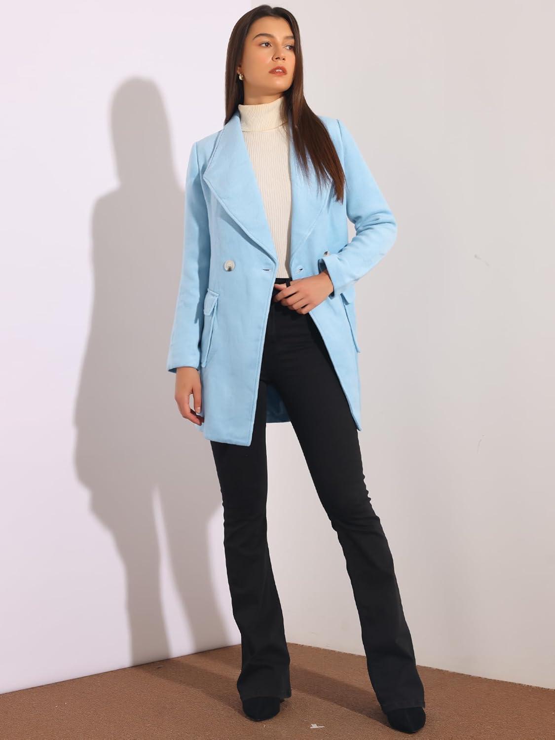 Allegra K Women's Winter Wrap Coat Turndwon Collar Long Sleeve Tie Belt Coat with Pockets(Blue)