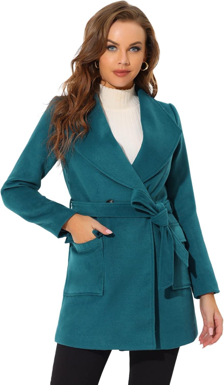 imageAllegra K Womens Winter Wrap Coat Turndwon Collar Long Sleeve Tie Belt Coat with PocketsPeacock Blue