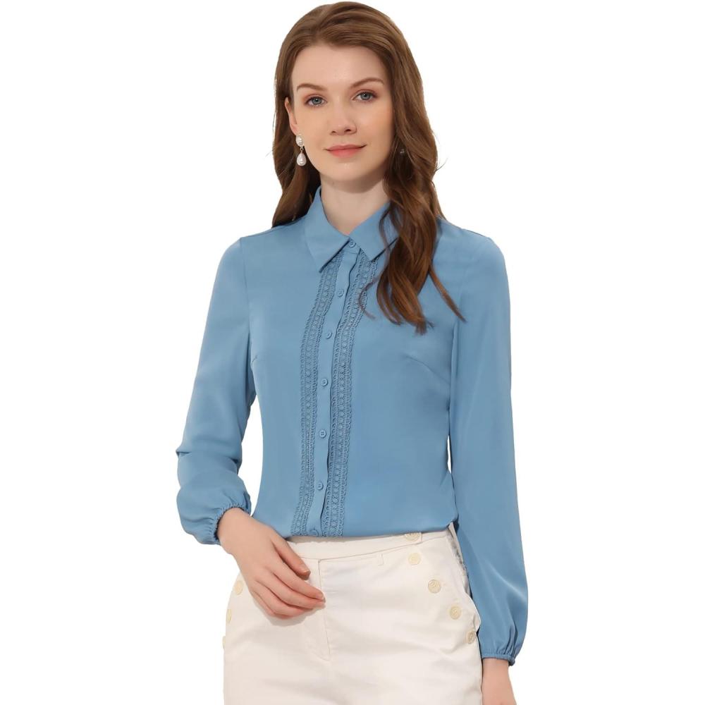 Allegra K Women’s Work Button Down Shirt Lace Trim Business Casual Long Sleeve Blouse Top(Gray Blue)