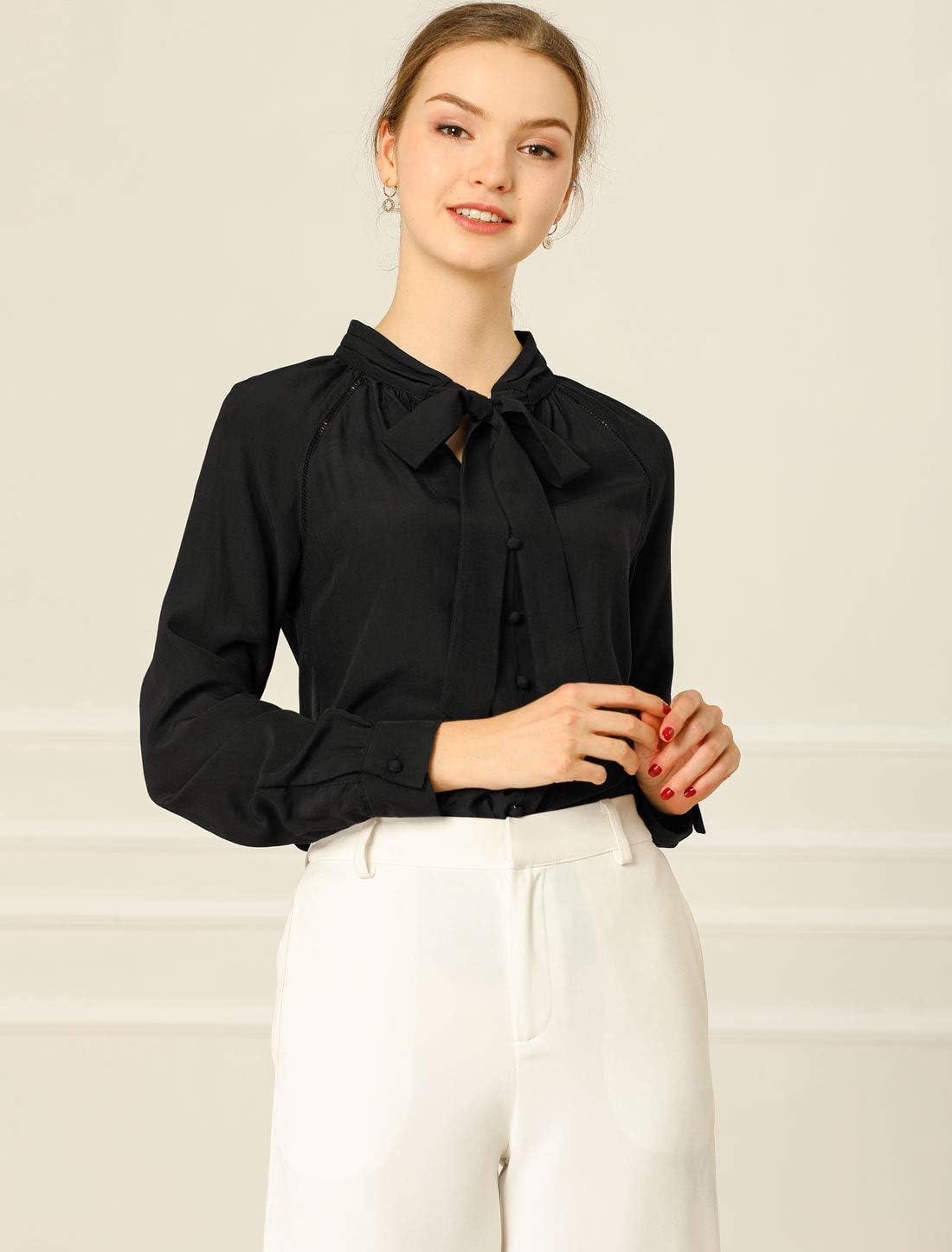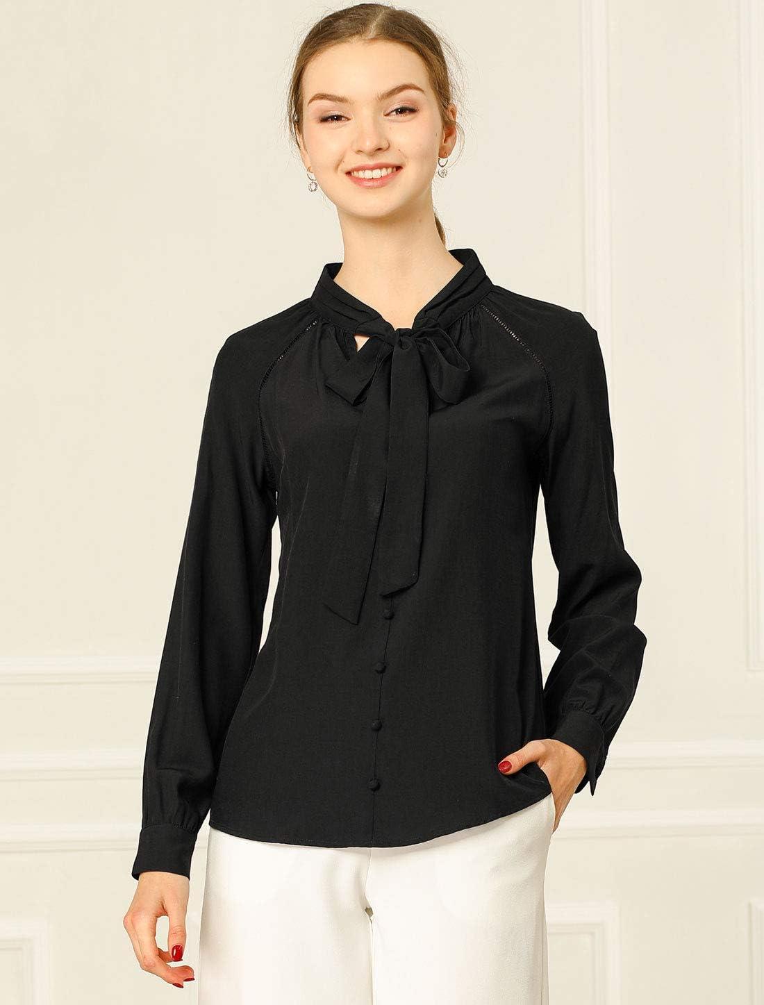 Allegra K Women's Work Office Tops Bow Tie Neck Button Decor Casual 2024 Spring Long Sleeve Shirt Blouses(Black)