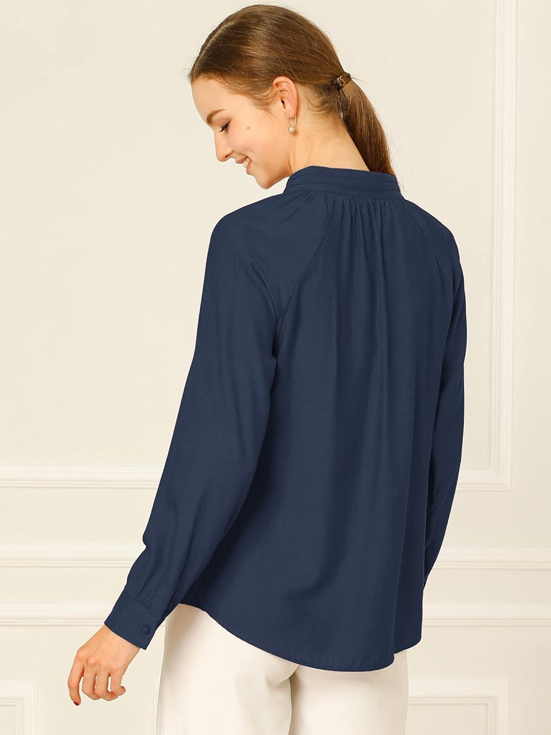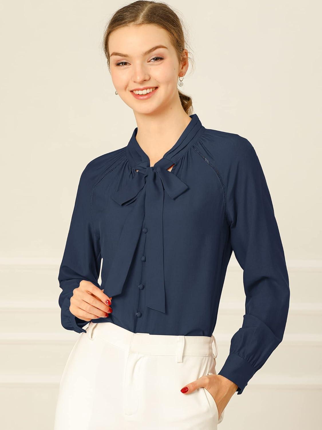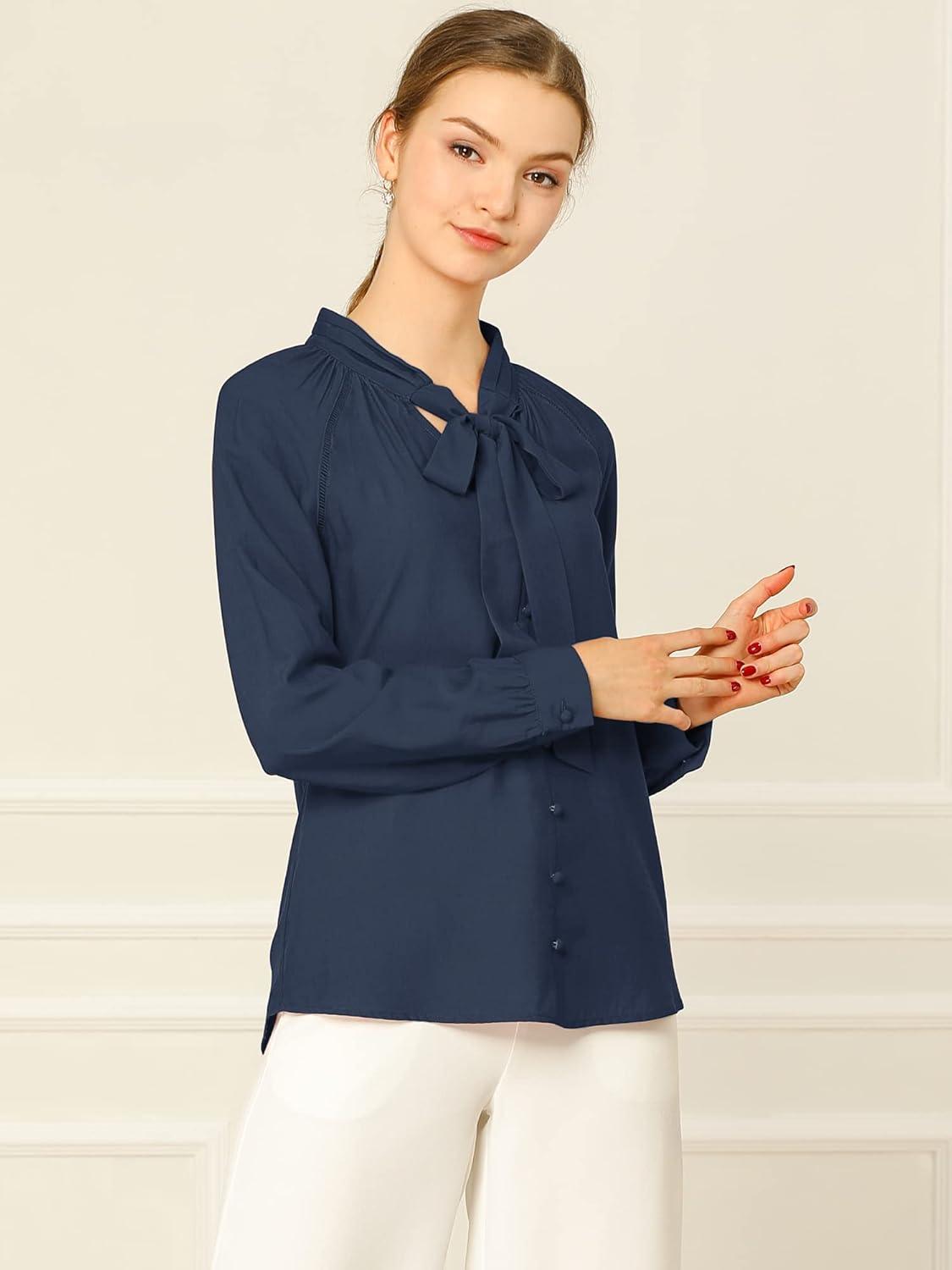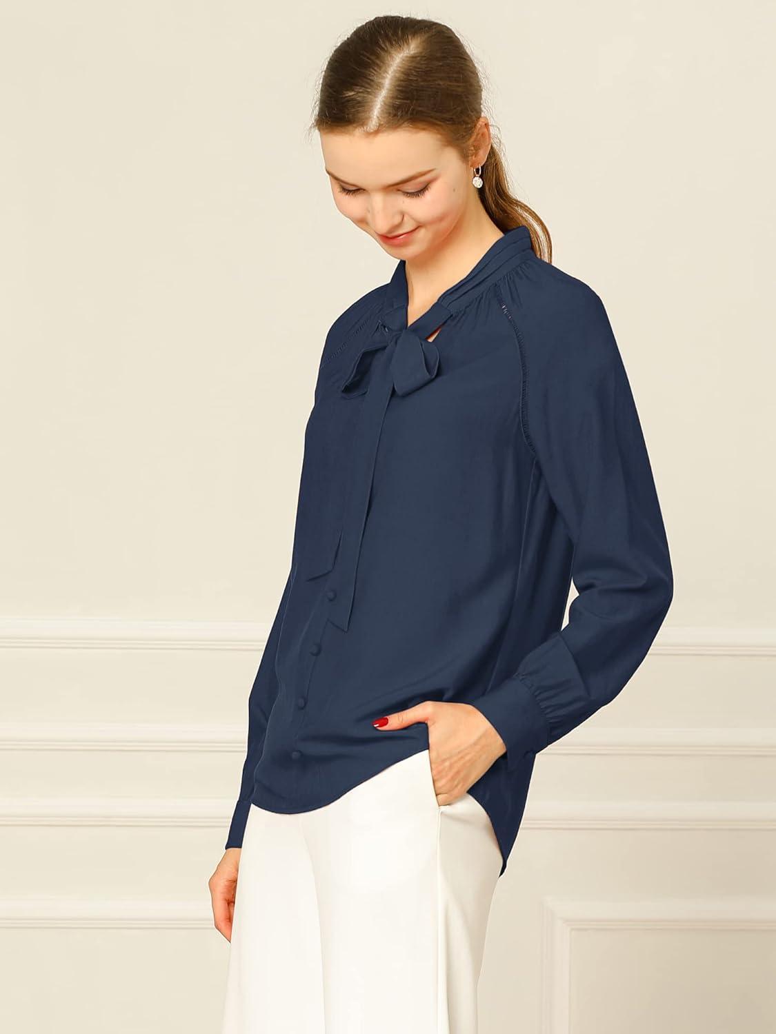Allegra K Women's Work Office Tops Bow Tie Neck Button Decor Casual 2024 Spring Long Sleeve Shirt Blouses(Deep Blue)