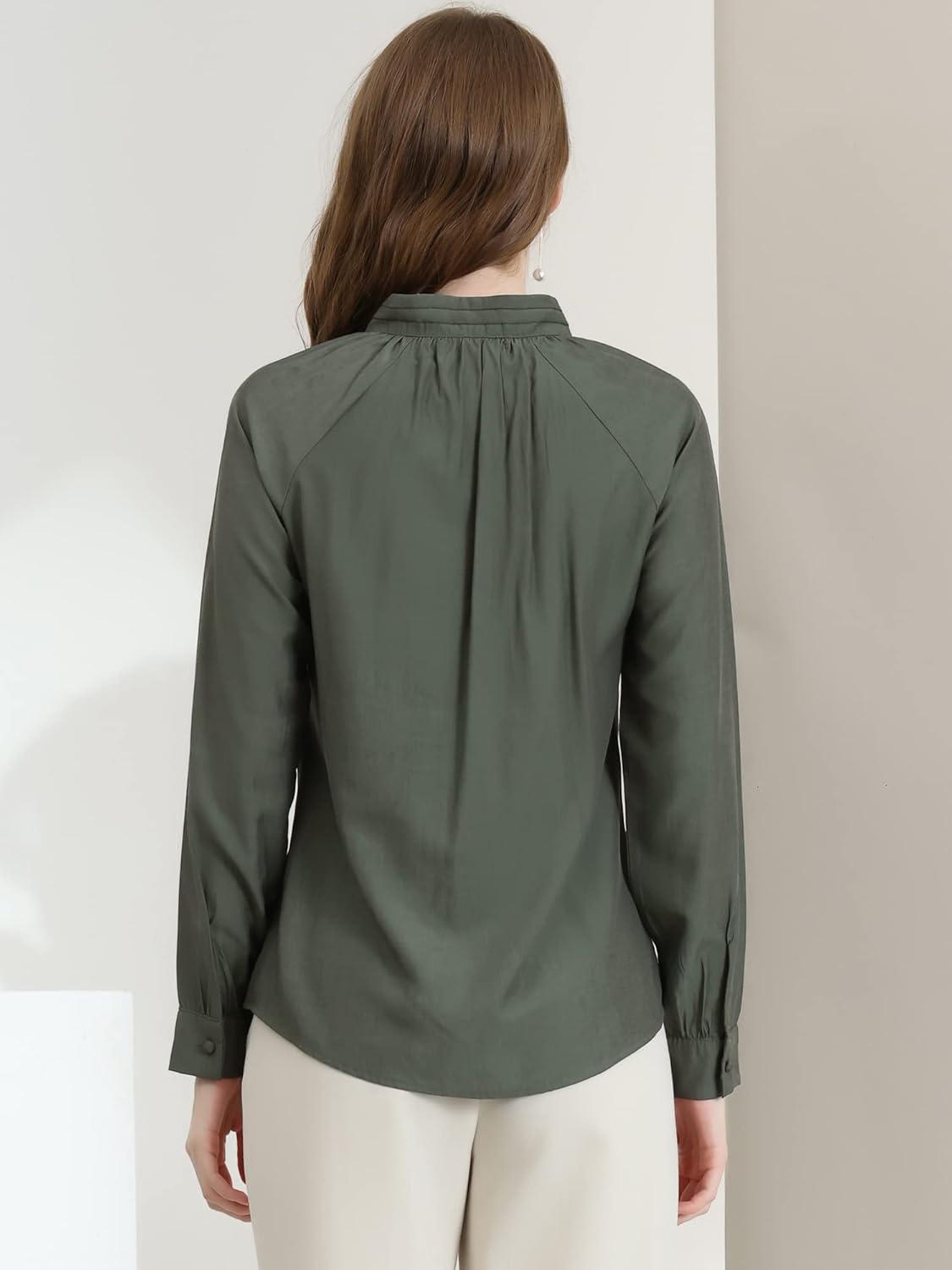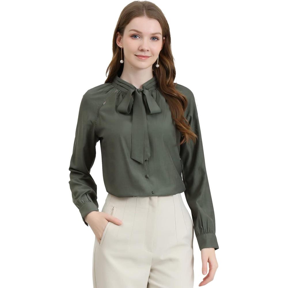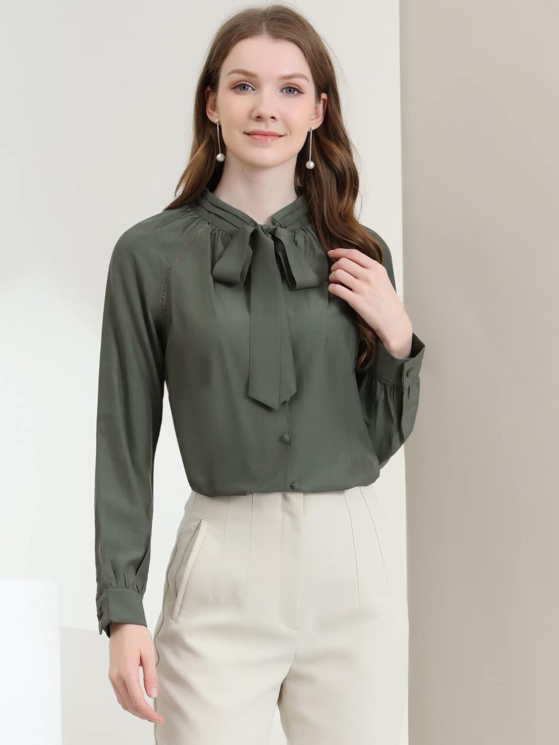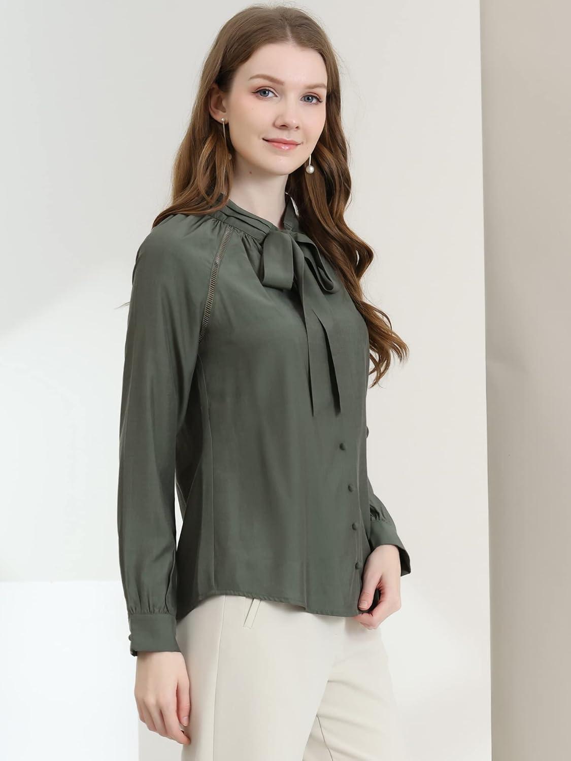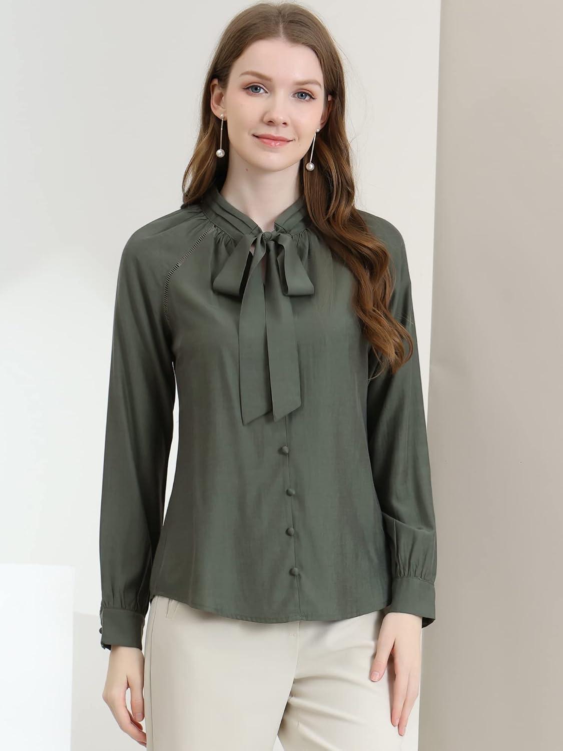 Allegra K Women's Work Office Tops Bow Tie Neck Button Decor Casual 2024 Spring Long Sleeve Shirt Blouses(Grey Green)